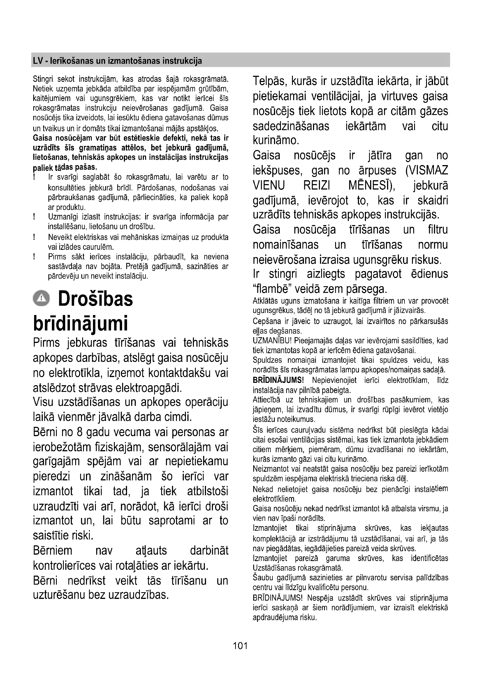 - Anglies filtras nėra nusidėvėjęs. Priežiūra Valymas Valymui naudokite TIK šluostę, suvilgytą skystu neutraliu valikliu. NENAUDOKITE VALYMO REIKMENŲ AR INSTRUMENTŲ! Nenaudokite abrazyvinių valymo priemonių. NENAUDOKITE SPIRITO! Nuo riebalų saugantis filtras Sulaiko kepamų riebalų daleles. Turi būti valomas vieną kartą per mėnesį švelniais valikliais, rankiniu būdu ar indaplovėje atitinkamoje temperatūroje ir trumpuoju ciklu. Plaunant metalinį nuo riebalų saugantį filtrą indaplovėje, jis gali prarasti spalvą, bet jo filtravimo savybės išliks nepakitusios Anglies filtras (tik filtravimo režimu) Naikina nemalonius kvapus, atsirandančius maisto gaminimo metu. Anglies filtras prisipildo naudojant jį ilgą laiką, priklausomai nuo virtuvės tipo ir riebalų filtro valymo reguliarumo. Bet kokiu atveju, kapsulę reikia keisti mažiausiai kas keturis mėnesius. NEGALIMA plauti ar regeneruoti. Lempų keitimas Išjunkite prietaisą iš elektros tinklo. Dėmesio! Prieš liesdami lempas, įsitikinkite, kad jos atvėsusios. Pakeiskite sugedusią lemputę nauja tokios pačios arba panašios rūšies lempute, vadovaudamiesi savybių duomenimis, pateiktais etiketėje ant lemputės arba ant gaubto šalia lemputės. Norėdami pakeisti lempas kvadrato formos gaubtuose, paspauskite gaubto rėmą toje vietoje, kurioje parašyta “PUSH”, pakeiskite lempas ir uždarykite gaubtą, vėl paspausdami rėmą, kol gaubtas užsidarys. Naudokite tik halogenines 12V -20W (daugiausia) lempas G4, saugokitės, kad nepaliestumėte jų rankomis. Jei apšvietimas neveiks, prieš kviesdami techninę pagalbą, patikrinkite, ar lempas įstatėte teisinga pozicija.101 LV - Ierīkošanas un izmantošanas instrukcija Stingri sekot instrukcijām, kas atrodas šajā rokasgrāmatā. Netiek uzņemta jebkāda atbildība par iespējamām grūtībām, kaitējumiem vai ugunsgrēkiem, kas var notikt ierīcei šīs rokasgrāmatas instrukciju neievērošanas gadījumā. Gaisa nosūcējs tika izveidots, lai iesūktu ēdiena gatavošanas dūmus un tvaikus un ir domāts tikai izmantošanai mājās apstākļos. Gaisa nosūcējam var būt estētieskie defekti, nekā tas ir uzrādīts šīs gramatiņas attēlos, bet jebkurā gadījumā, lietošanas, tehniskās apkopes un instalācijas instrukcijas paliek tā das pašas. ! Ir svarīgi saglabāt šo rokasgrāmatu, lai varētu ar to konsultēties jebkurā brīdī. Pārdošanas, nodošanas vai pārbraukšanas gadījumā, pārliecināties, ka paliek kopā ar produktu. ! Uzmanīgi izlasīt instrukcijas: ir svarīga informācija par installēšanu, lietošanu un drošību. ! Neveikt elektriskas vai mehāniskas izmaiņas uz produkta vai izlādes caurulēm. ! Pirms sākt ierīces instalāciju, pārbaudīt, ka neviena sastāvdaļa nav bojāta. Pretējā gadījumā, sazināties ar pārdevēju un neveikt instalāciju. Drošības brīdinājumi Pirms jebkuras tīrīšanas vai tehniskās apkopes darbības, atslēgt gaisa nosūcēju no elektrotīkla, izņemot kontaktdakšu vai atslēdzot strāvas elektroapgādi. Visu uzstādīšanas un apkopes operāciju laikā vienmēr jāvalkā darba cimdi. Bērni no 8 gadu vecuma vai personas ar ierobežotām fiziskajām, sensorālajām vai garīgajām spējām vai ar nepietiekamu pieredzi un zināšanām šo ierīci var izmantot tikai tad, ja tiek atbilstoši uzraudzīti vai arī, norādot, kā ierīci droši izmantot un, lai būtu saprotami ar to saistītie riski. Bērniem nav atļauts darbināt kontrolierīces vai rotaļāties ar iekārtu. Bērni nedrīkst veikt tās tīrīšanu un uzturēšanu bez uzraudzības. Telpās, kurās ir uzstādīta iekārta, ir jābūt pietiekamai ventilācijai, ja virtuves gaisa nosūcējs tiek lietots kopā ar citām gāzes sadedzināšanas iekārtām vai citu kurināmo. Gaisa nosūcējs ir jātīra gan no iekšpuses, gan no ārpuses (VISMAZ VIENU REIZI MĒNESĪ), jebkurā gadījumā, ievērojot to, kas ir skaidri uzrādīts tehniskās apkopes instrukcijās. Gaisa nosūcēja tīrīšanas un filtru nomainīšanas un tīrīšanas normu neievērošana izraisa ugunsgrēku riskus. Ir stingri aizliegts pagatavot ēdienus “flambē” veidā zem pārsega. Atklātās uguns izmatošana ir kaitīga filtriem un var provocēt ugunsgrēkus, tādēļ no tā jebkurā gadījumā ir jāizvairās. Cepšana ir jāveic to uzraugot, lai izvairītos no pārkarsušās eļļas degšanas. UZMANĪBU! Pieejamajās daļas var ievērojami sasildīties, kad tiek izmantotas kopā ar ierīcēm ēdiena gatavošanai. Spuldzes nomaiņai izmantojiet tikai spuldzes veidu, kas norādīts šīs rokasgrāmatas lampu apkopes/nomaiņas sadaļā. BRĪDINĀJUMS! Nepievienojiet ierīci elektrotīklam, līdz instalācija nav pilnībā pabeigta. Attiecībā uz tehniskajiem un drošī bas pasākumiem, kas jāpieņem, lai izvadītu dūmus, ir svarīgi rūpīgi ievērot vietējo iestāžu noteikumus. Šīs ierīces cauruļvadu sistēma nedrīkst būt pieslēgta kādai citai esošai ventilācijas sistēmai, kas tiek izmantota jebkādiem citiem mērķiem, piemēram, dūmu izvadīšanai no iekārtām, kurās izmanto gāzi vai citu kurināmo. Neizmantot vai neatstāt gaisa nosūcēju bez pareizi ierīkotām spuldzēm iespējama elektriskā trieciena riska dēļ. Nekad nelietojiet gaisa nosūcēju bez pienācīgi instalē tiem elektrotīkliem. Gaisa nosūcēju nekad nedrīkst izmantot kā atbalsta virsmu, ja vien nav īpaši norādīts. Izmantojiet tikai stiprinājuma skrūves, kas iekļautas komplektācijā ar izstrādājumu tā uzstādīšanai, vai arī, ja tās nav piegādātas, iegādājieties pareizā veida skrūves. Izmantojiet pareizā garuma skrūves, kas identificētas Uzstādīšanas rokasgrāmatā. Šaubu gadījumā sazinieties ar pilnvarotu servisa palīdzības centru vai līdzīgu kvalificētu personu. BRĪDINĀJUMS! Nespēja uzstādī t skrūves vai stiprinājuma ierīci saskaņā ar šiem norādījumiem, var izraisīt elektriskā apdraudējuma 