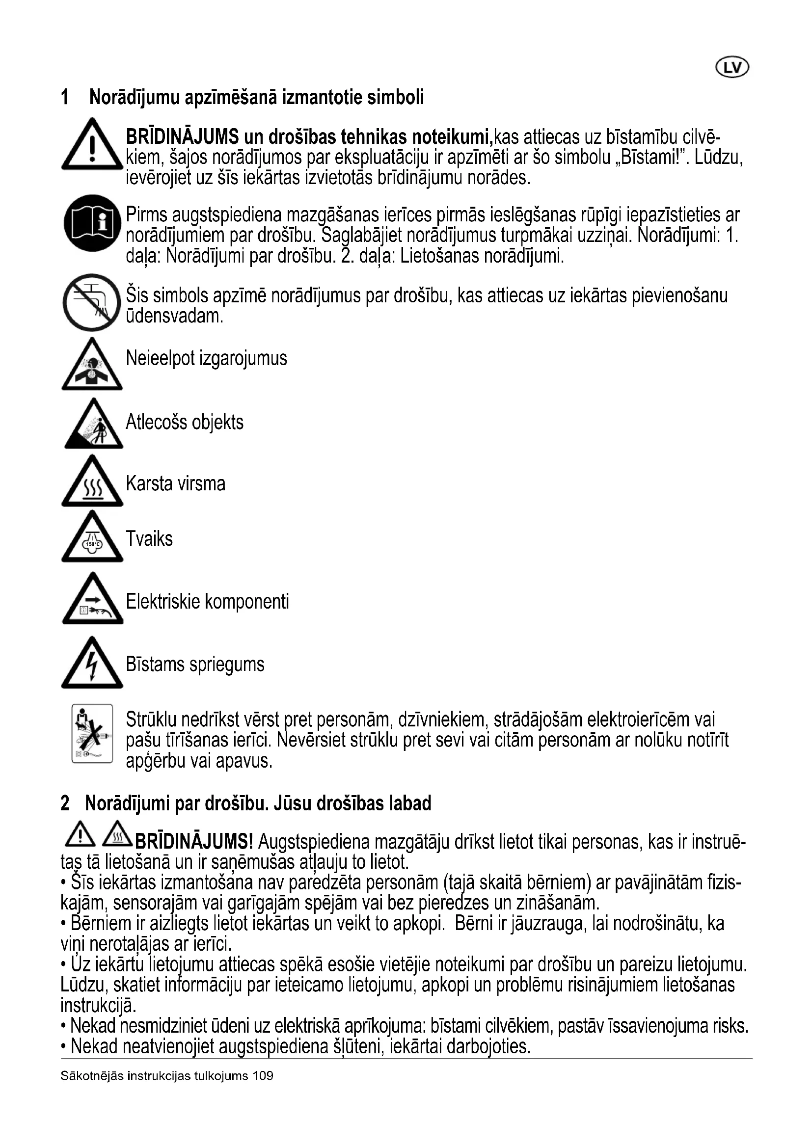 - Kui toitejuhe on kahjustatud, peab võimalike ohtude ennetamiseks vahetuse teostama tootja, tootja poolt volitatud müügiesindus või sarnase kvalifikatsiooniga isik.Sākotnējās instrukcijas tulkojums 109 1 Norādījumu apzīmēšanā izmantotie simboli BRĪDINĀJUMS un drošības tehnikas noteikumi,kas attiecas uz bīstamību cilvē- kiem, šajos norādījumos par ekspluatāciju ir apzīmēti ar šo simbolu „Bīstami!”. Lūdzu, ievērojiet uz šīs iekārtas izvietotās brīdinājumu norādes. Pirms augstspiediena mazgāšanas ierīces pirmās ieslēgšanas rūpīgi iepazīstieties ar norādījumiem par drošību. Saglabājiet norādījumus turpmākai uzziņai. Norādījumi: 1. daļa: Norādījumi par drošību. 2. daļ a: Lietošanas norādījumi. Šis simbols apzīmē norādījumus par drošību, kas attiecas uz iekārtas pievienošanu ūdensvadam. Neieelpot izgarojumus Atlecošs objekts Karsta virsma Tvaiks Elektriskie komponenti Bīstams spriegums Strūklu nedrīkst vērst pret personām, dzīvniekiem, strādājošām elektroierīcēm vai pašu tīrīšanas ierīci. Nevērsiet strūklu pret sevi vai citām personām ar nolūku notīrīt apģērbu vai apavus. 2 Norādījumi par drošību. Jūsu drošības labad BRĪDINĀJUMS! Augstspiediena mazgātāju drīkst lietot tikai personas, kas ir instruē- tas tā lietošanā un ir saņēmušas atļauju to lietot.