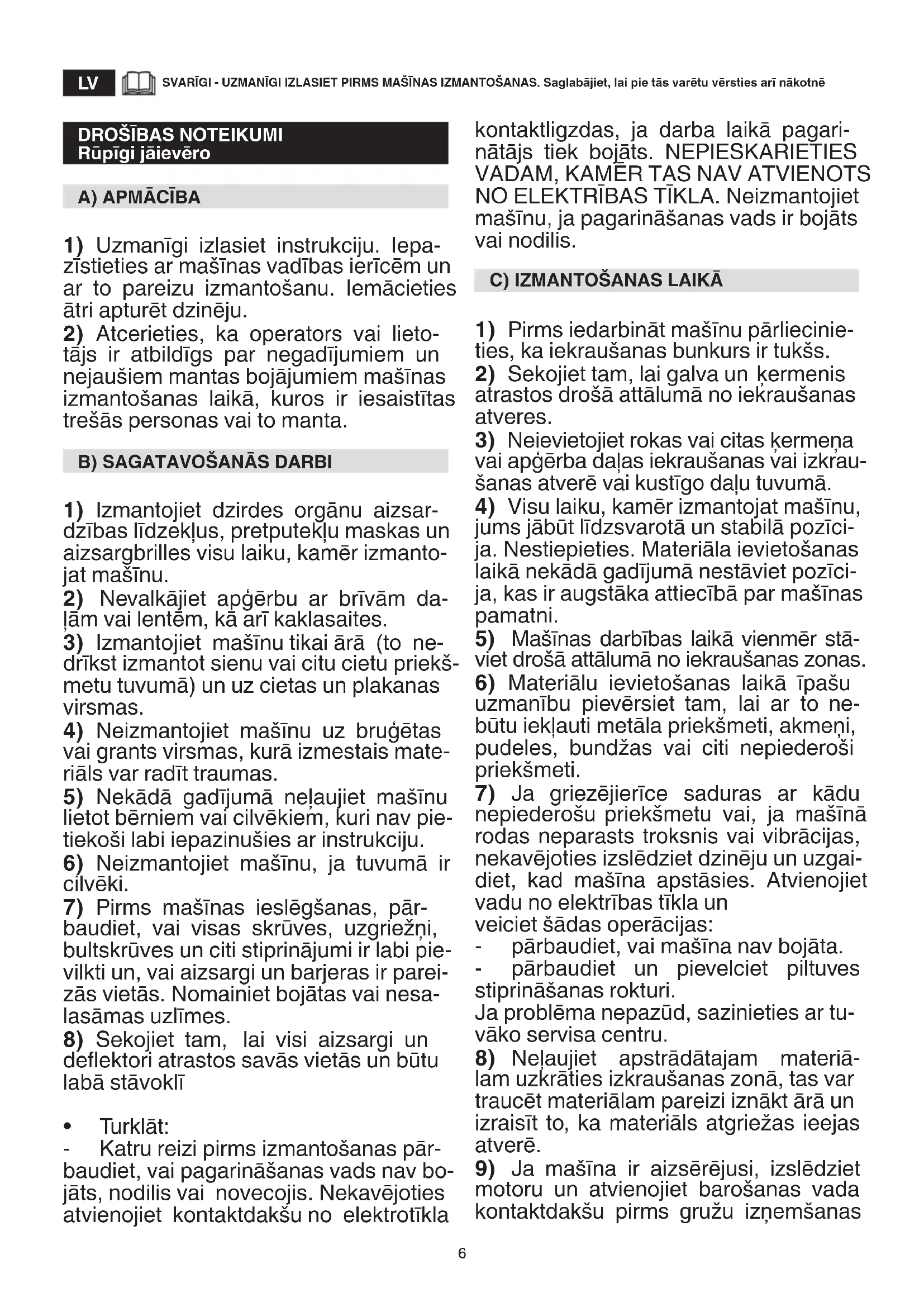 - Kā arī: - Neizmantojiet mašīnu, ja slēdzis ir bojāts un ar to nevar pareizi ieslēgt vai izslēgt mašīnu. - Nepieskarieties pagarināšanas va- dam un kontaktrozetei ar slapjām rokām. - Neuzkāpiet un nevelciet pagarināša- nas vadu. - Apturiet mašīnu un atvienojiet baro- šanas vadu: - vienmēr, kad mašīna tiek atstāta bez uzraudzības; - pirms aizsprostojuma novēršanas vai aizsērējuma likvidēšanas izejas kanālā; UZMANĪBU - Ja darba laikā rodas bo- jājumi vai negadījumi, nekavējoties ap- turiet motoru; operatora vai citu personu savainošanās gadījumā nekavējoties sniedziet situācijai atbilstošo pirmo pa- līdzību un vērsieties pie ārsta.