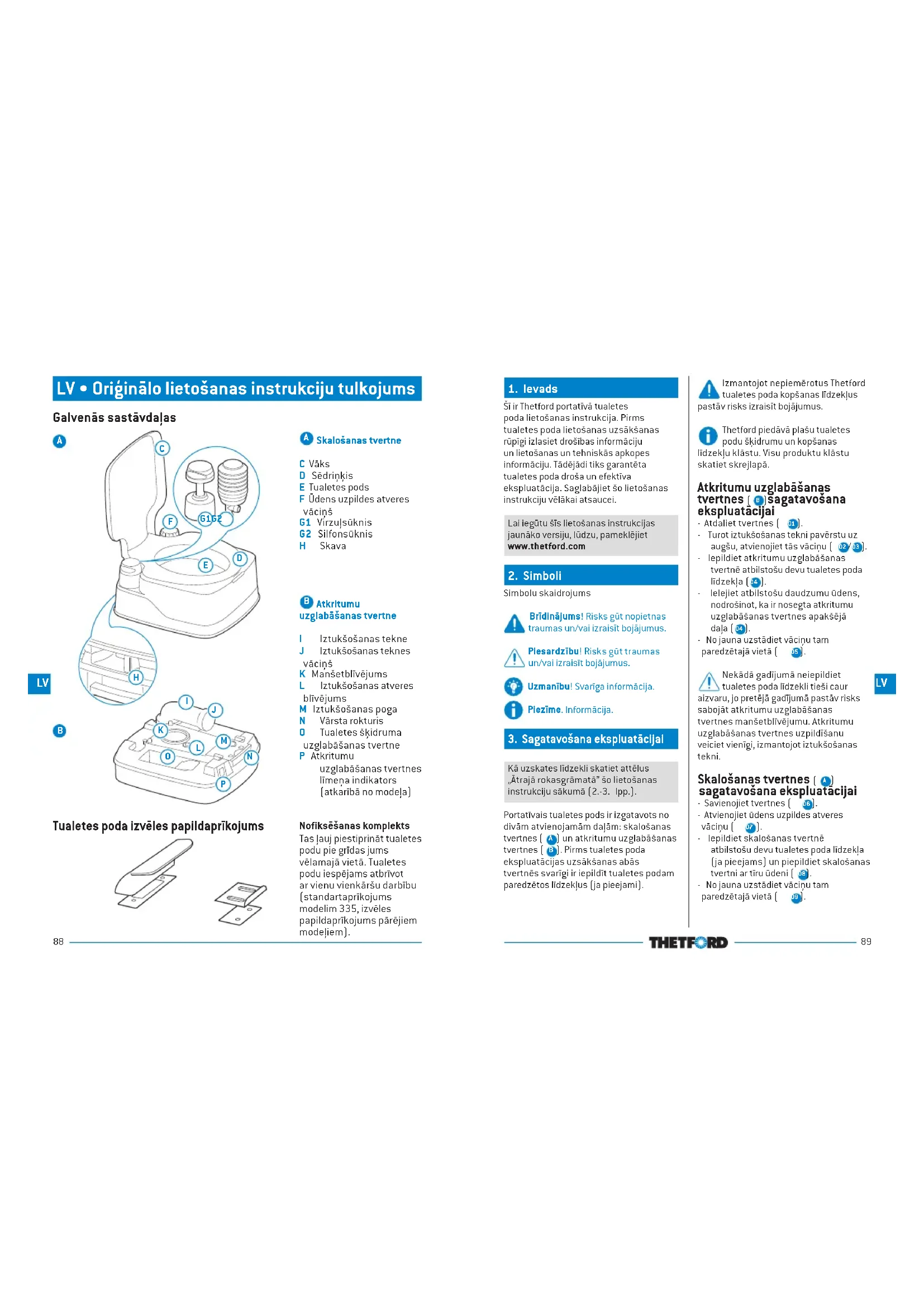 Šī ir Thetford portatīvā tualetes poda lietošanas instrukcija. Pirms tualetes poda lietošanas uzsākšanas rūpīgi izlasiet drošības informāciju un lietošanas un tehniskās apkopes informāciju. Tādējādi tiks garantēta tualetes poda droša un efektīva ekspluatācija. Saglabājiet šo lietošanas instrukciju vēlākai atsaucei.Lai iegūtu šīs lietošanas instrukcijas jaunāko versiju, lūdzu, pameklējiet www.thetford.com