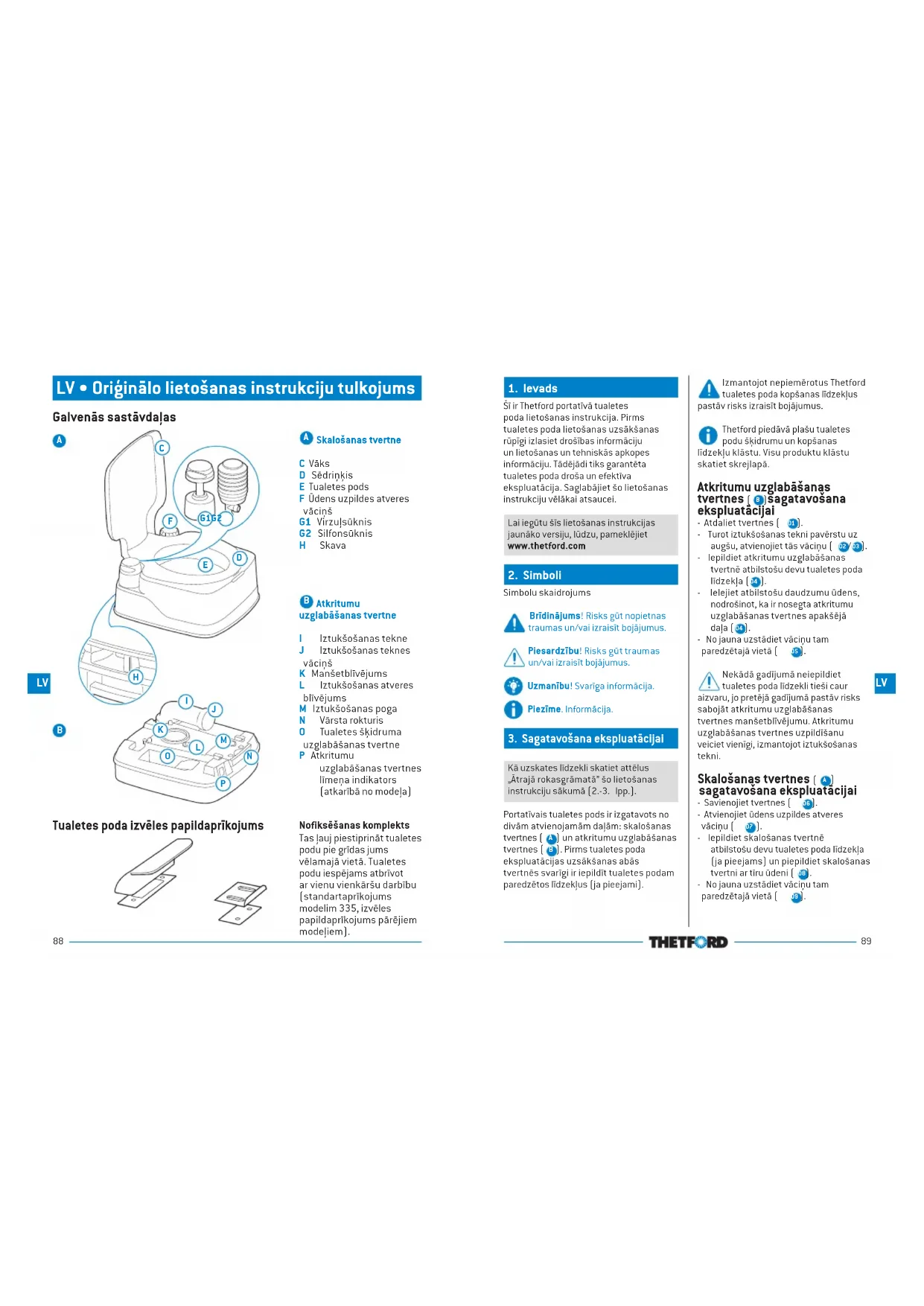 Šī ir Thetford portatīvā tualetes poda lietošanas instrukcija. Pirms tualetes poda lietošanas uzsākšanas rūpīgi izlasiet drošības informāciju un lietošanas un tehniskās apkopes informāciju. Tādējādi tiks garantēta tualetes poda droša un efektīva ekspluatācija. Saglabājiet šo lietošanas instrukciju vēlākai atsaucei.Lai iegūtu šīs lietošanas instrukcijas jaunāko versiju, lūdzu, pameklējiet www.thetford.com