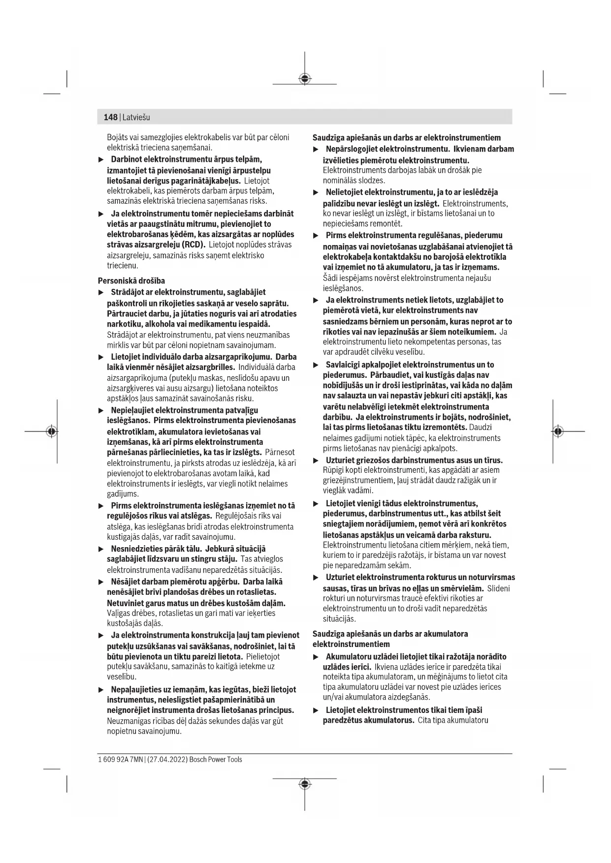 Klienditeenindus ja kasutusalane nõustamine Klienditeeninduse töötajad vastavad teie küsimustele teie toote remondi ja hoolduse ning varuosade kohta. Joonised ja info varuosade kohta leiate ka veebisaidilt: www.bosch-pt.com Boschi nõustajad on meeleldi abiks, kui teil on küsimusi toodete ja lisatarvikute kasutamise kohta. Päringute esitamisel ja varuosade tellimisel teatage meile kindlasti toote tüübisildil olev 10‑kohaline tootenumber. Eesti Vabariik Teeninduskeskus Tel.: (+372) 6549 575 Faks: (+372) 6549 576 E-posti: service-pt@lv.bosch.com Muud teeninduse aadressid leiate jaotisest: www.bosch-pt.com/serviceaddresses Kasutuskõlbmatuks muutunud seadmete käitlus Elektriseadmed, lisatarvikud ja pakendid tuleks keskkonnasäästlikult ringlusse võtta. Ärge visake kasutusressursi ammendanud elektrilisi tööriistu olmejäätmete hulka! Üksnes ELliikmesriikidele: Vastavalt Euroopa Parlamendi ja nõukogu direktiivile 2012/19/EL elektri- ja elektroonikaseadmete jäätmete kohta ning direktiivi ülevõtvatele riiklikele õigusaktidele tuleb kasutuskõlbmatuks muutunud elektrilised tööriistad eraldi kokku koguda ja keskkonnasäästlikult korduskasutada või ringlusse võtta. Vale jäätmekäitluse korral võivad vanad elektri- ja elektroonikaseadmed, milles sisaldub kahjulikke aineid, kahjustada keskkonda ja inimeste tervist. Latviešu Drošības noteikumi Vispārēji drošības noteikumi elektroinstrumentiem BRĪDINĀ- JUMS Izlasiet visus drošības noteikumus un instrukcijas, aplūkojiet ilustrācijas un iepazīstieties ar specifikācijām, kas tiek piegādātas kopā ar šo elektroinstrumentu. Šeit sniegto drošības noteikumu un instrukciju neievērošana var izraisīt aizdegšanos un būt par cēloni elektriskajam triecienam vai nopietnam savainojumam. Pēc izlasīšanas uzglabājiet šos noteikumus turpmākai izmantošanai. Drošības noteikumos lietotais apzīmējums "elektroinstruments" attiecas gan uz Jūsu tīkla elektroinstrumentiem (ar elektrokabeli), gan arī uz akumulatora elektroinstrumentiem (bez elektrokabeļa). Drošība darba vietā u Uzturiet savu darba vietu tīru un labi apgaismotu. Nekārtīgās un tumšās vietās var viegli notikt nelaimes gadījums. u Nedarbiniet elektroinstrumentus sprādzienbīstamā atmosfērā, piemēram, viegli uzliesmojošu šķidrumu tuvumā un vietās ar paaugstinātu gāzu vai putekļu saturu gaisā. Darba laikā elektroinstruments nedaudz dzirksteļo, un tas var izsaukt viegli degošu putekļu vai tvaiku aizdegšanos. u Darbinot elektroinstrumentu, neļaujiet bērniem un nepiederošām personām tuvoties darba vietai. Citu personu klātbūtne var novērst uzmanību, kā rezultātā jūs varat zaudēt kontroli pār elektroinstrumentu. Elektrodrošība u Elektroinstrumenta kontaktdakšai jābūt piemērotai elektrotīkla kontaktligzdai. Kontaktdakšas konstrukciju nedrīkst nekādā veidā mainīt. Nelietojiet kontaktdakšas adapterus, ja elektroinstruments caur kabeli tiek savienots ar aizsargzemējuma ķēdi. Neizmainītas konstrukcijas kontaktdakša, kas piemērota kontaktligzdai, ļauj samazināt elektriskā trieciena saņemšanas risku. u Nepieļaujiet ķermeņa daļu saskaršanos ar sazemētiem priekšmetiem, piemēram, ar caurulēm, radiatoriem, plītīm vai ledusskapjiem. Pieskaroties sazemētām virsmām, pieaug risks saņemt elektrisko triecienu. u Nelietojiet elektroinstrumentu lietus laikā, neturiet to mitrumā. Mitrumam iekļūstot elektroinstrumentā, pieaug risks saņemt elektrisko triecienu. u Nenoslogojiet kabeli. Neizmantojiet kabeli, lai elektroinstrumentu nestu, vilktu vai atvienotu no elektrotīkla kontaktligzdas. Sargājiet kabeli no karstuma, eļļas, asām malām un kustošām daļām. Bosch Power Tools 1 609 92A 7MN | (27.04.2022)148 | Latviešu Bojāts vai samezglojies elektrokabelis var būt par cēloni elektriskā trieciena saņemšanai. u Darbinot elektroinstrumentu ārpus telpām, izmantojiet tā pievienošanai vienīgi ārpustelpu lietošanai derīgus pagarinātājkabeļus. Lietojot elektrokabeli, kas piemērots darbam ārpus telpām, samazinās elektriskā trieciena saņemšanas risks. u Ja elektroinstrumentu tomēr nepieciešams darbināt vietās ar paaugstinātu mitrumu, pievienojiet to elektrobarošanas ķēdēm, kas aizsargātas ar noplūdes strāvas aizsargreleju (RCD). Lietojot noplūdes strāvas aizsargreleju, samazinās risks saņemt elektrisko triecienu. Personiskā drošība u Strādājot ar elektroinstrumentu, saglabājiet paškontroli un rīkojieties saskaņā ar veselo saprātu. Pārtrauciet darbu, ja jūtaties noguris vai arī atrodaties narkotiku, alkohola vai medikamentu iespaidā. Strādājot ar elektroinstrumentu, pat viens neuzmanības mirklis var būt par cēloni nopietnam savainojumam. u Lietojiet individuālo darba aizsargaprīkojumu. Darba laikā vienmēr nēsājiet aizsargbrilles. Individuālā darba aizsargaprīkojuma (putekļu maskas, neslīdošu apavu un aizsargķiveres vai ausu aizsargu) lietošana noteiktos apstākļos ļaus samazināt savainošanās risku. u Nepieļaujiet elektroinstrumenta patvaļīgu ieslēgšanos. Pirms elektroinstrumenta pievienošanas elektrotīklam, akumulatora ievietošanas vai izņemšanas, kā arī pirms elektroinstrumenta pārnešanas pārliecinieties, ka tas ir izslēgts. Pārnesot elektroinstrumentu, ja pirksts atrodas uz ieslēdzēja, kā arī pievienojot to elektrobarošanas avotam laikā, kad elektroinstruments ir ieslēgts, var viegli notikt nelaimes gadījums. u Pirms elektroinstrumenta ieslēgšanas izņemiet no tā regulējošos rīkus vai atslēgas. Regulējošais rīks vai atslēga, kas ieslēgšanas brīdī atrodas elektroinstrumenta kustīgajās daļās, var radīt savainojumu. u Nesniedzieties pārāk tālu. Jebkurā situācijā saglabājiet līdzsvaru un stingru stāju. Tas atvieglos elektroinstrumenta vadīšanu neparedzētās situācijās. u Nēsājiet darbam piemērotu apģērbu. Darba laikā nenēsājiet brīvi plandoša