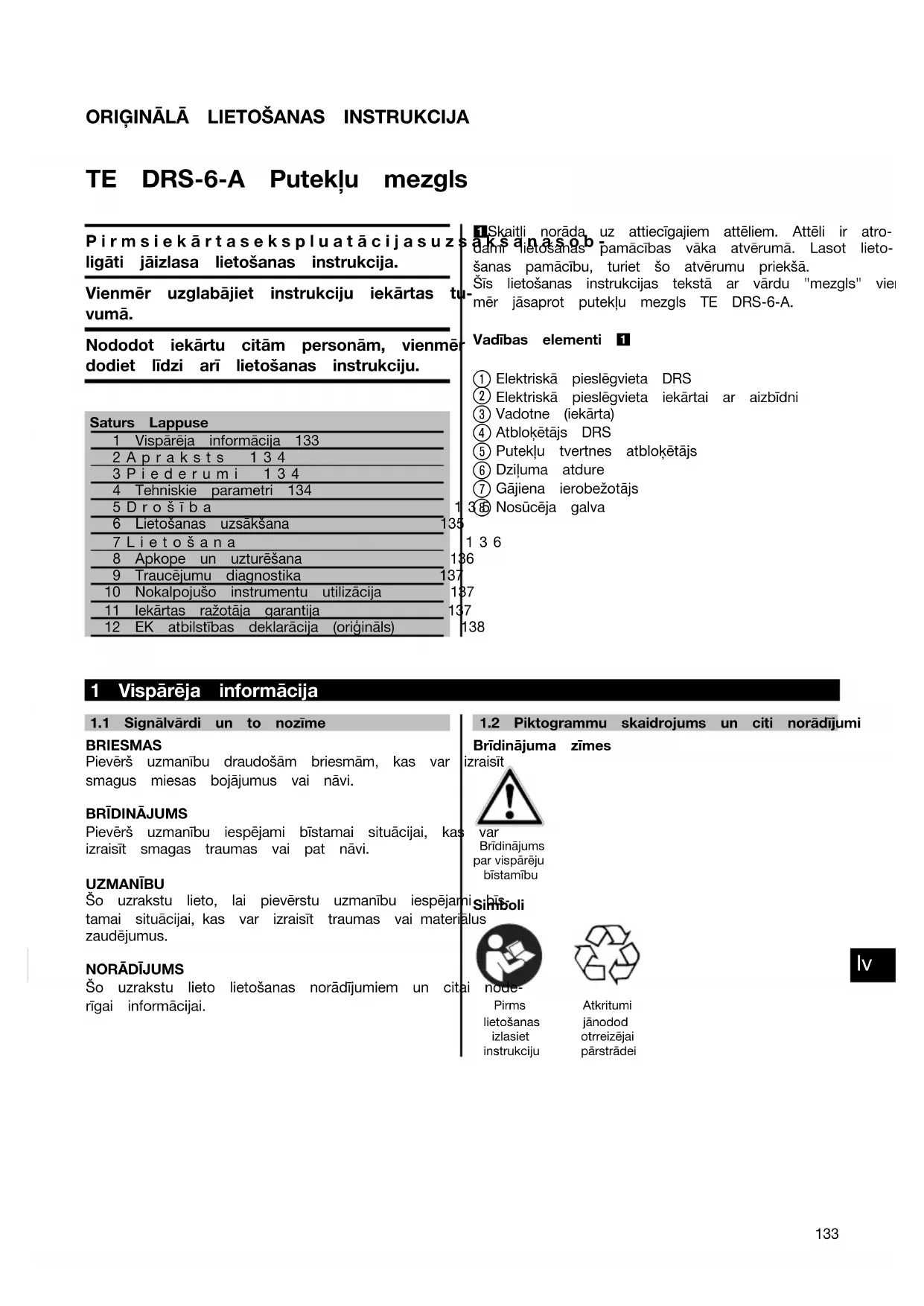 Printed: 08.07.2013 | Doc-Nr: PUB / 5071244 / 000 / 02ORIĢINĀLĀ LIETOŠANAS INSTRUKCIJA TE DRS‑6‑A Putekļu mezgls Pirmsiekārtasekspluatācijasuzsākšanasob- ligāti jāizlasa lietošanas instrukcija. Vienmēr uzglabājiet instrukciju iekārtas tu- vumā. Nododot iekārtu citām personām, vienmēr dodiet līdzi arī lietošanas instrukciju. Saturs Lappuse1 Vispārēja informācija 1332Apraksts 1343Piederumi 1344 Tehniskie parametri 1345Drošība 1356 Lietošanas uzsākšana 1357Lietošana 1368 Apkope un uzturēšana 1369 Traucējumu diagnostika 13710 Nokalpojušo instrumentu utilizācija 13711 Iekārtas ražotāja garantija 13712 EK atbilstības deklarācija (oriģināls) 1381 Skaitļi norāda uz attiecīgajiem attēliem. Attēli ir atro-dami lietošanas pamācības vāka atvērumā. Lasot lieto-šanas pamācību, turiet šo atvērumu priekšā.Šīs lietošanas instrukcijas tekstā ar vārdu "mezgls" vien-mēr jāsaprot putekļu mezgls TE DRS‑6‑A.Vadības elementi 1 Elektriskā pieslēgvieta DRS Elektriskā pieslēgvieta iekārtai ar aizbīdni Vadotne (iekārta) Atbloķētājs DRS Putekļu tvertnes atbloķētājs Dziļuma atdure Gājiena ierobežotājs Nosūcēja galva 1 Vispārēja informācija 1.1 Signālvārdi un to nozīmeBRIESMASPievērš uzmanību draudošām briesmām, kas var izraisītsmagus miesas bojājumus vai nāvi.BRĪDINĀJUMSPievērš uzmanību iespējami bīstamai situācijai, kas varizraisīt smagas traumas vai pat nāvi.UZMANĪBUŠo uzrakstu lieto, lai pievērstu uzmanību iespējami bīs-tamai situācijai, kas var izraisīt traumas vai materiāluszaudējumus.NORĀDĪJUMSŠo uzrakstu lieto lietošanas norādījumiem un citai node-rīgai informācijai.1.2 Piktogrammu skaidrojums un citi norādījumiBrīdinājuma zīmesBrīdinājumspar vispārējubīstamībuSimboliPirmslietošanasizlasietinstrukcijuAtkritumijānododotrreizējaipārstrādei