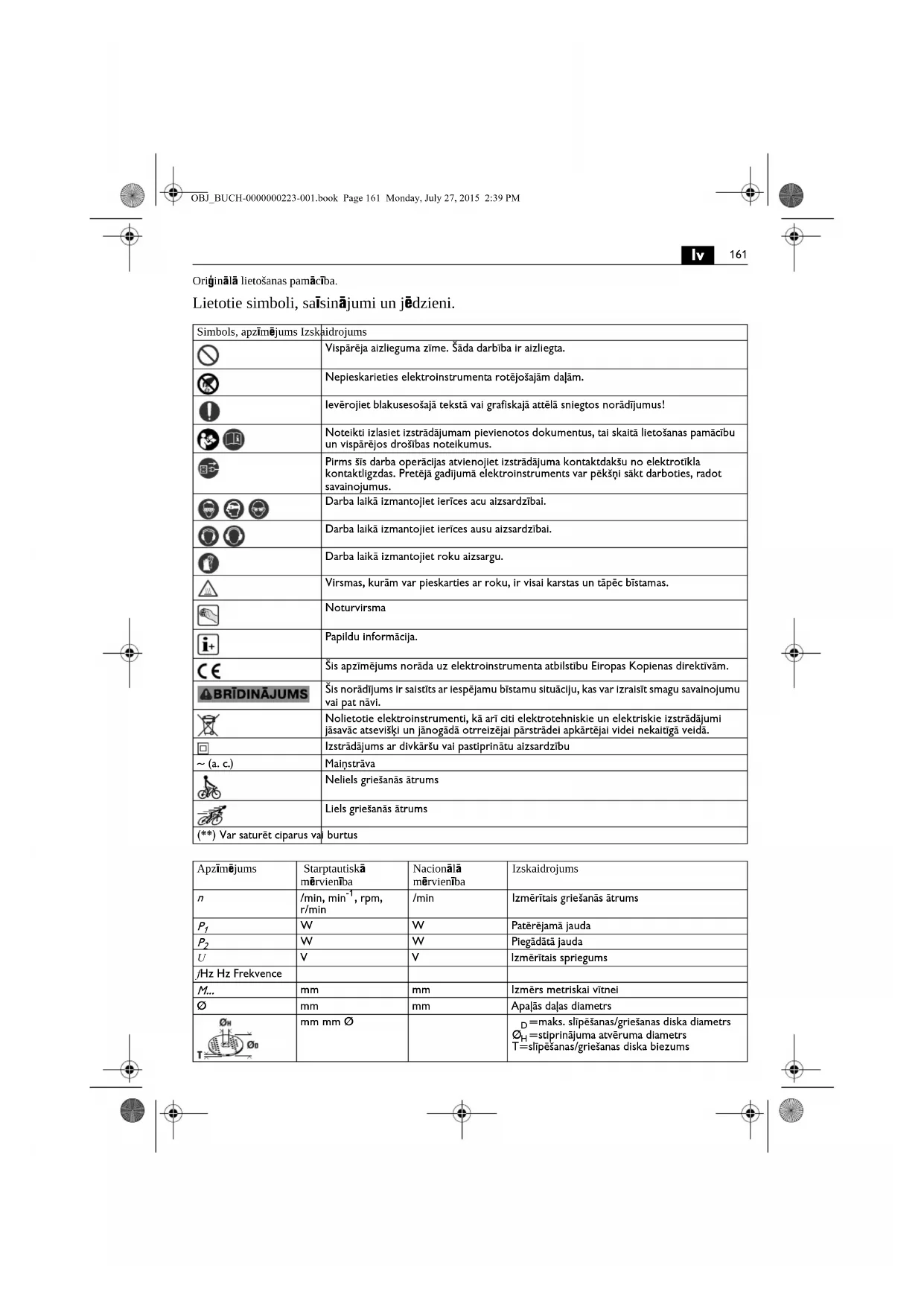 Oriģinālā lietošanas pamācība. Lietotie simboli, saīsinājumi un jēdzieni. Simbols, apzīmējums Izskaidrojums Vispārēja aizlieguma zīme. Šāda darbība ir aizliegta. Nepieskarieties elektroinstrumenta rotējošajām daļām. Ievērojiet blakusesošajā tekstā vai grafiskajā attēlā sniegtos norādījumus! Noteikti izlasiet izstrādājumam pievienotos dokumentus, tai skaitā lietošanas pamācību un vispārējos drošības noteikumus. Pirms šīs darba operācijas atvienojiet izstrādājuma kontaktdakšu no elektrotīkla kontaktligzdas. Pretējā gadījumā elektroinstruments var pēkšņi sākt darboties, radot savainojumus. Darba laikā izmantojiet ierīces acu aizsardzībai. Darba laikā izmantojiet ierīces ausu aizsardzībai. Darba laik ā izmantojiet roku aizsargu. Virsmas, kurām var pieskarties ar roku, ir visai karstas un tāpēc bīstamas. Noturvirsma Papildu informācija. Šis apzīmējums norāda uz elektroinstrumenta atbilstību Eiropas Kopienas direktīvām. Šis norādījums ir saistīts ar iespējamu bīstamu situāciju, kas var izraisīt smagu savainojumu vai pat nāvi. Nolietotie elektroinstrumenti, kā arī citi elektrotehniskie un elektriskie izstrādājumi jāsavāc atsevišķi un jānogādā otrreizējai pārstrādei apkārtējai videi nekaitīgā veidā. Izstrādājums ar divkāršu vai pastiprinātu aizsardzību ~ (a. c.) Maiņstrāva Neliels griešan ās ātrums Liels griešanās ātrums (**) Var saturēt ciparus vai burtus Apzīmējums Starptautiskā mērvienība Nacionālā mērvienība Izskaidrojums