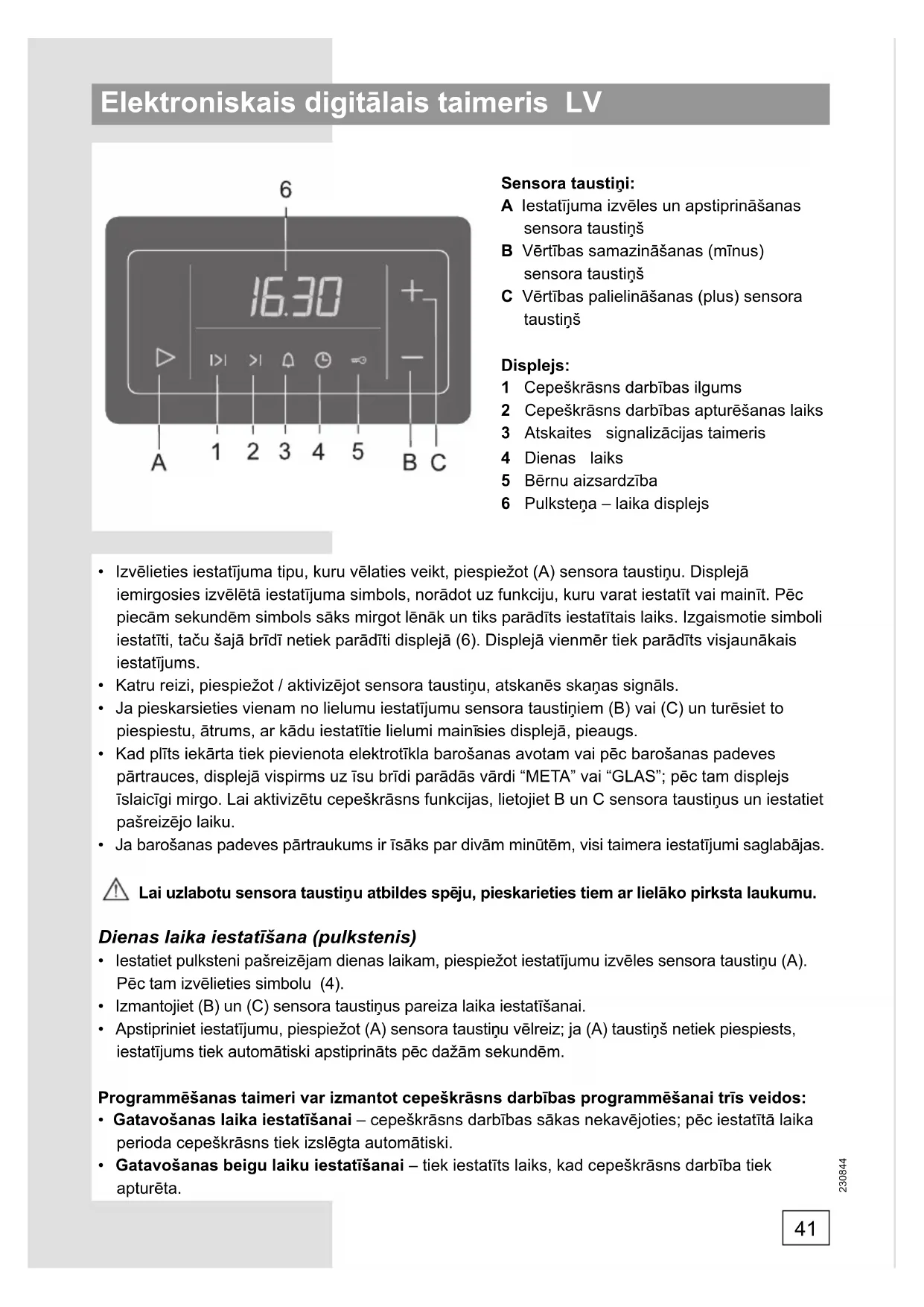 Sensora taustiņi: A Iestatījuma izvēles un apstiprināšanas sensora taustiņš B Vērtības samazināšanas (mīnus) sensora taustiņš C Vērtības palielināšanas (plus) sensora taustiņš Displejs: 1 Cepeškrāsns darbības ilgums 2 Cepeškrāsns darbības apturēšanas laiks 3 Atskaites signalizācijas taimeris 4 Dienas laiks 5 Bērnu aizsardzība 6 Pulksteņa – laika displejs
