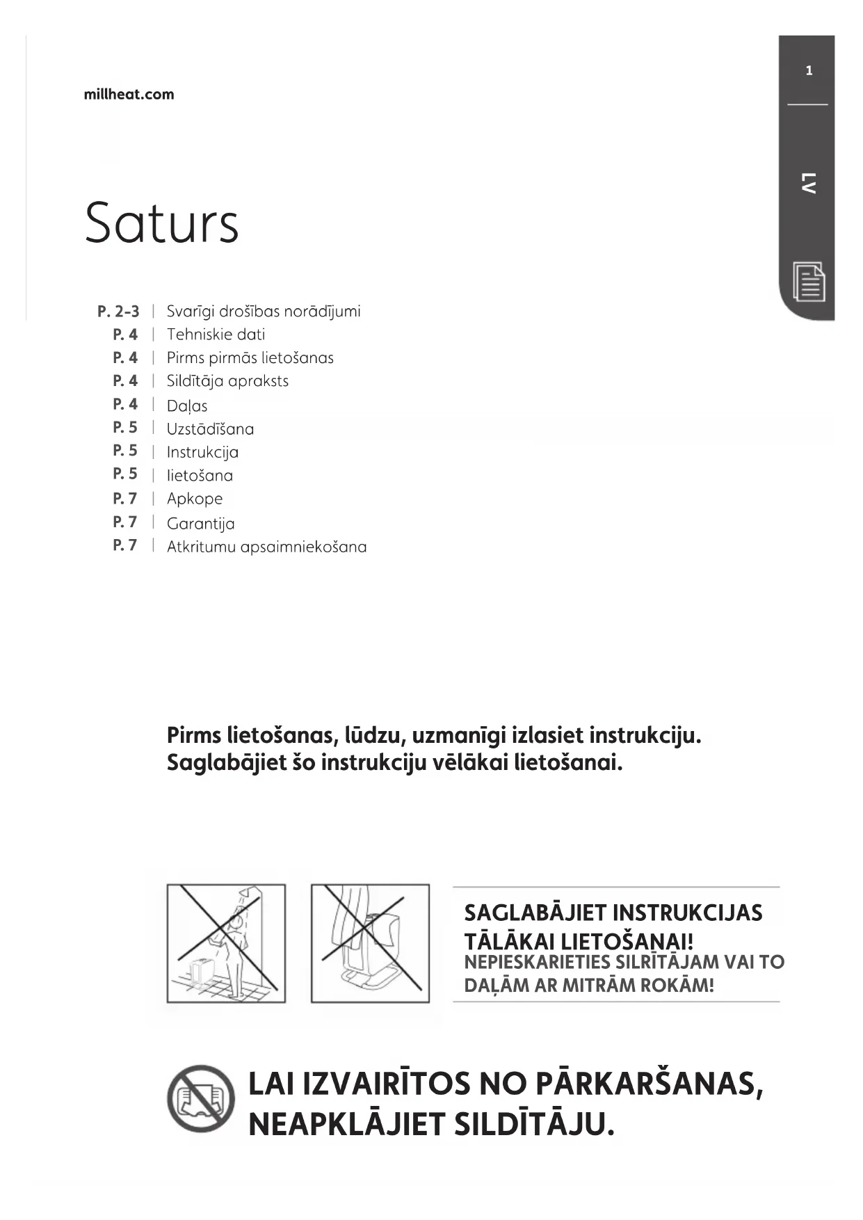 Ierīcei ir 2 gadu garantija. Šajā periodā ierīces disfunkcijas gadījumā sildītājs tiks salabots vai aizvietots ar jaunu. Garantija būs spēkā, ja sildītājs tiks izmantots saskaņā ar šīm instrukcijām un ja pircējs uzrādīs čeku par preces iegādi. Jebkādas disfunkcijas gadījumā, lūdzu, kontaktējieties ar veikalu, kurā prece tika iegādāta, vai arī ar preces importētāju. Simbols nozīmē, ka šo produktu nedrīkst izmest kopā ar mājsaimniecības atkritumiem. Šis produkts ir jānogādā atkritumu pārstrādei vai jāievieto speciālā konteinerā elektriskajām ierīcēm un elektroniskajām iekārtām. Tādējādi tiek samazināti riski veselībai un kaitējums apkārtējai videi. Vietējie atkritumu apsaimniekotāji (vai cita atbildīgā institūcija) saskaņā ar normatīvajiem aktiem pieņem un pārstrādā šādus produktus videi draudzīgā veidā.1 millheat.com P. 2-3 P. 4 P. 4 P. 4 P. 4 P. 5 P. 5 P. 5 P. 7 P. 7 P. 7