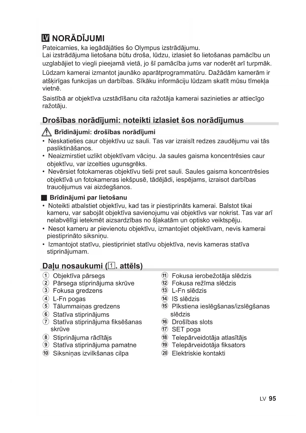 Pateicamies, ka iegādājāties šo Olympus izstrādājumu. Lai izstrādājuma lietošana būtu droša, lūdzu, izlasiet šo lietošanas pamācību un uzglabājiet to viegli pieejamā vietā, jo šī pamācība jums var noderēt arī turpmāk. Lūdzam kamerai izmantot jaunāko aparātprogrammatūru. Dažādām kamerām ir atšķirīgas funkcijas un darbības. Sīkāku informāciju lūdzam skatīt mūsu tīmekļa vietnē. Saistībā ar objektīva uzstādīšanu cita ražotāja kamerai sazinieties ar attiecīgo ražotāju. Drošībasnorādījumi:noteiktiizlasietšosnorādījumus Brīdinājumi:drošībasnorādījumi