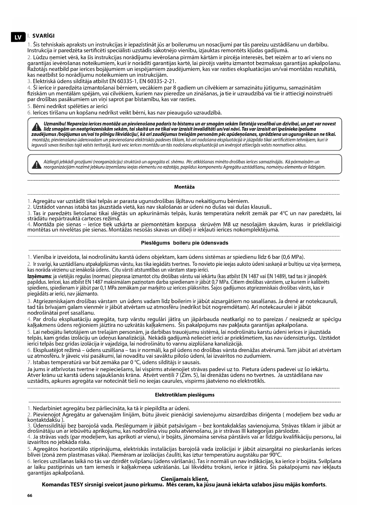 2. Pievienojot Agregātu ar galvenajām līnijām, būtu jāveic pienācīgi savienojumu aizsardzības diriģenta ( modeļiem bez vadu ar kontaktdakšu ). 3. Ūdenssildītāji bez barojošā vada. Pieslēgumam ir jābūt patsāvīgam – bez kontakdakšas savienojuma. Strāvas tīklam ir jābūt ar drošinātāju un ar iebūvētu aprīkojumu, kas nodrošina visu polu atvienošanu, ja ir strāvas III kategorijas pārslodze. 4. Ja strāvas vads (par modeļiem, kas aprīkoti ar vienu), ir bojāts, jānomaina servisa pārstāvis vai ar līdzīgu kvalikāciju personu, lai izvairītos no jebkāda riska. 5. Agregātos horizontālo stiprinājuma, elektriskās instalācijas barojošā vada izolācijai ir jābūt aizsargātai no pieskaršanās ierīces blīvei (zonā zem plastmasas vāka). Piemēram ar izolācijas čaulīti, kas iztur temperatūru augstāku par 90°C. 6. Ierīces uzsilšanas laikā no tās var dzirdēt svilpšanu (ūdens vārīšanās). Tas ir normāli un nav indikācijas, ka ierīce ir bojāta. Svilpšana ar laiku pastiprinās un tam iemesls ir kaļķakmeņa uzkrāšanās. Lai likvidētu troksni, ierīce ir jātīra. Šis pakalpojums nav iekļauts garantijas apkalpošanā. Cienījamais klient, Komandas TESY sirsnīgi sveicot jauno pirkumu. Mēs ceram, ka jūsu jaunā iekārta uzlabos jūsu mājās komforts.67Latviešu