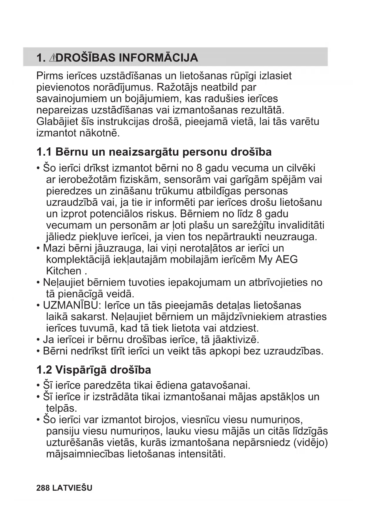 - Mazi bērni jāuzrauga, lai viņi nerotaļātos ar ierīci un komplektācijā iekļautajām mobilajām ierīcēm My AEG Kitchen .