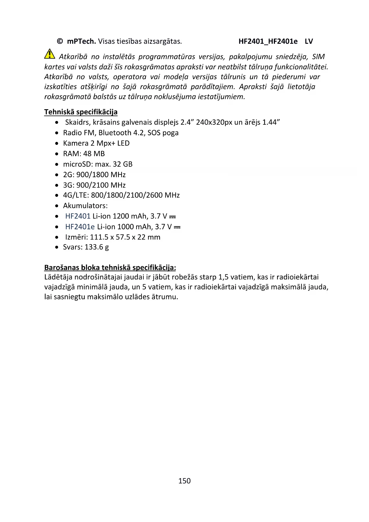 Pareiza akumulatora izmantošana Baterija šajā iekārtā spēj uzlādēties no lādētāja. Ja ir zems baterijas uzlādes līmenis, uzlādējiet to. Lai pagarinātu akumulatora darbības laiku, ļaujiet tam izlādēties zem 20% no akumulatora ietilpības un uzlādējiet to līdz 100%. Ja lādētājs netiek izmantots, atvienojiet to no telefona. Pārmērīga lādēšana samazina baterijas kalpošanas mūžu. Baterijas temperatūra ietekmē lādēšanās ciklu. Pirms lādēšanas atdzesējiet bateriju vai paaugstiniet tās temperatūru tā, lai tā būtu tuva istabas temperatūrai (aptuveni 20° C). Ja akumulatora temperatūra pārsniedz 40ºC, akumulatoru nedrīkst lādēt! Ja akumulators pārkarst, ierīce parādīs atbilstošu ziņojumu. Akumulatoru izmantojiet tikai tam paredzētajiem mērķiem. Neatstājiet akumulatoru magnētiskā lauka ietekmes zonā, jo tas samazina tā kalpošanas mūžu. Neizmantojiet bojātu akumulatoru. Akumulatora kalpošanas mūžs var samazināties, ja to ietekmē ļoti zemas vai ļoti augstas temperatūras – tas izraisa traucējumus telefona darbībā, pat tad, ja akumulators lādējas pareizi. Nemetiet akumulatoru ugunī. Neizmetiet izlietotu akumulatoru – nogādājiet to autorizētā pārstrādes punktā. Telefona kopšana Lai pagarinātu ierīces kalpošanas mūžu, ievērojiet šādus noteikumus: uzglabājiet telefonu un aksesuārus bērniem nepieejamā sausā vietā bez mitruma. Nepieļaujiet, lai uz telefonu iedarbojas augsta vai zema temperatūra; tas var samazināt telefona elektronisko komponenšu kalpošanas mūžu, izkausēt plastikāta detaļas un sabojāt akumulatoru. Pārmērīga uzlāde un atstāšana zemā vai augstā temperatūrā vai magnētiskajā laukā var saīsināt akumulatora darbības laiku. Akumulatora temperatūra ietekmē tā uzlādi. Atdzesējiet vai paaugstiniet temperatūru tā, lai tā būtu tuvu istabas temperatūrai (aptuveni 20°C). Ieteicams, lai telefons netiktu izmantots temperatūrā, kas ir augstāka par 40°C/104°F. Nemēģiniet izjaukt telefonu. Tā struktūras izjaukšana neprofesionālā manierē var nodarīt ievērojamu kaitējumu teflonam vai pilnībā to iznīcināt. Tīrīšanai izmantojiet tikai sausu audumu. Nekad neizmantojiet līdzekļus ar augstu skābju vai sārmu koncentrāciju. Izmantojiet tikai oriģinālos aksesuārus. Šī punkta neievērošana var izraisīt garantijas anulēšanu. Ieteicams tālruni nelietot temperatūrā, kas augstāka par 40°C/104°F un zemāka par 0°C/32°F.© mPTech. Visas tiesības aizsargātas. HF2401_HF2401e LV
