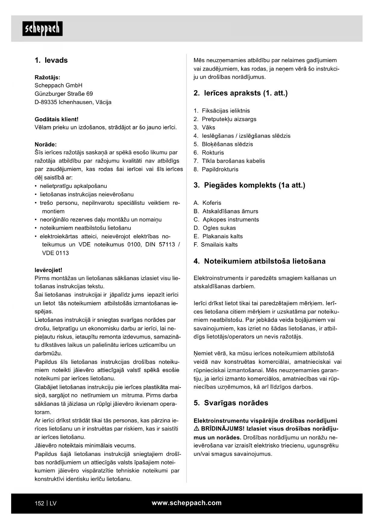 - elektroiekārtas atteici, neievērojot elektrības no- teikumus un VDE noteikumus 0100, DIN 57113 / VDE 0113 Ievērojiet! Pirms montāžas un lietošanas sākšanas izlasiet visu lie- tošanas instrukcijas tekstu. Šai lietošanas instrukcijai ir jāpalīdz jums iepazīt ierīci un lietot tās noteikumiem atbilstošās izmantošanas ie- spējas. Lietošanas instrukcijā ir sniegtas svarīgas norādes par drošu, lietpratīgu un ekonomisku darbu ar ierīci, lai ne- pieļautu riskus, ietaupītu remonta izdevumus, samazinā- tu dīkstāves laikus un palielinātu ierīces uzticamību un darbmūžu. Papildus šīs lietošanas instrukcijas drošības noteiku- miem noteikti jāievēro attiecīgajā valstī spēkā esošie noteikumi par ierīces lietošanu. Glabājiet lietošanas instrukciju pie ierīces plastikāta mai- siņā, sargājot no netīrumiem un mitruma. Pirms darba sākšanas tā jāizlasa un rūpīgi jāievēro ikvienam opera- toram. Ar ierīci drīkst strādāt tikai tās personas, kas pārzina ie- rīces lietošanu un ir instruētas par riskiem, kas ir saistīti ar ierīces lietošanu. Jāievēro noteiktais minimālais vecums. Papildus šajā lietošanas instrukcijā sniegtajiem drošī- bas norādījumiem un attiecīgās valsts īpašajiem notei- kumiem jāievēro vispāratzītie tehniskie noteikumi par konstruktīvi identisku ierīču lietošanu.www.scheppach.com