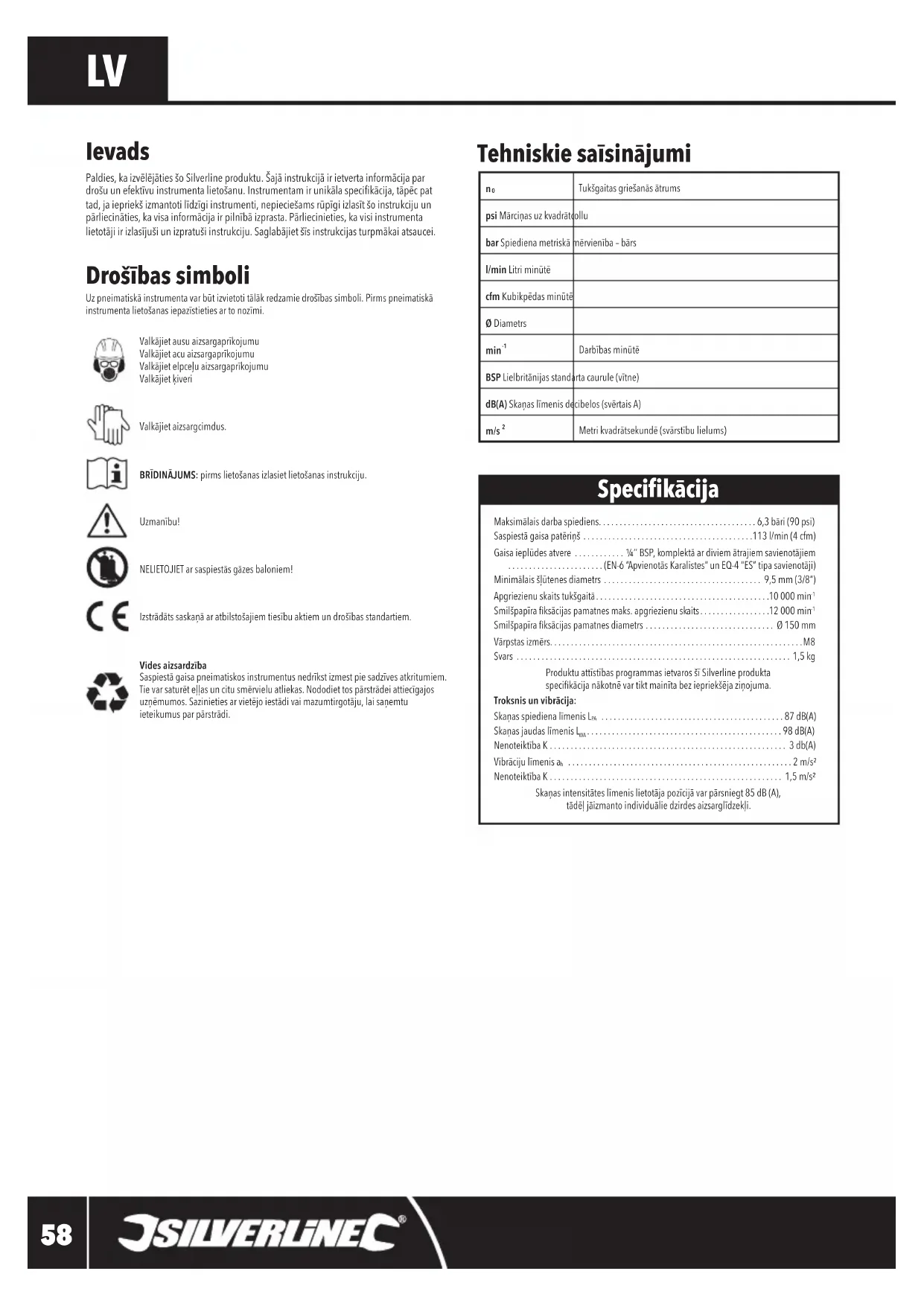 Metrikvadrātsekundē(svārstībulielums) Ievads Paldies,kaizvēlējātiesšoSilverlineproduktu.Šajāinstrukcijāirietvertainformācijapar drošuunefektīvuinstrumentalietošanu.Instrumentamirunikālaspecifikācija,tāpēcpat tad,jaiepriekšizmantotilīdzīgiinstrumenti,nepieciešamsrūpīgiizlasītšoinstrukcijuun pārliecināties,kavisainformācijairpilnībāizprasta.Pārliecinieties,kavisiinstrumenta lietotājiirizlasījušiunizpratušiinstrukciju.Saglabājietšīsinstrukcijasturpmākaiatsaucei. 580430_OwnerManual.indd 58580430_OwnerManual.indd 58 29/02/2024 10:4829/02/2024 10:48Pneimatiskā slīpmašīna un pulējamā mašīna 150 mm580430
