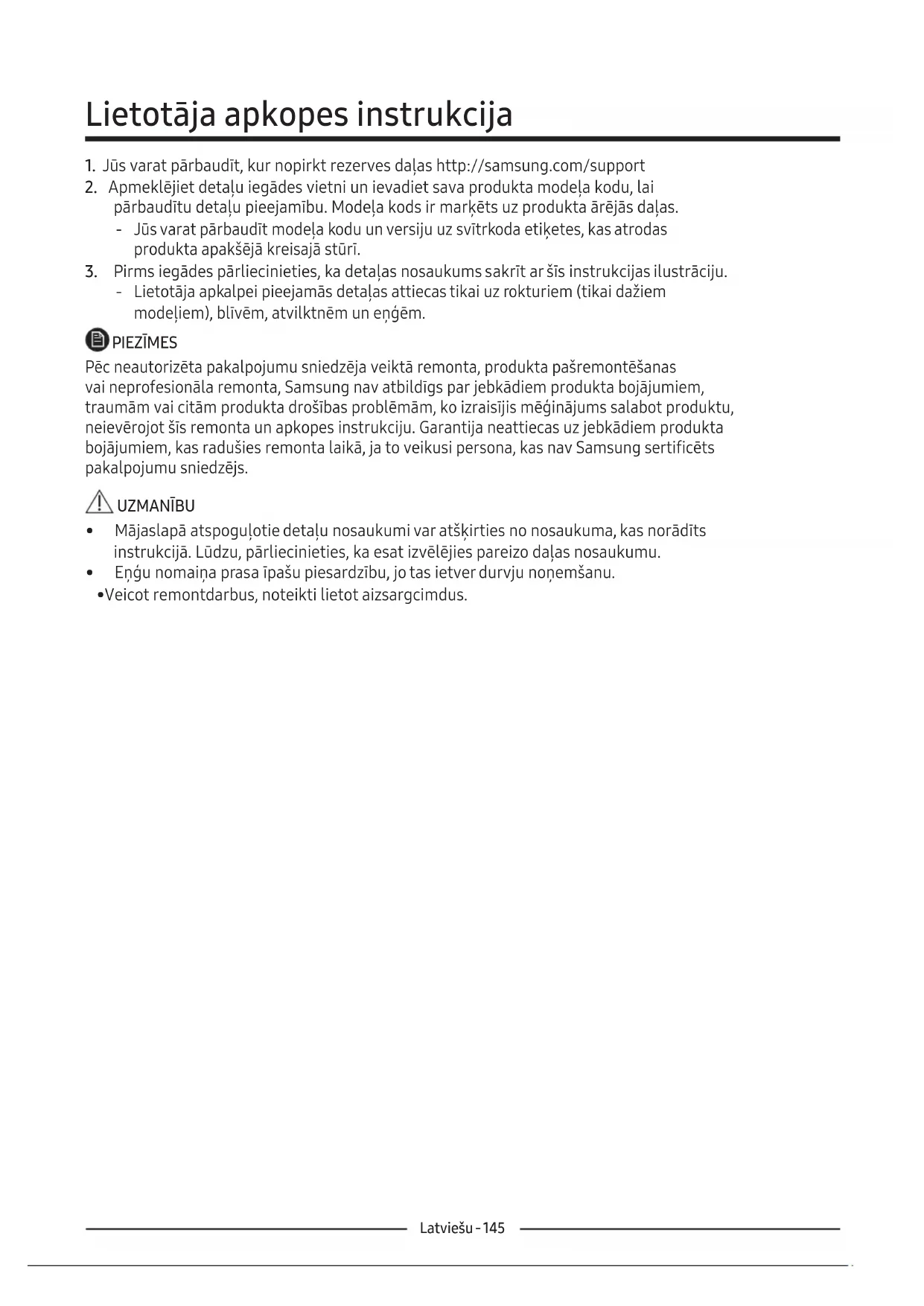 ‐ Lietotāja apkalpei pieejamās detaļas attiecas tikai uz rokturiem (tikai dažiem modeļiem), blīvēm, atvilktnēm un eņģēm. PIEZĪMES Pēc neautorizēta pakalpojumu sniedzēja veiktā remonta, produkta pašremontēšanas vaineprofesionāla remonta, Samsung nav atbildīgs par jebkādiem produkta bojājumiem, traumām vai citām produkta drošības problēmām, ko izraisījis mēģinājums salabot produktu, neievērojot šīs remonta un apkopes instrukciju. Garantija neattiecas uz jebkādiem produkta bojājumiem, kas radušies remonta laikā, ja to veikusi persona, kas nav Samsung sertificēts pakalpojumu sniedzējs. UZMANĪBU