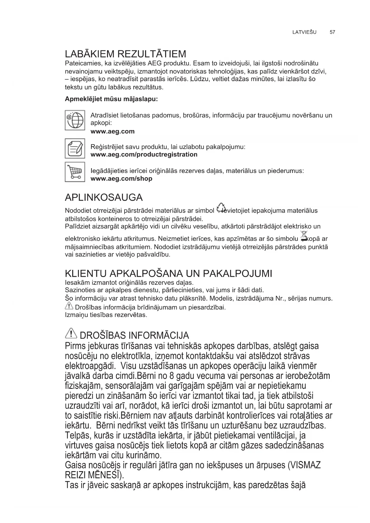 Pateicamies, ka izvēlējāties AEG produktu. Esam to izveidojuši, lai ilgstoši nodrošinātu nevainojamu veiktspēju, izmantojot novatoriskas tehnoloģijas, kas palīdz vienkāršot dzīvi, – iespējas, ko neatradīsit parastās ierīcēs. Lūdzu, veltiet dažas minūtes, lai izlasītu šo tekstu un gūtu labākus rezultātus. Apmeklējiet mūsu mājaslapu: Atradīsiet lietošanas padomus, brošūras, informāciju par traucējumu novēršanu un apkopi: www.aeg.com Reģistrējiet savu produktu, lai uzlabotu pakalpojumu: www.aeg.com/productregistration Iegādājieties ierīcei oriģinālās rezerves daļas, materiālus un piederumus: www.aeg.com/shop APLINKOSAUGA Nododiet otrreizējai pārstrādei materiālus ar simbol . Ievietojiet iepakojuma materiālus atbilstošos konteineros to otrreizējai pārstrādei. Palīdziet aizsargāt apkārtējo vidi un cilvēku veselību, atkārtoti pārstrādājot elektrisko un elektronisko iekārtu atkritumus. Neizmetiet ierīces, kas apzīmētas ar šo simbolu , kopā ar mājsaimniecības atkritumiem. Nododiet izstrādājumu vietējā otrreizējās pārstrādes punktā vai sazinieties ar vietējo pašvaldību.