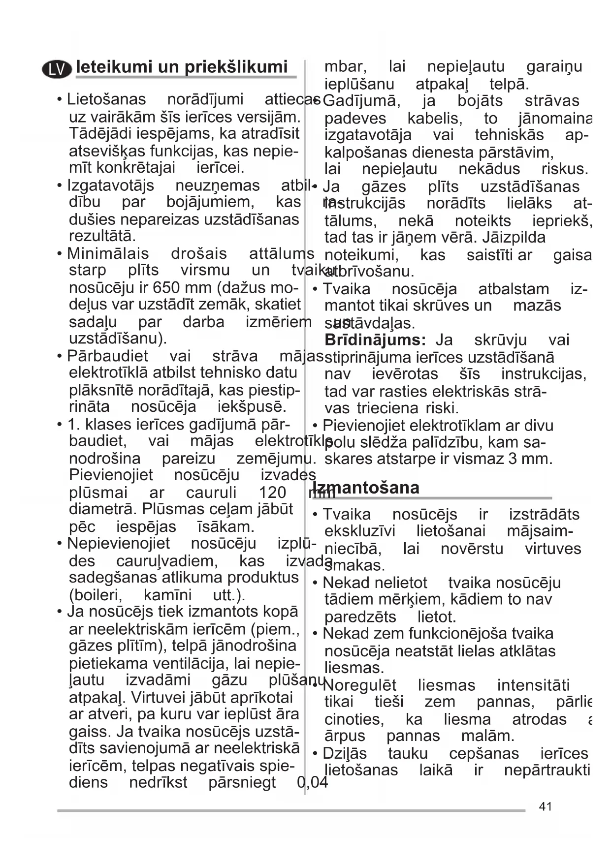 - 1.klasesierīcesgadījumāpār- baudiet, vai mājas elektrotīkls nodrošina pareizu zemējumu. Pievienojiet nosūcēju izvades plūsmai ar cauruli 120 mm diametrā.Plūsmasceļamjābūt pēc iespējas īsākam.