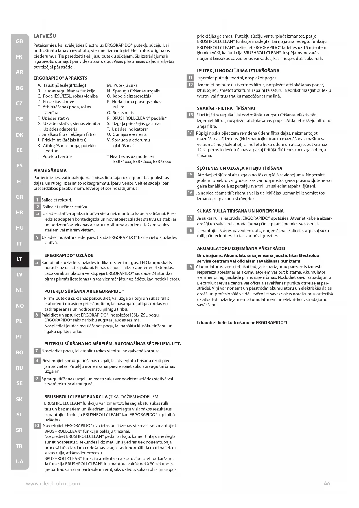 Iztukšojiet, izmetot atkritumu spainī tā saturu. Nedrīkst mazgāt putekļu tvertni vai ltrus trauku mazgāšanas mašīnā. SVARĪGI - FILTRA TĪRĪŠANA! 13 Filtri ir jātīra regulāri, lai nodrošinātu augstu tīrīšanas efektivitāti. Izņemiet ltrus, nospiežot atbloķēšanas pogas. Atdaliet iekšējo ltru no ārējā ltra. 14 Rūpīgi noskalojiet zem remdena ūdens ltra daļas, neizmantojot mazgāšanas līdzekļus. (Neizmantojiet trauku mazgāšanas mašīnu vai veļas mašīnu.) Sakratiet, lai nolietu lieko ūdeni un atstājiet žūt vismaz 12 st. pirms to ievietošanas atpakaļ tīrītājā. Šļūtenes un uzgaļa riteņu tīrīšana. ŠĻŪTENES UN UZGAĻA RITEŅU TĪRĪŠANA 15 Atbrīvojiet šļūteni aiz uzgaļa no tās augšējā savienojuma. Noņemiet jebkuru objektu vai gružus, kas var nosprostot gaisa plūsmu šļūtenē vai gaisa kanālā ceļā uz putekļu tvertni, un salieciet atpakaļ šļūteni. 16 Ja nepieciešams tīrīt riteņus vai ja tie ieķīlējas, uzmanīgi izņemiet tos, izmantojot plakanu skrūvgriezi. SUKAS RUĻĻA TĪRĪŠANA UN NOŅEMŠANA 17 Ja sukas rullis iesprūdīs, ERGORAPIDO® apstāsies. Atveriet kabeļa aizsar- grežģi un sukas ruļļa nodalījuma pārsegu un izņemiet sukas rulli. 18 Izmantojiet šķēres pavedienu, utt., noņemšanai. Salieciet atpakaļ suku rulli, pārliecinoties, ka tas var brīvi griezties. AKUMULATORU IZŅEMŠANA PĀRSTRĀDEI Brīdinājums; Akumulatora izņemšana jāuztic tikai Electrolux servisa centram vai ociālam savākšanas punktam! 19 Akumulatorus izņemiet tikai tad, ja izstrādājumu paredzēts izmest. Nepareiza apiešanās ar akumulatoriem var būt bīstama. Akumulatori vienmēr pilnīgi jāizlādē pirms izņemšanas. Nododiet savu izstrādājumu Electrolux servisa centrā vai ociālā savākšanas punktā otrreizējai pār- strādei. Viņi var noņemt un pārstrādāt akumulatoru un elektriskās daļas drošā un profesionālā veidā. Ievērojiet savas valsts noteikumus attiecībā uz atkārtoti uzlādējamiem akumulatoriem un elektrisko izstrādājumu savākšanu. Izbaudiet lielisku tīrīšanu ar ERGORAPIDO®! 46www.electrolux.com