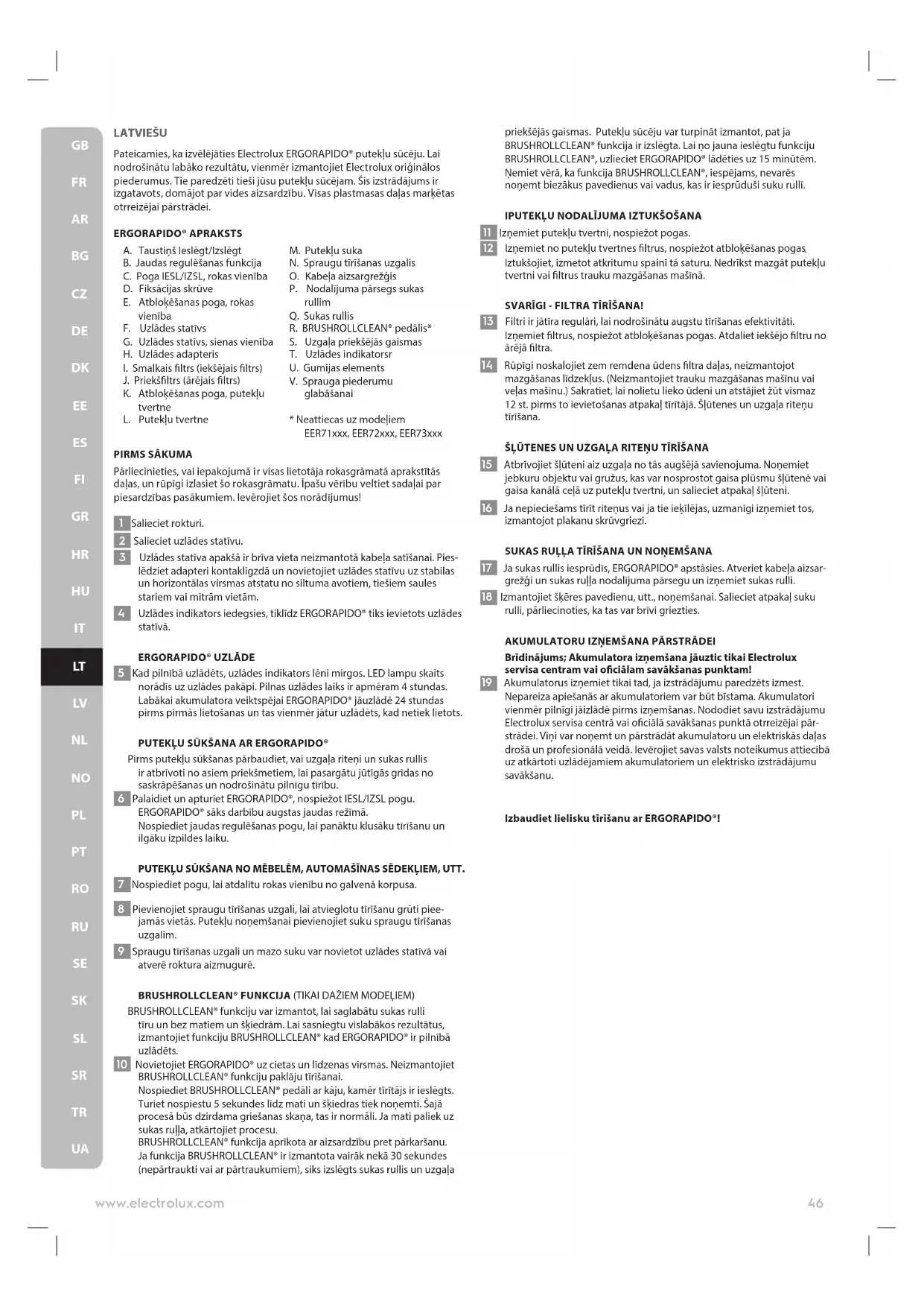 Iztukšojiet, izmetot atkritumu spainī tā saturu. Nedrīkst mazgāt putekļu tvertni vai ltrus trauku mazgāšanas mašīnā. SVARĪGI - FILTRA TĪRĪŠANA! 13 Filtri ir jātīra regulāri, lai nodrošinātu augstu tīrīšanas efektivitāti. Izņemiet ltrus, nospiež ot atbloķēšanas pogas. Atdaliet iekšējo ltru no ārējā ltra. 14 Rūpīgi noskalojiet zem remdena ūdens ltra daļas, neizmantojot mazgāšanas līdzekļus. (Neizmantojiet trauku mazgāšanas mašīnu vai veļas mašīnu.) Sakratiet, lai nolietu lieko ūdeni un atstājiet žūt vismaz 12 st. pirms to ievietošanas atpakaļ tīrītājā. Šļūtenes un uzgaļa riteņu tīrīšana. ŠĻŪTENES UN UZGAĻA RITEŅU TĪRĪŠANA 15 Atbrīvojiet šļūteni aiz uzgaļa no tās augšējā savienojuma. Noņemiet jebkuru objektu vai gružus, kas var nosprostot gaisa plūsmu šļūtenē vai gaisa kanālā ceļā uz putekļu tvertni, un salieciet atpakaļ šļūteni. 16 Ja nepieciešams tīrīt riteņus vai ja tie ieķīlējas, uzmanīgi izņemiet tos, izmantojot plakanu skrūvgriezi. SUKAS RUĻĻA TĪRĪŠANA UN NOŅEMŠANA 17 Ja sukas rullis iesprūdīs, ERGORAPIDO® apstāsies. Atveriet kabeļa aizsar- grežģi un sukas ruļļa nodalījuma pārsegu un izņemiet suk as rulli. 18 Izmantojiet šķēres pavedienu, utt., noņemšanai. Salieciet atpakaļ suku rulli, pārliecinoties, ka tas var brīvi griezties. AKUMULATORU IZŅEMŠANA PĀRSTRĀDEI Brīdinājums; Akumulatora izņemšana jāuztic tikai Electrolux servisa centram vai ociālam savākšanas punktam! 19 Akumulatorus izņemiet tikai tad, ja izstrādājumu paredzēts izmest. Nepareiza apiešanās ar akumulatoriem var būt bīstama. Akumulatori vienmēr pilnīgi jāizlādē pirms izņemšanas. Nododiet savu izstrādājumu Electrolux servisa centrā vai ociālā savākšanas punktā otrreizējai pār- strādei. Viņi var noņemt un pārstrādāt akumulatoru un elektriskās daļas drošā un profesionālā veidā. Ievērojiet savas valsts noteikumus attiecībā uz atkārtoti uzlādējamiem akumulatoriem un elektrisko izstrādājumu savākšanu. Izbaudiet lielisku tīrīšanu ar ERGORAPIDO®! 46www.electrolux.com