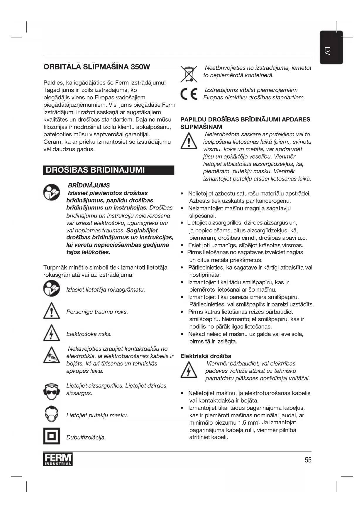 Izlasiet pievienotos drošības brīdinājumus, papildu drošības brīdinājumus un instrukcijas. Drošības brīdinājumu un instrukciju neievērošana var izraisīt elektrošoku, ugunsgrēku un/ vai nopietnas traumas. Saglabājiet drošības brīdinājumus un instrukcijas, lai varētu nepieciešamības gadījumā tajos ielūkoties. Turpmāk minētie simboli tiek izmantoti lietotāja rokasgrāmatā vai uz izstrādājuma: Izlasiet lietotāja rokasgrāmatu. Personīgu traumu risks. Elektrošoka risks. Nekavējoties izraujiet kontaktdakšu no elektrotīkla, ja elektrobarošanas kabelis ir bojāts, kā arī tīrīšanas un tehniskās apkopes laikā. Lietojiet aizsargbrilles. Lietojiet dzirdes aizsargus. Lietojiet putekļu masku. Dubultizolācija. Neatbrīvojieties no izstrādājuma, iemetot to nepiemērotā konteinerā. Izstrādājums atbilst piemērojamiem Eiropas direktīvu drošības standartiem. PAPILDU DROŠĪBAS BRĪDINĀJUMI APDARES