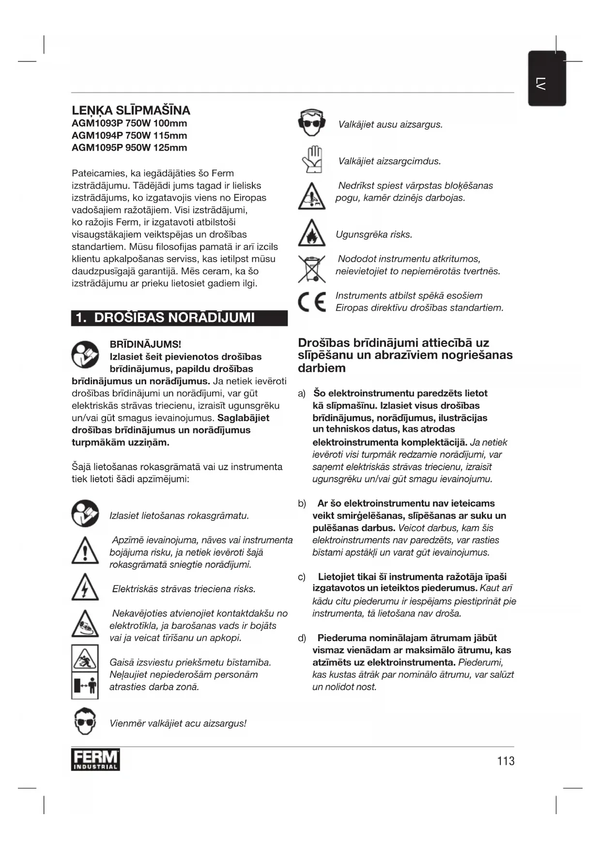 AGM1093P 750W 100mm AGM1094P 750W 115mm AGM1095P 950W 125mm Pateicamies, ka iegādājāties šo Ferm izstrādājumu. Tādējādi jums tagad ir lielisks izstrādājums, ko izgatavojis viens no Eiropas vadošajiem ražotājiem. Visi izstrādājumi, ko ražojis Ferm, ir izgatavoti atbilstoši visaugstākajiem veiktspējas un drošības standartiem. Mūsu filosofijas pamatā ir arī izcils klientu apkalpošanas serviss, kas ietilpst mūsu daudzpusīgajā garantijā. Mēs ceram, ka šo izstrādājumu ar prieku lietosiet gadiem ilgi.