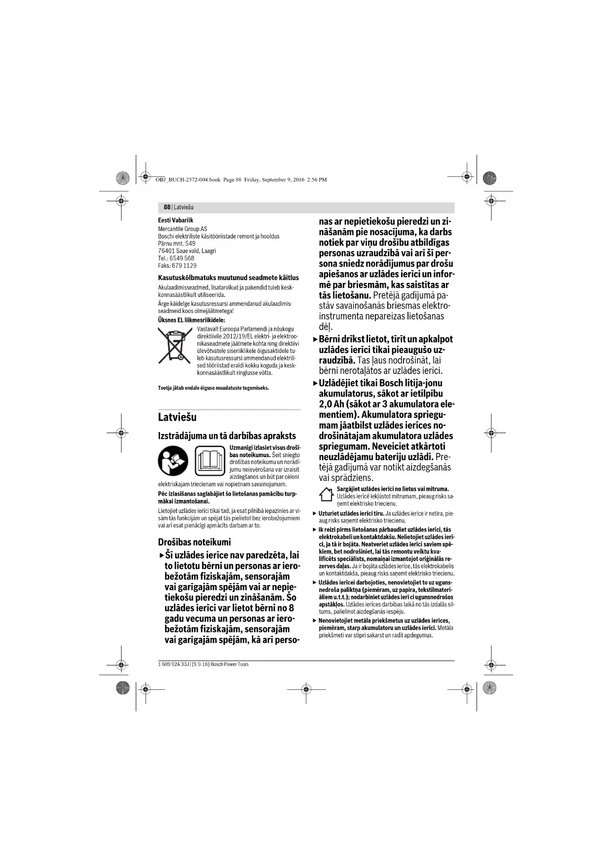 Põhjus Vea kõrvaldamine Punane tuli veanäidikul 5 vilgub Laadimine ei ole võimalik Aku ei ole asetatud kohvrisse L-BOXX (õigesse asendisse) Seadke aku L-BOXXi Wire- less-Charging sees õigesse asendisse, aku alumine külg jääb L-BOXX-põhja suunas. Võõra objekti tuvastamine Laadimispinnal 1 (võimalik et kohvris L-BOXX) on veel mõ- ni/mõni teine ese Eemaldage ese L-BOXXi on asetatud vale aku Asetage laadimisalale õige aku Kasutatud on vale L-BOXX-si- su (seetõttu ei ole akud õiges asendis) Kasutage õiget L-BOXX-sisu (tuvastatav L-BOXXi Wire- less-Charging-kleebise järgi) Aku on defektne Vahetage aku välja Ooterežiimi (roheline) tuli 3 ei põle Auto aku pinge on liiga madal Käivitage mootor (laadige starteri akut). Akulaadija pistik ei ole (kor- rektselt) pistikupessa ühen- datud Ühendage pistik (korrektselt) pistikupessa Autopistikupesa, pistikupe- sa, võrgujuhe või laadimis- seade on defektsed Auto aku pinge on liiga madal Kontrollige võrgupinget või auto aku pinget, vajaduse korral laske laadimisseade üle vaadata Boschi elektrilis- te tööriistade hoolduskesku- ses. OBJ_BUCH-2572-004.book Page 87 Friday, September 9, 2016 2:56 PM88 | Latviešu 1 609 92A 33J | (9.9.16) Bosch Power Tools Eesti Vabariik Mercantile Group AS Boschi elektriliste käsitööriistade remont ja hooldus Pärnu mnt. 549 76401 Saue vald, Laagri Tel.: 6549 568 Faks: 679 1129 Kasutuskõlbmatuks muutunud seadmete käitlus Akulaadimisseadmed, lisatarvikud ja pakendid tuleb kesk- konnasäästlikult utiliseerida. Ärge käidelge kasutusressursi ammendanud akulaadimis- seadmeid koos olmejäätmetega! Üksnes EL liikmesriikidele: Vastavalt Euroopa Parlamendi ja nõukogu direktiivile 2012/19/EL elektri- ja elektroo- nikaseadmete jäätmete kohta ning direktiivi ülevõtvatele siseriiklikele õigusaktidele tu- leb kasutusressursi ammendanud elektrili- sed tööriistad eraldi kokku koguda ja kesk- konnasäästlikult ringlusse võtta. Tootja jätab endale õiguse muudatuste tegemiseks. Latviešu Izstrādājuma un tā darbības apraksts Uzmanīgi izlasiet visus drošī- bas noteikumus. Šeit sniegto drošības noteikumu un norādī- jumu neievērošana var izraisīt aizdegšanos un būt par cēloni elektriskajam triecienam vai nopietnam savainojumam. Pēc izlasīšanas saglabājiet šo lietošanas pamācību turp- mākai izmantošanai. Lietojiet uzlādes ierīci tikai tad, ja esat pilnībā iepazinies ar vi- sām tās funkcijām un spējat tās pielietot bez ierobežojumiem vai arī esat pienācīgi apmācīts darbam ar to. Drošības noteikumi Šī uzlādes ierīce nav paredzēta, lai to lietotu bērni un personas ar iero- bežotām fiziskajām, sensorajām vai garīgajām spējām vai ar nepie- tiekošu pieredzi un zināšanām. Šo uzlādes ierīci var lietot bērni no 8 gadu vecuma un personas ar iero- bežotām fiziskajām, sensorajām vai garīgajām spējām, kā arī perso- nas ar nepietiekošu pieredzi un zi- nāšanām pie nosacījuma, ka darbs notiek par viņu drošību atbildīgas personas uzraudzībā vai arī šī per- sona sniedz norādījumus par drošu apiešanos ar uzlādes ierīci un infor- mē par briesmām, kas saistītas ar tās lietošanu. Pretējā gadījumā pa- stāv savainošanās briesmas elektro- instrumenta nepareizas lietošanas dēļ. Bērni drīkst lietot, tīrīt un apkalpot uzlādes ierīci tikai pieaugušo uz- raudzībā. Tas ļaus nodrošināt, lai bērni nerotaļātos ar uzlādes ierīci. Uzlādējiet tikai Bosch litija-jonu akumulatorus, sākot ar ietilpību 2,0 Ah (sākot ar 3 akumulatora ele- mentiem). Akumulatora spriegu- mam jāatbilst uzlādes ierīces no- drošinātajam akumulatora uzlādes spriegumam. Neveiciet atkārtoti neuzlādējamu bateriju uzlādi. Pre- tējā gadījumā var notikt aizdegšanās vai sprādziens. Sargājiet uzlādes ierīci no lietus vai mitruma. Uzlādes ierīcē iekļūstot mitrumam, pieaug risks sa- ņemt elektrisko triecienu. Uzturiet uzlādes ierīci tīru. Ja uzlādes ierīce ir netīra, pie- aug risks saņemt elektrisko triecienu. Ik reizi pirms lietošanas pārbaudiet uzlādes ierīci, tās elektrokabeli un kontaktdakšu. Nelietojiet uzlādes ierī- ci, ja tā ir bojāta. Neatveriet uzlādes ierīci saviem spē- kiem, bet nodrošiniet, lai tās remontu veiktu kva- lificēts speciālists, nomaiņai izmantojot oriģinālās re- zerves daļas. Ja ir bojāta uzlādes ierīce, tās elektrokabelis un kontaktdakša, pieaug risks saņemt elektrisko triecienu. Uzlādes ierīcei darbojoties, nenovietojiet to uz uguns- nedroša paliktņa (piemēram, uz papīra, tekstilmateri- āliem u.t.t.); nedarbiniet uzlādes ierī ci ugunsnedrošos apstākļos. Uzlādes ierīces darbības laikā no tās izdalās sil- tums, palielinot aizdegšanās iespēju. Nenovietojiet metāla priekšmetus uz uzlādes ierīces, piemēram, starp akumulatoru un uzlādes ierīci. Metāla priekšmeti var stipri sakarst un radīt apdegumus. OBJ_BUCH-2572-004.book Page 88 Friday, September 9, 2016 2:56 PMLatviešu | 89 Bosch Power Tools 1 609 92A 33J | (9.9.16) Nepieļaujiet kredītkaršu vai citu magnētisko datu ne- sēju atrašanos uzlādes ierīces tuvumā. Tā rezultātā ša- jos datu nesējos ierakstītie dati var tikt izdzēsti. Bojājuma vai nepareizas lietošanas rezultātā akumula- tors var izdalīt kaitīgus izgarojumus. Šādā gadījumā iz- vēdiniet telpu un, ja jūtaties slikti, griezieties pie ārsta. Izgarojumi var izraisīt elpošanas ceļu kairinājumu. Novietojiet uzlādes ierīci automašīnas salonā drošā veidā. Nokrītot kādai no uzlādes ierīces daļām, tā var radīt savainojumus. Nerīkojieties ar uzlādes ierīci laikā, kad vadāt automa- šīnu. Tas var izraisīt negad ījumu. Novietojiet vadus tā, lai tie neizraisītu paklupšanu un lietošanas gaitā netiktu bojāti. Pielietojums Uzlādes ierīce ir paredzēta viena vai divu Bosch induktīvo 10,8 V, 12 V vai 18 V litija-jonu akumulatoru uzlādei kontei- nerā L-BOXX 136. Akumulat