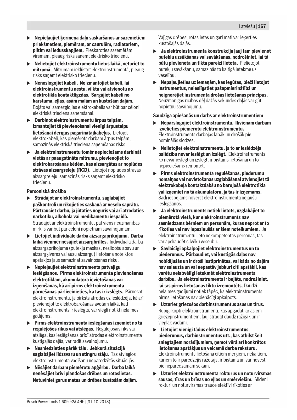 Izlasiet visus drošības noteikumus un instrukcijas, aplūkojiet ilustrācijas un iepazīstieties ar specifikācijām, kas tiek piegādātas kopā ar šo elektroinstrumentu. Šeit sniegto drošības noteikumu un instrukciju neievērošana var izraisīt aizdegšanos un būt par cēloni elektriskajam triecienam vai nopietnam savainojumam. Pēc izlasīšanas uzglabājiet šos noteikumus turpmākai izmantošanai. Drošības noteikumos lietotais apzīmējums "elektroinstruments" attiecas gan uz Jūsu tīkla elektroinstrumentiem (ar elektrokabeli), gan arī uz akumulatora elektroinstrumentiem (bez elektrokabeļa). Drošība darba vietā u Uzturiet savu darba vietu tīru un labi apgaismotu. Nekārtīgās un tumšās vietās var viegli notikt nelaimes gadījums. u Nedarbiniet elektroinstrumentus sprādzienbīstamā atmosfērā, piemēram, viegli uzliesmojošu šķidrumu tuvumā un vietās ar paaugstinātu gāzu vai putekļu saturu gaisā. Darba laikā elektroinstruments nedaudz dzirksteļo, un tas var izsaukt viegli degošu putekļu vai tvaiku aizdegšanos. u Darbinot elektroinstrumentu, neļaujiet bērniem un nepiederošām personām tuvoties darba vietai. Citu personu klātbūtne var novērst uzmanību, kā rezultātā jūs varat zaudēt kontroli pār elektroinstrumentu. Elektrodrošība u Elektroinstrumenta kontaktdakšai jābūt piemērotai elektrotīkla kontaktligzdai. Kontaktdakšas konstrukciju nedrīkst nekādā veidā mainīt. Nelietojiet kontaktdakšas adapterus, ja elektroinstruments caur kabeli tiek savienots ar aizsargzemējuma ķēdi. Neizmainītas konstrukcijas kontaktdakša, kas piemērota kontaktligzdai, ļauj samazināt elektriskā trieciena saņemšanas risku. 1 609 92A 4NF | (31.10.2018) Bosch Power ToolsLatviešu | 167 u Nepieļaujiet ķermeņa daļu saskaršanos ar sazemētiem priekšmetiem, piemēram, ar caurulēm, radiatoriem, plītīm vai ledusskapjiem. Pieskaroties sazemētām virsmām, pieaug risks saņemt elektrisko triecienu. u Nelietojiet elektroinstrumentu lietus laikā, neturiet to mitrumā. Mitrumam iekļūstot elektroinstrumentā, pieaug risks saņemt elektrisko triecienu. u Nenoslogojiet kabeli. Neizmantojiet kabeli, lai elektroinstrumentu nestu, vilktu vai atvienotu no elektrotīkla kontaktligzdas. Sargājiet kabeli no karstuma, eļļas, asām malām un kustošām daļām. Bojāts vai samezglojies elektrokabelis var būt par cēloni elektriskā trieciena saņemšanai. u Darbinot elektroinstrumentu ārpus telpām, izmantojiet tā pievienošanai vienīgi ārpustelpu lietošanai derīgus pagarinātājkabeļus. Lietojot elektrokabeli, kas piemērots darbam ārpus telpām, samazinās elektriskā trieciena saņemšanas risks. u Ja elektroinstrumentu tomēr nepieciešams darbināt vietās ar paaugstinātu mitrumu, pievienojiet to elektrobarošanas ķēdēm, kas aizsargātas ar noplūdes strāvas aizsargreleju (RCD). Lietojot noplūdes strāvas aizsargreleju, samazinās risks saņemt elektrisko triecienu. Personiskā drošība u Strādājot ar elektroinstrumentu, saglabājiet paškontroli un rīkojieties saskaņā ar veselo saprātu. Pārtrauciet darbu, ja jūtaties noguris vai arī atrodaties narkotiku, alkohola vai medikamentu iespaidā. Strādājot ar elektroinstrumentu, pat viens neuzmanības mirklis var būt par cēloni nopietnam savainojumam. u Lietojiet individuālo darba aizsargaprīkojumu. Darba laikā vienmēr nēsājiet aizsargbrilles. Individuālā darba aizsargaprīkojuma (putekļu maskas, neslīdošu apavu un aizsargķiveres vai ausu aizsargu) lietošana noteiktos apstākļos ļaus samazināt savainošanās risku. u Nepieļaujiet elektroinstrumenta patvaļīgu ieslēgšanos. Pirms elektroinstrumenta pievienošanas elektrotīklam, akumulatora ievietošanas vai izņemšanas, kā arī pirms elektroinstrumenta pārnešanas pārliecinieties, ka tas ir izslēgts. Pārnesot elektroinstrumentu, ja pirksts atrodas uz ieslēdzēja, kā arī pievienojot to elektrobarošanas avotam laikā, kad elektroinstruments ir ieslēgts, var viegli notikt nelaimes gadījums. u Pirms elektroinstrumenta ieslēgšanas izņemiet no tā regulējošos rīkus vai atslēgas. Regulējošais rīks vai atslēga, kas ieslēgšanas brīdī atrodas elektroinstrumenta kustīgajās daļās, var radīt savainojumu. u Nesniedzieties pārāk tālu. Jebkurā situācijā saglabājiet līdzsvaru un stingru stāju. Tas atvieglos elektroinstrumenta vadīšanu neparedzētās situācijās. u Nēsājiet darbam piemērotu apģērbu. Darba laikā nenēsājiet brīvi plandošas drēbes un rotaslietas. Netuviniet garus matus un drēbes kustošām daļām. Vaļīgas drēbes, rotaslietas un gari mati var ieķerties kustošajās daļās. u Ja elektroinstrumenta konstrukcija ļauj tam pievienot putekļu uzsūkšanas vai savākšanas, nodrošiniet, lai tā būtu pievienota un tiktu pareizi lietota. Pielietojot putekļu savākšanu, samazinās to kaitīgā ietekme uz veselību. u Nepaļaujieties uz iemaņām, kas iegūtas, bieži lietojot instrumentus, neieslīgstiet pašapmierinātībā un neignorējiet instrumenta drošas lietošanas principus. Neuzmanīgas rīcības dēļ dažās sekundes daļās var gūt nopietnu savainojumu. Saudzīga apiešanās un darbs ar elektroinstrumentiem u Nepārslogojiet elektroinstrumentu. Ikvienam darbam izvēlieties piemērotu elektroinstrumentu. Elektroinstruments darbojas labāk un drošāk pie nominālās slodzes. u Nelietojiet elektroinstrumentu, ja to ar ieslēdzēja palīdzību nevar ieslēgt un izslēgt. Elektroinstruments, ko nevar ieslēgt un izslēgt, ir bīstams lietošanai un to nepieciešams remontēt. u Pirms elektroinstrumenta regulēšanas, piederumu nomaiņas vai novietošanas uzglabāšanai atvienojiet tā elektrokabeļa kontaktdakšu no barojošā elektrotīkla vai izņemiet no tā akumulatoru, ja tas ir izņemams. Šādi iespējams novērst elektroinstrumenta nejaušu ieslēgšanos. u Ja elektroinstruments netiek lietots, uzglabājiet to piemērotā vietā, ku