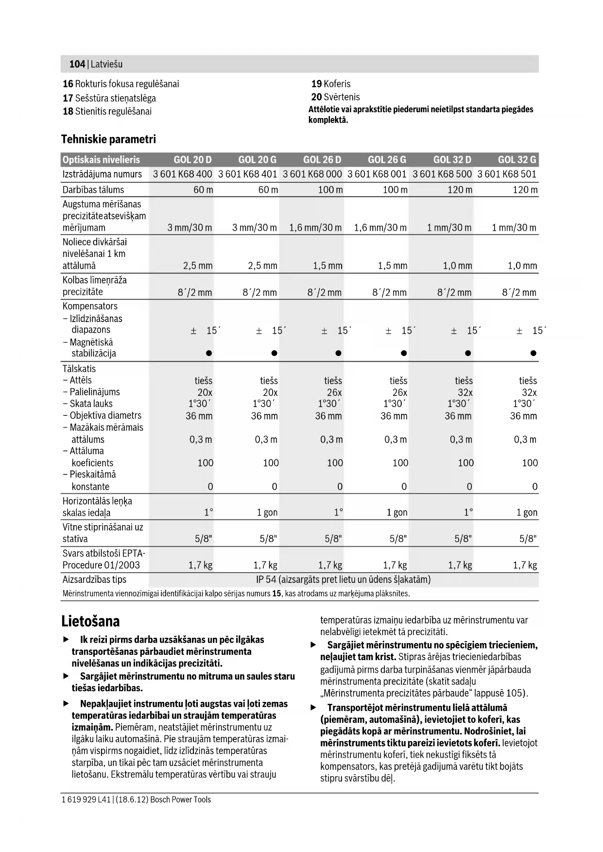 OBJ_BUCH-1239-002.book Page 103 Monday, June 18, 2012 10:51 AM104 | Latviešu 1 619 929 L41 | (18.6.12) Bosch Power Tools 16 Rokturis fokusa regulēšanai 17 Sešstūra stieņatslēga 18 Stienītis regulēšanai 19 Koferis 20 Svērtenis Attēlotie vai aprakstītie piederumi neietilpst standarta piegādes komplektā. Tehniskie parametri Lietošana f Ik reizi pirms darba uzsākšanas un pēc ilgākas transportēšanas pārbaudiet mērinstrumenta nivelēšanas un indikācijas precizitāti. f Sargājiet mērinstrumentu no mitruma un saules staru tiešas iedarbības. f Nepakļaujiet instrumentu ļoti augstas vai ļoti zemas temperatūras iedarbībai un straujām temperatūras izmaiņām. Piemēram, neatstājiet mērinstrumentu uz ilgāku laiku automašīnā. Pie straujām temperatūras izmai- ņām vispirms nogaidiet, līdz izlīdzinās temperatūras starpība, un tikai pēc tam uzsāciet mērinstrumenta lietošanu. Ekstremālu temperatūras vērtību vai strauju temperatūras izmaiņu iedarbība uz mērinstrumentu var nelabvēlīgi ietekmēt tā precizitāti. f Sargājiet mērinstrumentu no spēcīgiem triecieniem, neļaujiet tam krist. Stipras ārējas triecieniedarbības gadījumā pirms darba turpināšanas vienmēr jāpārbauda mērinstrumenta precizitāte (skatīt sadaļu „Mērinstrumenta precizitātes pārbaude“ lappusē 105). f Transportējot mērinstrumentu lielā attālumā (piemēram, automašīnā), ievietojiet to koferī, kas piegādāts kopā ar mērinstrumentu. Nodrošiniet, lai mērinstruments tiktu pareizi ievietots koferī. Ievietojot mērinstrumentu koferī, tiek nekustīgi fiksēts tā kompensators, kas pretējā gadījumā varētu tikt bojāts stipru svārstību dēļ. Optiskais nivelieris GOL 20 D GOL 20 G GOL 26 D GOL 26 G GOL 32 D GOL 32 G Izstrādājuma numurs 3 601 K68 400 3 601 K68 401 3 601 K68 000 3 601 K68 001 3 601 K68 500 3 601 K68 501 Darbības tālums 60 m 60 m 100 m 100 m 120 m 120 m Augstuma mērīšanas precizitāte atsevišķam mērījumam 3 mm/30 m 3 mm/30 m 1,6 mm/30 m 1,6 mm/30 m 1 mm/30 m 1 mm/30 m Noliece divkāršai nivelēšanai 1 km attālumā 2,5 mm 2,5 mm 1,5 mm 1,5 mm 1,0 mm 1,0 mm Kolbas līmeņrāža precizitāte 8´/2 mm 8´/2 mm 8´/2 mm 8´/2 mm 8´/2 mm 8´/2 mm Kompensators – Izlīdzināšanas diapazons – Magnētiskā stabilizācija ± 15´