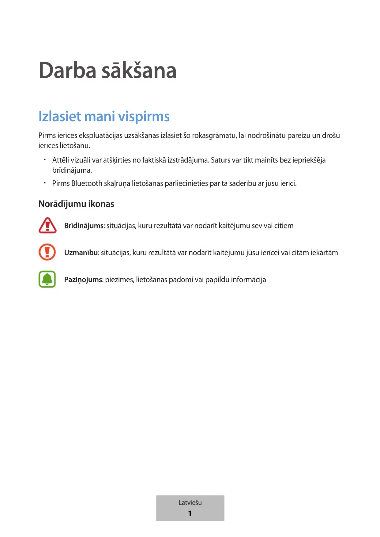 Darba sākšana Izlasiet mani vispirms Pirms ierīces ekspluatācijas uzsākšanas izlasiet šo rokasgrāmatu, lai nodrošinātu pareizu un drošu ierīces lietošanu.
