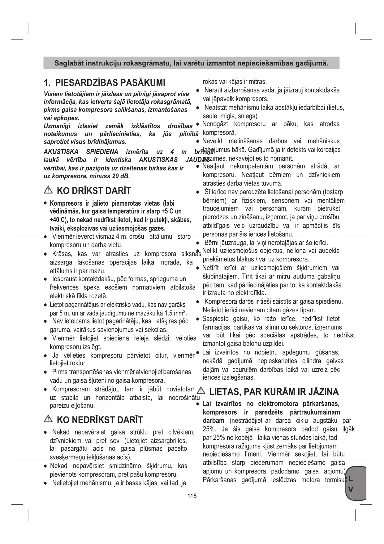 Visiemlietotājiemirjāizlasaunpilnīgijāsaprotvisa informācija,kasietvertašajālietotājarokasgrāmatā, pirmsgaisakompresorasalikšanas,izmantošanas vai apkopes. Uzmanīgi izlasiet zemāk izklāstītos drošības noteikumus un pārliecinieties, ka jūs pilnībā saprotietvisusbrīdinājumus. AKUSTISKA SPIEDIENA izmērīta uz 4 m brīvajā laukā vērtība ir identiska AKUSTISKAS JAUDAS vērtībai,kasirpaziņotauzdzeltenasbirkaskasir uzkompresora,mīnuss20dB.