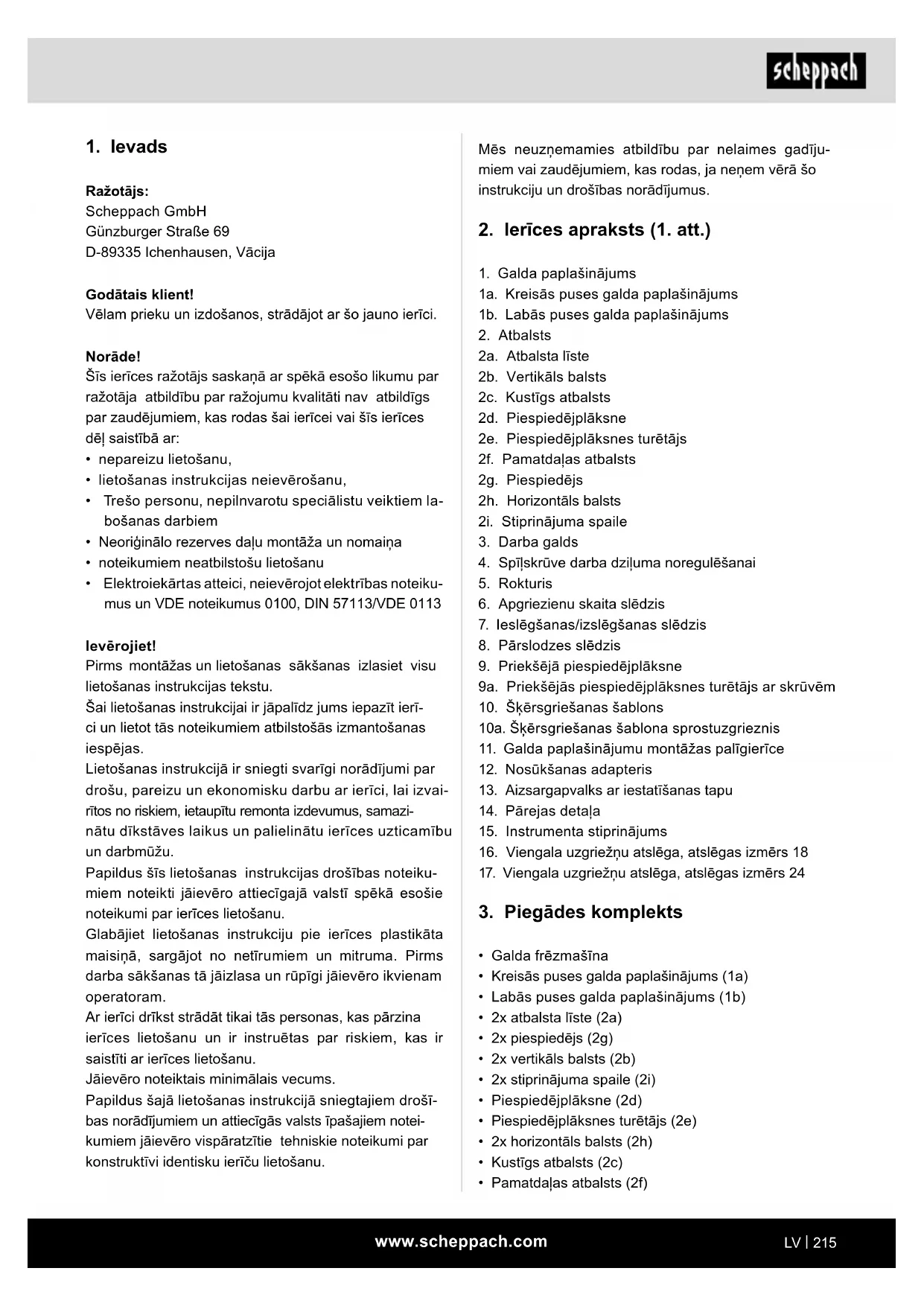 Ražotājs: Scheppach GmbH Günzburger Straße 69 D-89335 Ichenhausen, Vācija Godātais klient! Vēlam prieku un izdošanos, strādājot ar šo jauno ierīci. Norāde! Šīs ierīces ražotājs saskaņā ar spēkā esošo likumu par ražotāja atbildību par ražojumu kvalitāti nav atbildīgs par zaudējumiem, kas rodas šai ierīcei vai šīs ierīces dēļ saistībā ar: