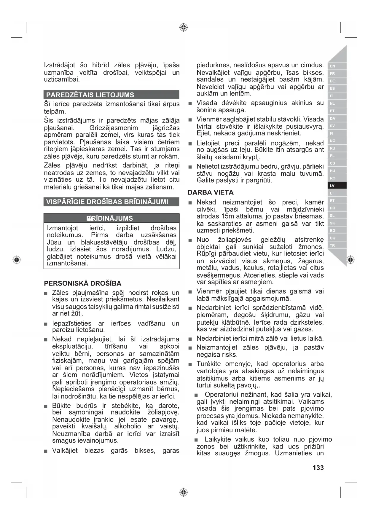 Šī ierīce paredzēta izmantošanai tikai ārpus telpām. Šis izstrādājums ir paredzēts mājas zālāja pļaušanai. Griezējasmenim jāgriežas apmēram paralēli zemei, virs kuras tas tiek pārvietots. Pļaušanas laikā visiem četriem riteņiem jāpieskaras zemei. Tas ir stumjams zāles pļāvējs, kuru paredzēts stumt ar rokām. Zāles pļāvēju nedrīkst darbināt, ja riteņi neatrodas uz zemes, to nevajadzētu vilkt vai vizināties uz tā. To nevajadzētu lietot citu materiālu griešanai kā tikai mājas zālienam. VISPĀRĪGIE DROŠĪBAS BRĪDINĀJUMI