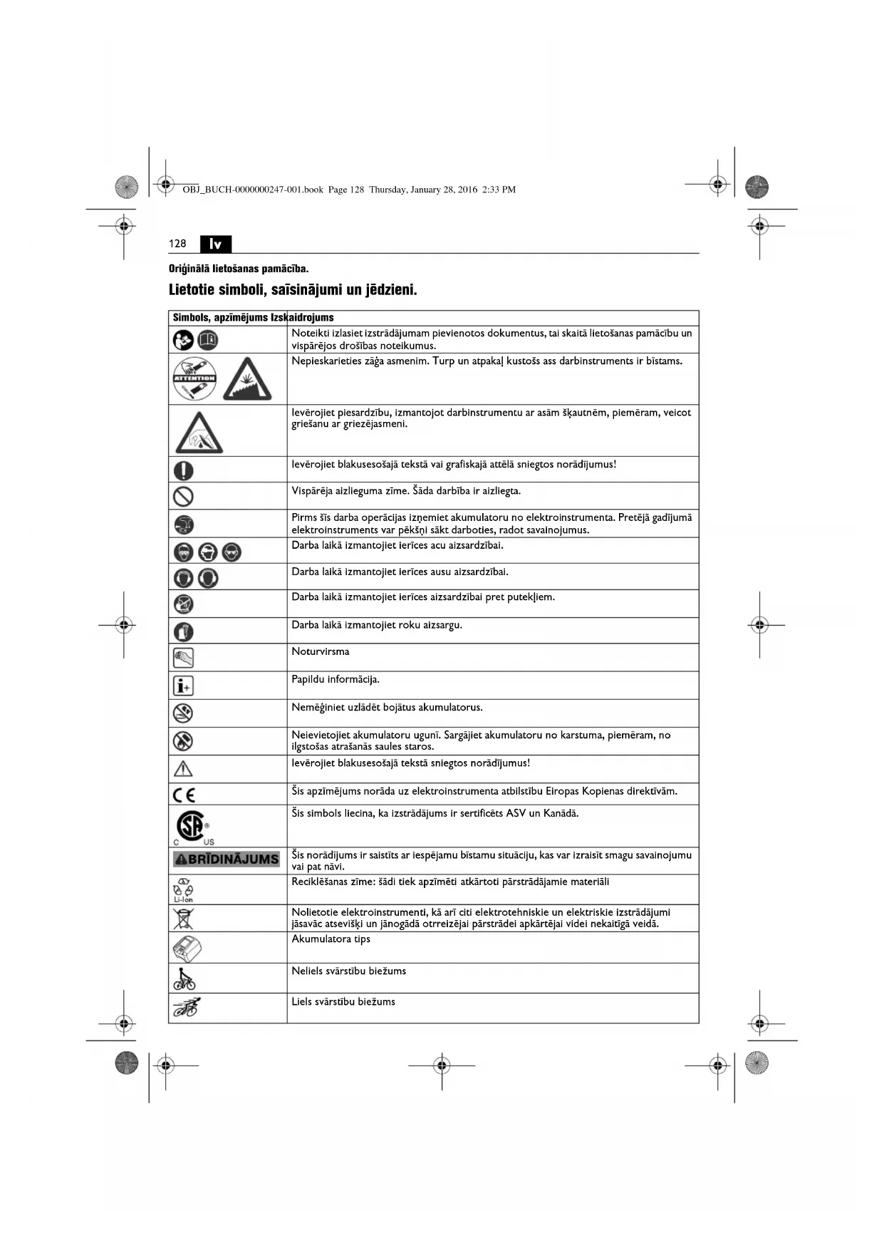 arba laikā izmantojiet ierīces ausu aizsardzībai. Darba laikā izmantojiet ierīces aizsardzībai pret putekļiem. Darba laikā izmantojiet roku aizsargu. Noturvirsma Papildu informācija. Nemēģiniet uzlādēt bojātus akumulatorus. Neievietojiet akumulatoru ugunī. Sargājiet akumulatoru no karstuma, piemēram, no ilgstošas atrašanās saules staros. Ievērojiet blakusesošajā tekstā sniegtos norādījumus! Šis apzīmējums norāda uz elektroinstrumenta atbilstību Eiropas Kopienas direktīvām. Šis simbols liecina, ka izstrādājums ir sertificēts ASV un Kanādā. Šis norādījums ir saistīts ar iespējamu bīstamu situāciju, kas var izraisīt smagu savainojumu vai pat nāvi. Reciklēšanas zīme: šādi tiek apzīmēti atkārtoti pārstrādājamie materiāli Nolietotie elektroinstrumenti, kā arī citi elektrotehniskie un elektriskie izstrādājumi jāsavāc atsevišķi un jānogādā otrreizējai pārstrādei apkārtējai videi nekaitīgā veidā. Akumulatora tips Neliels svārstību biežums Liels svārstību biežums OBJ_BUCH-0000000247-001.book Page 128 Thursday, January 28, 2016 2:33 PM129