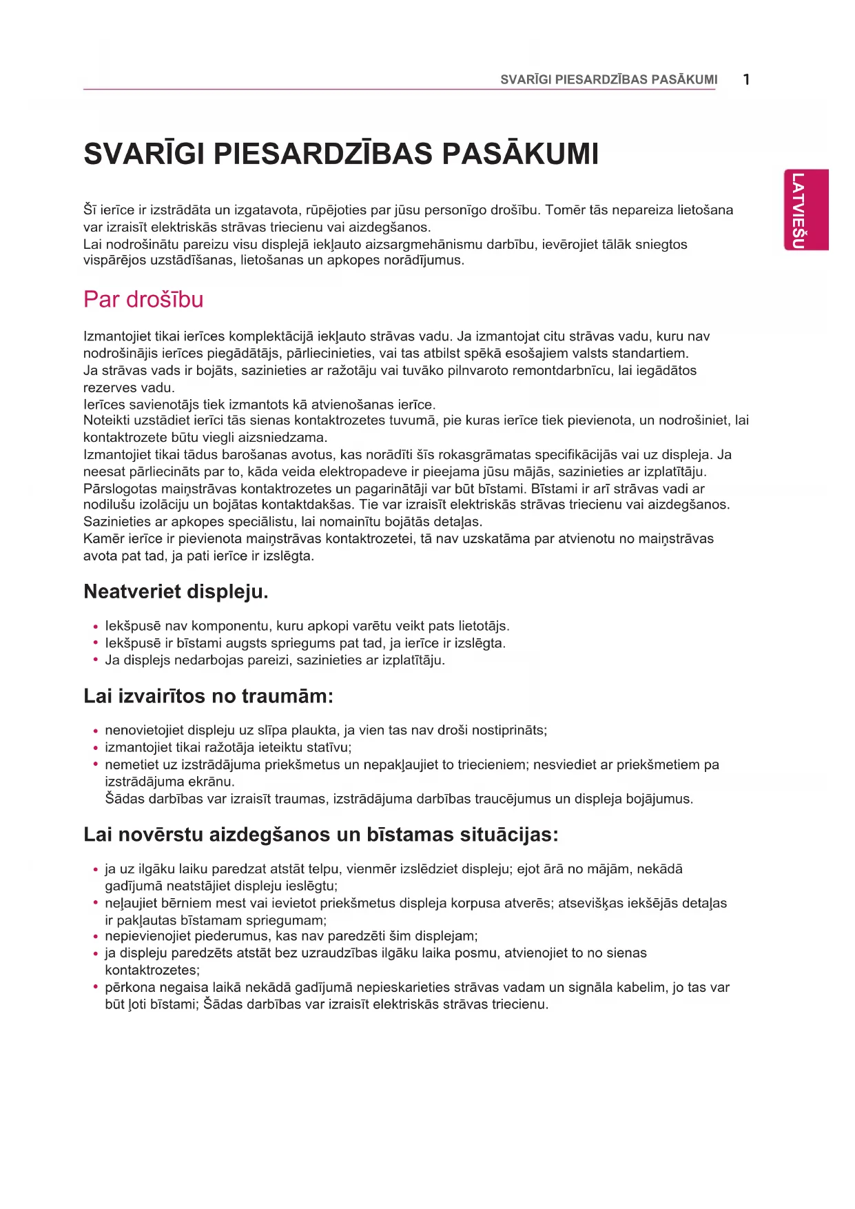 Šī ierīce ir izstrādāta un izgatavota, rūpējoties par jūsu personīgo drošību. Tomēr tās nepareiza lietošana var izraisīt elektriskās strāvas triecienu vai aizdegšanos.Lai nodrošinātu pareizu visu displejā iekļauto aizsargmehānismu darbību, ievērojiet tālāk sniegtos vispārējos uzstādīšanas, lietošanas un apkopes norādījumus. Par drošību Izmantojiet tikai ierīces komplektācijā iekļauto strāvas vadu. Ja izmantojat citu strāvas vadu, kuru nav nodrošinājis ierīces piegādātājs, pārliecinieties, vai tas atbilst spēkā esošajiem valsts standartiem.Ja strāvas vads ir bojāts, sazinieties ar ražotāju vai tuvāko pilnvaroto remontdarbnīcu, lai iegādātos rezerves vadu.Ierīces savienotājs tiek izmantots kā atvienošanas ierīce. Noteikti uzstādiet ierīci tās sienas kontaktrozetes tuvumā, pie kuras ierīce tiek pievienota, un nodrošiniet, lai kontaktrozete būtu viegli aizsniedzama.Izmantojiet tikai tādus barošanas avotus, kas norādīti šīs rokasgrāmatas specifikācijās vai uz displeja. Ja neesat pārliecināts par to, kāda veida elektropadeve ir pieejama jūsu mājās, sazinieties ar izplatītāju.Pārslogotas maiņstrāvas kontaktrozetes un pagarinātāji var būt bīstami. Bīstami ir arī strāvas vadi ar nodilušu izolāciju un bojātas kontaktdakšas. Tie var izraisīt elektriskās strāvas triecienu vai aizdegšanos.Sazinieties ar apkopes speciālistu, lai nomainītu bojātās detaļas.Kamēr ierīce ir pievienota maiņstrāvas kontaktrozetei, tā nav uzskatāma par atvienotu no maiņstrāvas avota pat tad, ja pati ierīce ir izslēgta. Neatveriet displeju.