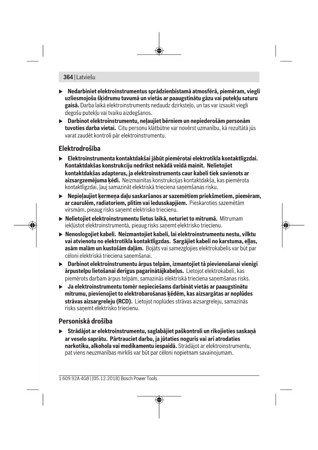 Izlasiet visus drošības noteikumus un instrukcijas, aplūkojiet ilustrācijas un iepazīstieties ar specifikācijām, kas tiek piegādātas kopā ar šo elektroinstrumentu. Šeit sniegto drošības noteikumu un instrukciju neievērošana var izraisīt aizdegšanos un būt par cēloni elektriskajam triecienam vai nopietnam savainojumam. Pēc izlasīšanas uzglabājiet šos noteikumus turpmākai izmantošanai. Drošības noteikumos lietotais apzīmējums "elektroinstruments" attiecas gan uz Jūsu tīkla elektroinstrumentiem (ar elektrokabeli), gan arī uz akumulatora elektroinstrumentiem (bez elektrokabeļa). Drošība darba vietā u Uzturiet savu darba vietu tīru un labi apgaismotu. Nekārtīgās un tumšās vietās var viegli notikt nelaimes gadījums. Bosch Power Tools 1 609 92A 4G8 | (05.12.2018)364 | Latviešu u Nedarbiniet elektroinstrumentus sprādzienbīstamā atmosfērā, piemēram, viegli uzliesmojošu šķidrumu tuvumā un vietās ar paaugstinātu gāzu vai putekļu saturu gaisā. Darba laikā elektroinstruments nedaudz dzirksteļo, un tas var izsaukt viegli degošu putekļu vai tvaiku aizdegšanos. u Darbinot elektroinstrumentu, neļaujiet bērniem un nepiederošām personām tuvoties darba vietai. Citu personu klātbūtne var novērst uzmanību, kā rezultātā jūs varat zaudēt kontroli pār elektroinstrumentu. Elektrodrošība u Elektroinstrumenta kontaktdakšai jābūt piemērotai elektrotīkla kontaktligzdai. Kontaktdakšas konstrukciju nedrīkst nekādā veidā mainīt. Nelietojiet kontaktdakšas adapterus, ja elektroinstruments caur kabeli tiek savienots ar aizsargzemējuma ķēdi. Neizmainītas konstrukcijas kontaktdakša, kas piemērota kontaktligzdai, ļauj samazināt elektriskā trieciena saņemšanas risku. u Nepieļaujiet ķermeņa daļu saskaršanos ar sazemētiem priekšmetiem, piemēram, ar caurulēm, radiatoriem, plītīm vai ledusskapjiem. Pieskaroties sazemētām virsmām, pieaug risks saņemt elektrisko triecienu. u Nelietojiet elektroinstrumentu lietus laikā, neturiet to mitrumā. Mitrumam iekļūstot elektroinstrumentā, pieaug risks saņemt elektrisko triecienu. u Nenoslogojiet kabeli. Neizmantojiet kabeli, lai elektroinstrumentu nestu, vilktu vai atvienotu no elektrotīkla kontaktligzdas. Sargājiet kabeli no karstuma, eļļas, asām malām un kustošām daļām. Bojāts vai samezglojies elektrokabelis var būt par cēloni elektriskā trieciena saņemšanai. u Darbinot elektroinstrumentu ārpus telpām, izmantojiet tā pievienošanai vienīgi ārpustelpu lietošanai derīgus pagarinātājkabeļus. Lietojot elektrokabeli, kas piemērots darbam ārpus telpām, samazinās elektriskā trieciena saņemšanas risks. u Ja elektroinstrumentu tomēr nepieciešams darbināt vietās ar paaugstinātu mitrumu, pievienojiet to elektrobarošanas ķēdēm, kas aizsargātas ar noplūdes strāvas aizsargreleju (RCD). Lietojot noplūdes strāvas aizsargreleju, samazinās risks saņemt elektrisko triecienu. Personiskā drošība u Strādājot ar elektroinstrumentu, saglabājiet paškontroli un rīkojieties saskaņā ar veselo saprātu. Pārtrauciet darbu, ja jūtaties noguris vai arī atrodaties narkotiku, alkohola vai medikamentu iespaidā. Strādājot ar elektroinstrumentu, pat viens neuzmanības mirklis var būt par cēloni nopietnam savainojumam. 1 609 92A 4G8 | (05.12.2018) Bosch Power ToolsLatviešu | 365 u Lietojiet individuālo darba aizsargaprīkojumu. Darba laikā vienmēr nēsājiet aizsargbrilles. Individuālā darba aizsargaprīkojuma (putekļu maskas, neslīdošu apavu un aizsargķiveres vai ausu aizsargu) lietošana noteiktos apstākļos ļaus samazināt savainošanās risku. u Nepieļaujiet elektroinstrumenta patvaļīgu ieslēgšanos. Pirms elektroinstrumenta pievienošanas elektrotīklam, akumulatora ievietošanas vai izņemšanas, kā arī pirms elektroinstrumenta pārnešanas pārliecinieties, ka tas ir izslēgts. Pārnesot elektroinstrumentu, ja pirksts atrodas uz ieslēdzēja, kā arī pievienojot to elektrobarošanas avotam laikā, kad elektroinstruments ir ieslēgts, var viegli notikt nelaimes gadījums. u Pirms elektroinstrumenta ieslēgšanas izņemiet no tā regulējošos rīkus vai atslēgas. Regulējošais rīks vai atslēga, kas ieslēgšanas brīdī atrodas elektroinstrumenta kustīgajās daļās, var radīt savainojumu. u Nesniedzieties pārāk tālu. Jebkurā situācijā saglabājiet līdzsvaru un stingru stāju. Tas atvieglos elektroinstrumenta vadīšanu neparedzētās situācijās. u Nēsājiet darbam piemērotu apģērbu. Darba laikā nenēsājiet brīvi plandošas drēbes un rotaslietas. Netuviniet garus matus un drēbes kustošām daļām. Vaļīgas drēbes, rotaslietas un gari mati var ieķerties kustošajās daļās. u Ja elektroinstrumenta konstrukcija ļauj tam pievienot putekļu uzsūkšanas vai savākšanas, nodrošiniet, lai tā būtu pievienota un tiktu pareizi lietota. Pielietojot putekļu savākšanu, samazinās to kaitīgā ietekme uz veselību. u Nepaļaujieties uz iemaņām, kas iegūtas, bieži lietojot instrumentus, neieslīgstiet pašapmierinātībā un neignorējiet instrumenta drošas lietošanas principus. Neuzmanīgas rīcības dēļ dažās sekundes daļās var gūt nopietnu savainojumu. Saudzīga apiešanās un darbs ar elektroinstrumentiem u Nepārslogojiet elektroinstrumentu. Ikvienam darbam izvēlieties piemērotu elektroinstrumentu. Elektroinstruments darbojas labāk un drošāk pie nominālās slodzes. u Nelietojiet elektroinstrumentu, ja to ar ieslēdzēja palīdzību nevar ieslēgt un izslēgt. Elektroinstruments, ko nevar ieslēgt un izslēgt, ir bīstams lietošanai un to nepieciešams remontēt. u Pirms elektroinstrumenta regulēšanas, piederumu nomaiņas vai novietošanas uzglabāšanai atvienojiet tā elektrokabeļa kontaktdakšu no barojošā elektrotīkla vai izņemiet no tā akumulatoru, ja tas ir izņemams. Šādi iespējams novērst elektroinstrumenta nejaušu ieslēgšanos. Bosch Power Tool