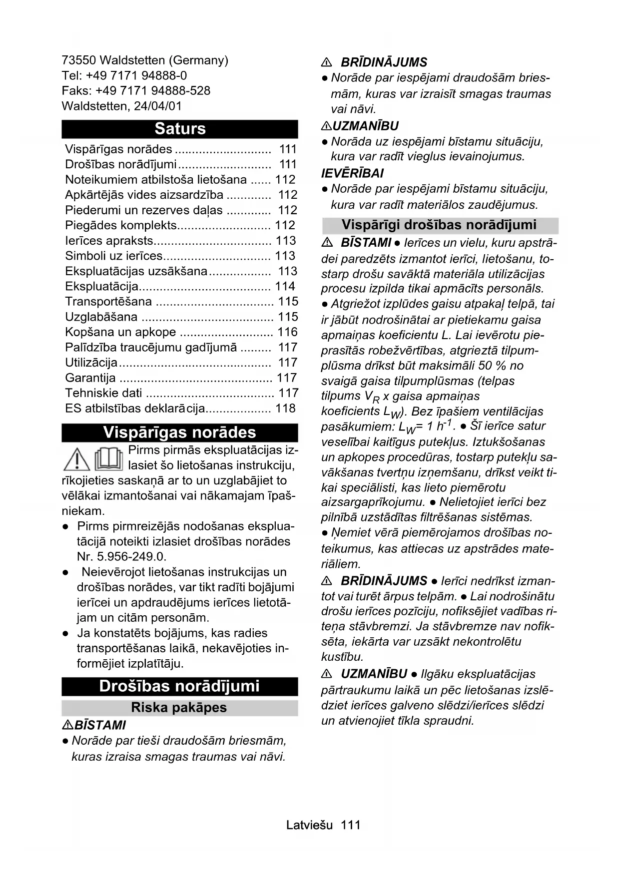 Kaabli pikkus m 10Latviešu 111 73550 Waldstetten (Germany) Tel: +49 7171 94888-0 Faks: +49 7171 94888-528 Waldstetten, 24/04/01 Saturs Vispārīgas norādes Pirms pirmās ekspluatācijas iz- lasiet šo lietošanas instrukciju, rīkojieties saskaņā ar to un uzglabājiet to vēlākai izmantošanai vai nākamajam īpaš- niekam. ● Pirms pirmreizējās nodošanas eksplua- tācijā noteikti izlasiet drošības norādes Nr. 5.956-249.0. ● Neievērojot lietošanas instrukcijas un drošības norādes, var tikt radīti bojājumi ierīcei un apdraudējums ierīces lietotā- jam un citām personām. ● Ja konstatēts bojājums, kas radies transportēšanas laikā, nekavējoties in- formējiet izplatītāju. Drošības norādījumi Riska pakāpes BĪSTAMI ● Norāde par tieši draudošām briesmām, kuras izraisa smagas traumas vai nāvi.