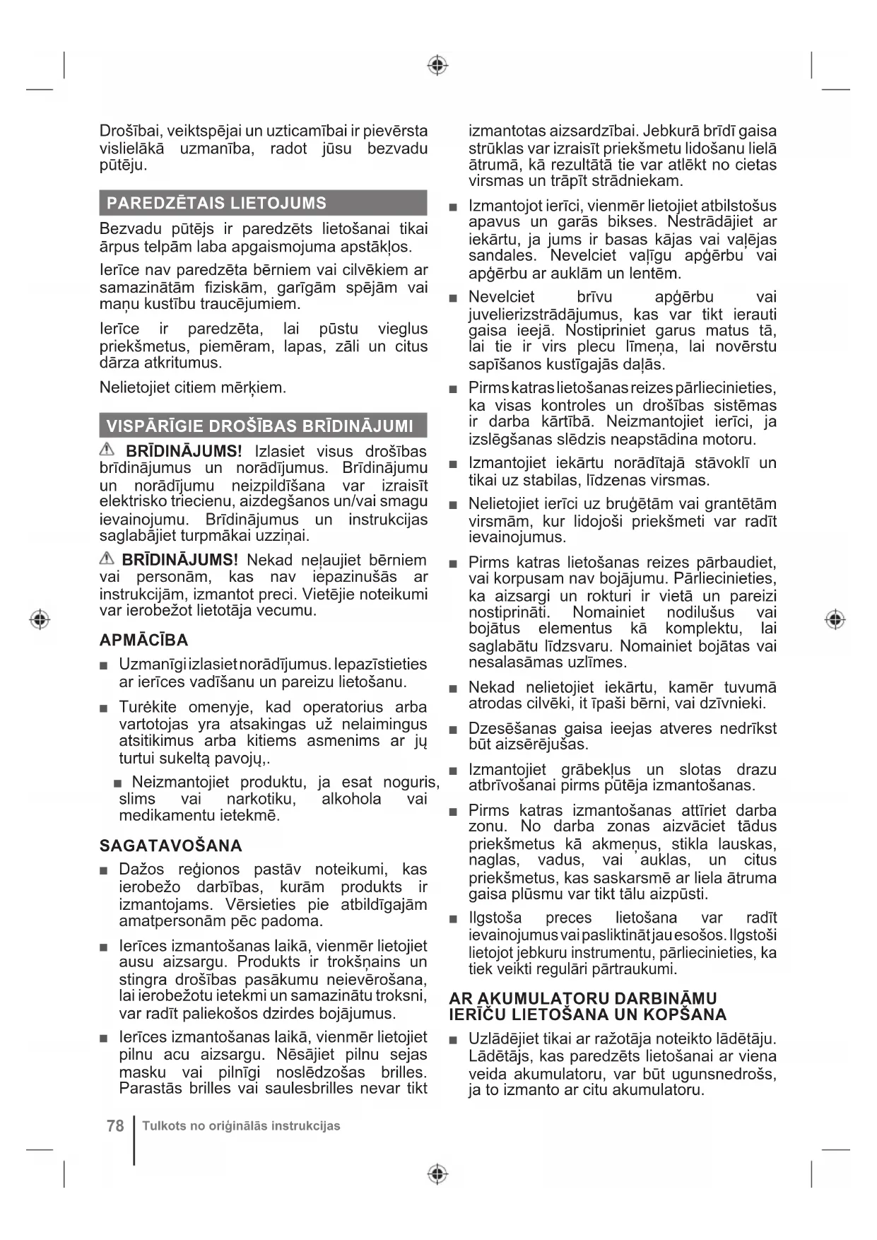 ■ Lietojiet elektriskos instrumentus tikai ar konkrētajai ierīcei paredzēto akumulatoru. Jebkura cita akumulatora lietošana var radīt ievainojumu un ugunsgrēka risku. ■ Kad nelietojat akumulatoru, neturiet to citu metāla priekšmetu tuvumā, piemēram: papīra saspraudes, monētas, atslēgas, naglas, skrūves vai citi sīki metāla priekšmeti, kas var veidot savienojumu starp spailēm. Akumulatora spaiļu īsslēgums var radīt aizdegšanos vai ugunsgrēku. ■ Nepareizas rīcības gadījumā no akumulatora var izkļūt šķidrums; izvairieties no saskares ar to. Nejaušas saskares gadījumā skalojiet skarto vietu ar ūdeni. Ja šķidrums iekļūst acīs, nekavējoties meklējiet medicīnisko palīdzību. No akumulatora izkļuvušais šķidrums var izraisīt kairinājumu vai apdegumus. ■ Neizmantojiet akumulatoru bloku, kas ir bojāts vai pārveidots. Bojāts vai pārveidots akumulatoru bloks var izraisīt neparedzamu darbību, kas var izraisīt uzliesmošanu, sprādzienu vai ievainojumu risku. ■ Nepakļaujiet akumulatoru bloku vai instrumentu liesmu vai paaugstinātas temperatūras iedarbībai. Pakļaujot liesmām vai paaugstinātai temperatūrai virs 130°C var izraisīt sprādzienu. ■ Ievērojiet visas lādēšanas instrukcijas un nelādējiet akumulatoru bloku vai instrumentu, ja temperatūra ir ārpus diapazona, kas norādīts instrukcijās. Nepareiza lādēšana vai lādēšana temperatūrā, kas ir ārpus norādītā diapazona, var izraisīt akumulatora bojājumus un palielināt uzliesmošanas risku. EKSPLUATĀCIJA ■ Lietojiet ierīci saprātīgās dienas daļās – nelietojiet to agri no rīta vai vēlā naktī, kad jūs varat traucēt citiem cilvēkiem. ■ Nelietojiet ierīci apstākļos, kur tā var uzsprāgt. ■ Nelietojiet ierīci sliktos laika apstākļos, it īpaši, kad pastāv zibens riski. ■ Pārliecinieties, ka tuvumā stāvošie -bērni un dzīvnieki ir 15 m attālumā no jūsu darbošanās vietas. Ja kāds ienāk zonā, apturiet preci. ■ Neizmantojiet pūtēju slikta apgaismojuma apstākļos. Lietotājam jābūt pilnai redzamībai pār darba zonu, lai spētu identificēt iespējamus draudus. ■ Līdzīgas ierīces izmantošana tuvumā palielina gan risku sabojāt dzirdi, gan iespēju, ka otrs cilvēks ieies jūsu darba zonā. ■ Slīpumā kājas vienmēr turiet stabilā pozīcijā. Ejiet, nekādā gadījumā neskrieniet. ■ Visada tvirtai stovėkite ir išlaikykite pusiausvyrą. Nepersitempkite. Persitempę galite prarasti pusiausvyrą. ■ Nekad nelietojiet ierīci, ja ir bojāti aizsargi vai pārsegi vai arī drošības ierīces neatrodas vietā. ■ Lai samazinātu tādu ievainojumu risku, kas saistīti ar saskarsmi ar rotējošām daļām, vienmēr izslēdziet produktu un noņemiet akumulatoru bloku. Pārliecinieties, ka visas kustīgās daļas ir pilnīgi apstājušās: ● pirms atstāt izstrādājumu bez uzraudzības ● pirms nosprostojumu tīrīšanas ● pirms iekārtas pārbaudes, tīrīšanas vai labošanas ● pirms produkta pārbaudes pēc atsitiena pret svešķermeni ● ja iekārta sāk neparasti vibrēt (pārbaudiet nekavējoties). ■ Negadījumu vai saplīšanas gadījumā nekavējoties izslēdziet un noņemiet akumulatora bloku. Neizmantojiet izstrādājumu līdz tas nav pilnībā pārbaudīts pilnvarotā servisa centrā. ■ Nepārveidojiet ierīci un nelietojiet detaļas un aksesuārus, kurus nav ieteicies ražotājs. ■ Ja ierīce tiek nomesta, tā ir saskārusies ar smagu triecienu vai tā sāk nevaldāmi vibrēt, nekavējoties izslēdziet ierīci un centieties atrast bojājumu vai arī cēloni šādai vibrācijai. Jebkuriem bojājumiem ir jāveic atbilstošs remonts vai daļu nomaiņa pilnvarotā servisa centrā. BRĪDINĀJUMS! Produkta komplektācijā var būt uzkabe. Uzmanīgi uzstādiet drošības jostas, lai palīdzētu ērti atbalstīt ierīces svaru. Identifi cējiet ātrās atbrīvošanas mehānismu un iemācieties to lietot pirms jūs esat sācis lietot šo ierīci. Šī mehānisma pareiza izmantošana var pasargāt jūs no ievainojumiem ārkārtas gadījumos. Nekad nevalkājiet papildus apģērbu virs uzkabes, citādi Jūs ierobežosiet piekļuvi ātrās atbrīvošanas mehānismam. PŪTĒJA DROŠĪBAS BRĪDINĀJUMI ■ Putekļainos apstākļos valkājiet sejas filtra masku, lai mazinātu traumu riskus saistībā ar putekļu ieelpošanu.80 Tulkots no oriģinālās instrukcijas ■ Putekļainos apstākļos viegli samitriniet virsmas. ■ Nedarbiniet mašīnu atvērtu logu tuvumā. ■ Izmantojiet visu pūtēja sprauslas pagarinājumu, lai gaisa plūsma var darboties tuvu pie zemes un strādāt efektīvi. ■ Nevērsiet pūtēja sprauslu cilvēku vai dzīvnieku virzienā. ■ Nekādā gadījumā nelieciet priekšmetus pūtēja caurulēs. ■ Nenovietojiet izstrādājumu uz drazu kaudzes vai tās tuvumā. Tie var tikt iesūkti gaisa padevē un sabojāt ierīci.