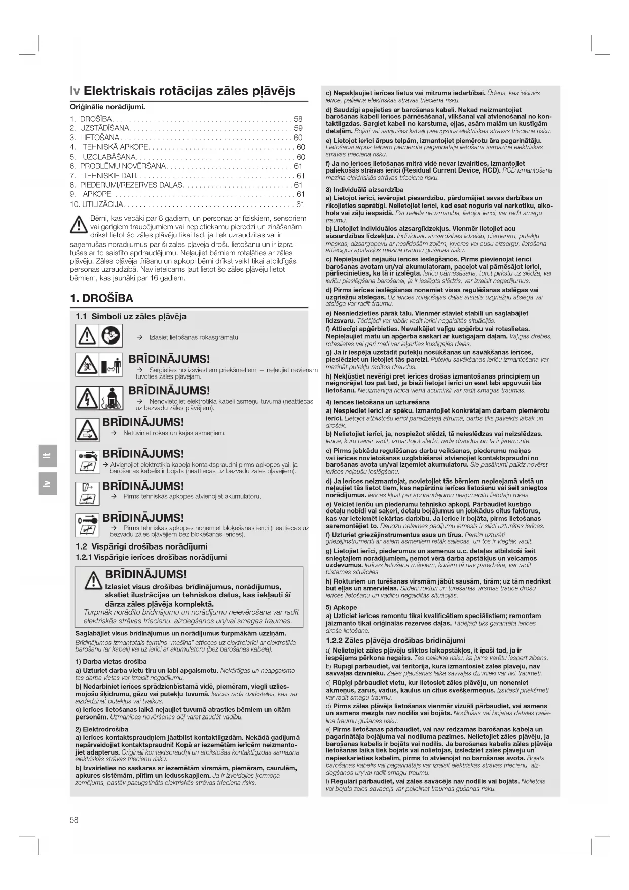 BRĪDINĀJUMS! Izlasiet visus drošības brīdinājumus, norādījumus, skatiet ilustrācijas un tehniskos datus, kas iekļauti šī dārza zāles pļāvēja komplektā. Turpmāk norādīto brīdinājumu un norādījumu neievērošana var radīt elektriskās strāvas triecienu, aizdegšanos un/vai smagas traumas. Saglabājiet visus brīdinājumus un norādījumus turpmākām uzziņām.Brīdinājumos izmantotais termins “mašīna” attiecas uz elektroierīci ar elektrotīkla barošanu(ar kabeli) vai uz ierīci ar akumulatoru(bez barošanas kabeļa).1) Darba vietas drošība a) Uzturiet darba vietu tīru un labi apgaismotu. Nekārtīgas un neapgaismo- tas darba vietas var izraisīt negadījumu.b)Nedarbiniet ierīces sprādzienbīstamā vidē, piemēram, viegli uzlies-mojošu šķidrumu, gāzu vai putekļu tuvumā. Ierīces rada dzirksteles, kas var aizdedzināt putekļus vai tvaikus.c) Ierīces lietošanas laikā neļaujiet tuvumā atrasties bērniem un citām personām. Uzmanības novēršanas dēļ varat zaudēt vadību.2) Elektrodrošībaa) Ierīces kontaktspraudņiem jāatbilst kontaktligzdām. Nekādā gadījumā nepārveidojiet kontaktspraudni! Kopā ar iezemētām ierīcēm neizmanto-jiet adapterus. Oriģināli kontaktspraudņi un atbilstošas kontaktligzdas samazina elektriskās strāvas triecienu risku.b) Izvairieties no saskares ar iezemētām virsmām, piemēram, caurulēm, apkures sistēmām, plītīm un ledusskapjiem. Ja ir izveidojies ķermeņa zemējums, pastāv paaugstināts elektriskās strāvas trieciena risks. c) Nepakļaujiet ierīces lietus vai mitruma iedarbībai. Ūdens, kas iekļuvis ierīcē, palielina elektriskās strāvas trieciena risku.d) Saudzīgi apejieties ar barošanas kabeli. Nekad neizmantojiet barošanas kabeli ierīces pārnēsāšanai, vilkšanai vai atvienošanai no kon-taktligzdas. Sargiet kabeli no karstuma, eļļas, asām malām un kustīgām detaļām. Bojāti vai savijušies kabeļi paaugstina elektriskās strāvas trieciena risku.e) Lietojot ierīci ārpus telpām, izmantojiet piemērotu āra pagarinātāju. Lietošanai ārpus telpām piemērota pagarinātāja lietošana samazina elektriskās strāvas trieciena risku.f) Ja no ierīces lietošanas mitrā vidē nevar izvairīties, izmantojiet paliekošās strāvas ierīci(Residual Current Device, RCD). RCD izmantošana mazina elektriskās strāvas trieciena risku.3) Individuālā aizsardzībaa) Lietojot ierīci, ievērojiet piesardzību, pārdomājiet savas darbības un rīkojieties saprātīgi. Nelietojiet ierīci, kad esat noguris vai narkotiku, alko-hola vai zāļu iespaidā. Pat neliela neuzmanība, lietojot ierīci, var radīt smagu traumu.b) Lietojiet individuālos aizsarglīdzekļus. Vienmēr lietojiet acu aizsardzības līdzekļus. Individuālo aizsardzības līdzekļu, piemēram, putekļu maskas, aizsargapavu ar neslīdošām zolēm, ķiveres vai ausu aizsargu, lietošana attiecīgos apstākļos mazina traumu gūšanas risku.c) Nepieļaujiet nejaušu ierīces ieslēgšanos. Pirms pievienojat ierīci barošanas avotam un/vai akumulatoram, paceļot vai pārnēsājot ierīci, pārliecinieties, ka tā ir izslēgta. Ierīču pārnēsāšana, turot pirkstu uz slēdža, vai ierīču pieslēgšana barošanai, ja ir ieslēgts slēdzis, var izraisīt negadījumus.d) Pirms ierīces ieslēgšanas noņemiet visas regulēšanas atslēgas vai uzgriežņu atslēgas. Uz ierīces rotējošajās daļas atstāta uzgriežņu atslēga vai atslēga var radīt traumu.e) Nesniedzieties pārāk tālu. Vienmēr stāviet stabili un saglabājiet līdzsvaru. Tādējādi var labāk vadīt ierīci negaidītās situācijās.f) Attiecīgi apģērbieties. Nevalkājiet vaļīgu apģērbu vai rotaslietas. Nepieļaujiet matu un apģērba saskari ar kustīgajām daļām. Vaļīgas drēbes, rotaslietas vai gari mati var ieķerties kustīgajās daļās.g) Ja ir iespēja uzstādīt putekļu nosūkšanas un savākšanas ierīces, pieslēdziet un lietojiet tās pareizi. Putekļu savākšanas ierīču izmantošana var mazināt putekļu radītos draudus.h)Nekļūstiet nevērīgi pret ierīces drošas izmantošanas principiem un neignorējiet tos pat tad, ja bieži lietojat ierīci un esat labi apguvuši tās lietošanu. Neuzmanīga rīcība vienā acumirklī var radīt smagas traumas.4) Ierīces lietošana un uzturēšanaa) Nespiediet ierīci ar spēku. Izmantojiet konkrētajam darbam piemērotu ierīci. Lietojot atbilstošu ierīci paredzētajā ātrumā, darbs tiks paveikts labāk un drošāk.b) Nelietojiet ierīci, ja, nospiežot slēdzi, tā neieslēdzas vai neizslēdzas. Ierīce, kuru nevar vadīt, izmantojot slēdzi, rada draudus un tā ir jāremontē.c)Pirms jebkādu regulēšanas darbu veikšanas, piederumu maiņas vai ierīces novietošanas uzglabāšanai atvienojiet kontaktspraudni no barošanas avota un/vai izņemiet akumulatoru. Šie pasākumi palīdz novērst ierīces nejaušu ieslēgšanu.d) Ja ierīces neizmantojat, novietojiet tās bērniem nepieejamā vietā un neļaujiet tās lietot tiem, kas nepārzina ierīces lietošanu vai šeit sniegtos norādījumus. Ierīces kļūst par apdraudējumu neapmācītu lietotāju rokās.e) Veiciet ierīču un piederumu tehnisko apkopi. Pārbaudiet kustīgo detaļu nobīdi vai saķeri, detaļu bojājumus un jebkādus citus faktorus, kas var ietekmēt iekārtas darbību. Ja ierīce ir bojāta, pirms lietošanas saremontējiet to. Daudzu nelaimes gadījumu iemesls ir slikti uzturētas ierīces.f) Uzturiet griezējinstrumentus asus un tīrus. Pareizi uzturēti griezējinstrumenti ar asiem asmeņiem retāk saliecas, un tos ir vieglāk vadīt.g)Lietojiet ierīci, piederumus un asmeņus u.c. detaļas atbilstoši šeit sniegtajiem norādījumiem, ņemot vērā darba apstākļus un veicamos uzdevumus. Ierīces lietošana mērķiem, kuriem tā nav paredzēta, var radīt bīstamas situācijas.h) Rokturiem un turēšanas virsmām jābūt sausām, tīrām; uz tām nedrīkst būt eļļas un s