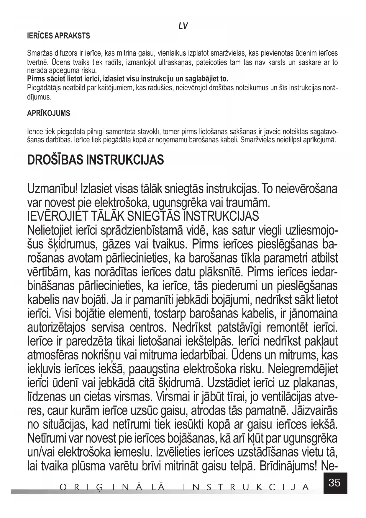 Smaržas difuzors ir ierīce, kas mitrina gaisu, vienlaikus izplatot smaržvielas, kas pievienotas ūdenim ierīces tvertnē. Ūdens tvaiks tiek radīts, izmantojot ultraskaņas, pateicoties tam tas nav karsts un saskare ar to nerada apdeguma risku. Pirms sāciet lietot ierīci, izlasiet visu instrukciju un saglabājiet to. Piegādātājs neatbild par kaitējumiem, kas radušies, neievērojot drošības noteikumus un šīs instrukcijas norā- dījumus. APRĪKOJUMS Ierīce tiek piegādāta pilnīgi samontētā stāvoklī, tomēr pirms lietošanas sākšanas ir jāveic noteiktas sagatavo- šanas darbības. Ierīce tiek piegādāta kopā ar noņemamu barošanas kabeli. Smaržvielas neietilpst aprīkojumā.