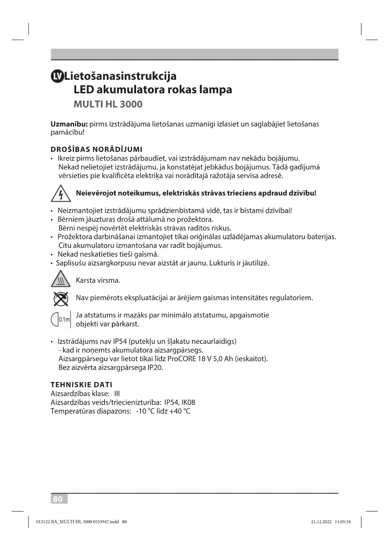- Izstrādājums nav IP54 (putekļu un šļakatu necaurlaidīgs) - kad ir noņemts akumulatora aizsargpārsegs. Aizsargpārsegu var lietot tikai līdz ProCORE 18 V 5,0 Ah (ieskaitot). Bez aizvērta aizsargpārsega IP20. TEHNISKIE DATI Aizsardzības klase: III Aizsardzības veids/triecienizturība: IP54, IK08 Temperatūras diapazons: -10 °C līdz +40 °C 013122 BA_MULTI HL 3000 0533947.indd 80013122 BA_MULTI HL 3000 0533947.indd 80 21.12.2022 11:05:3421.12.2022 11:05:3481 MULTI HL 3000 Lietošanas instrukcija Tips: MULTI HL 3000 Saderīgie akumulatoru tipi: Pārskatu par visiem pieejamajiem adapteriem un atbilstošajām baterijām varat atrast mūsu mājaslapā www.brennenstuhl.com Maks. projicētais laukums: 183,63 cm