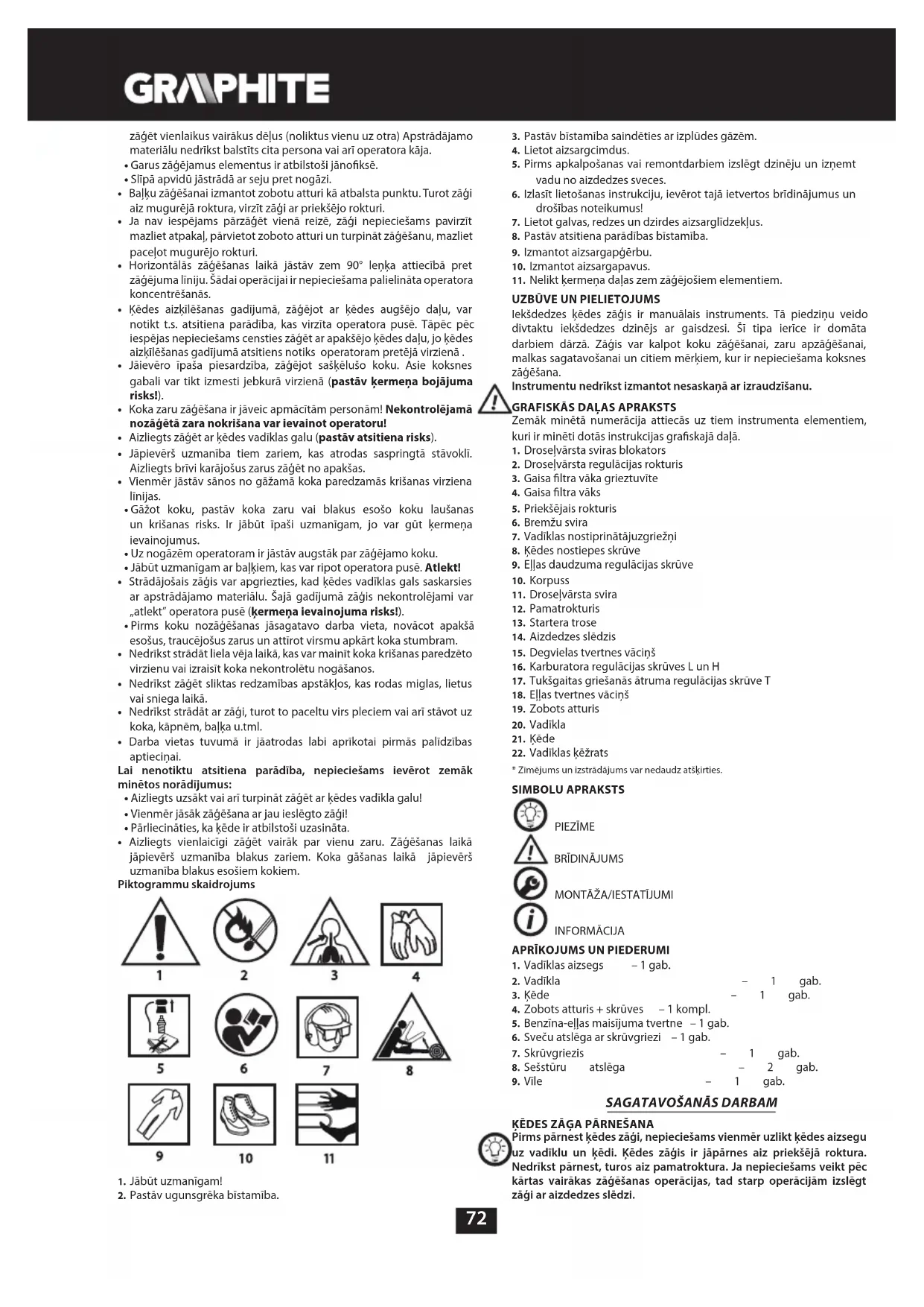- Aizliegts vienlaicīgi zāģēt vairāk par vienu zaru. Zāģēšanas laikā jāpievērš uzmanība blakus zariem. Koka gāšanas laikā jāpievērš uzmanība blakus esošiem kokiem. Piktogrammu skaidrojums