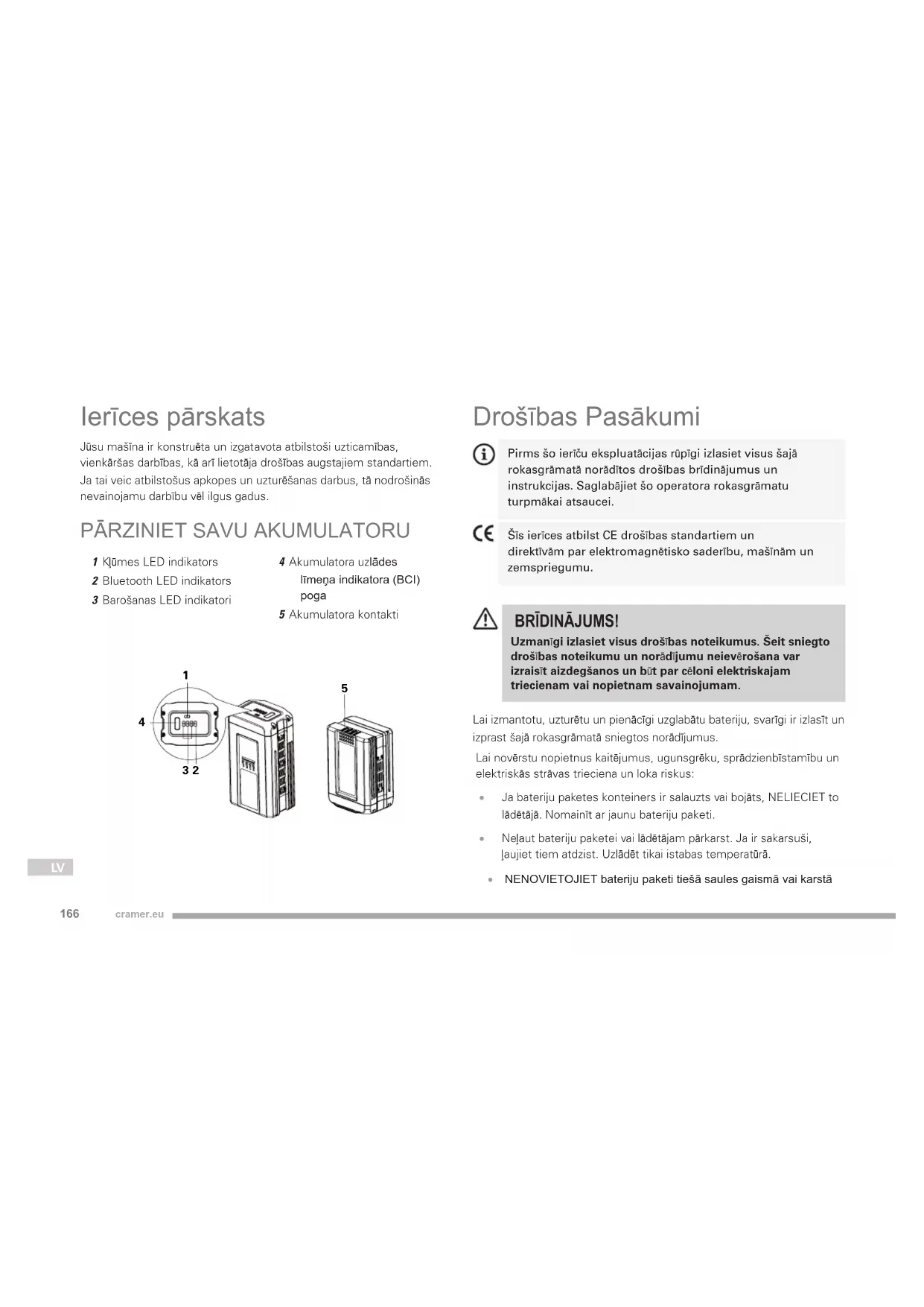 PIEZĪME! Ja mirgo LED5, akumulatora bloks nedarbosies. Jānogaida, līdz akumulatora bloka temperatūra atgriežas normālā stāvoklī. Akumulatora savienošana ar lietotni „GreenFleet” Lietotne ir izstrādāta tā, lai lietotājs iegūtu papildu vērtību. Lejupielādējiet lietotni un uzziniet, kā „GreenFleet” var palīdzēt labāk strukturēt darba kārtību un padarīt darbu efektīvāku. Lietotni regulē atsevišķi noteikumi, ar kuriem var iepazīties, lasot informāciju par mobilo lietotni. Lietotni var lejupielādēt tīmekļa vietnē: IOS Android Menčių Priežiūra BRĪDINĀJUMS! Nekādā gadījumā neļaujiet bremžu šķidrumam, gazolīna un benzīna produktiem, pret rūsas un korozijas aizsardzības līdzekļiem, u.c. nonākt saskarē ar plastmasas detaļām. Tie satur ķimikālijas, kas var bojāt, pasliktināt kvalitāti vai iznīcināt plastmasu. BRĪDINĀJUMS! Lai novērstu smagus ievainojumus, tīrīšanas vai apkopes laikā vienmēr izņemiet bateriju paketi no instrumenta.171 cramer.eu