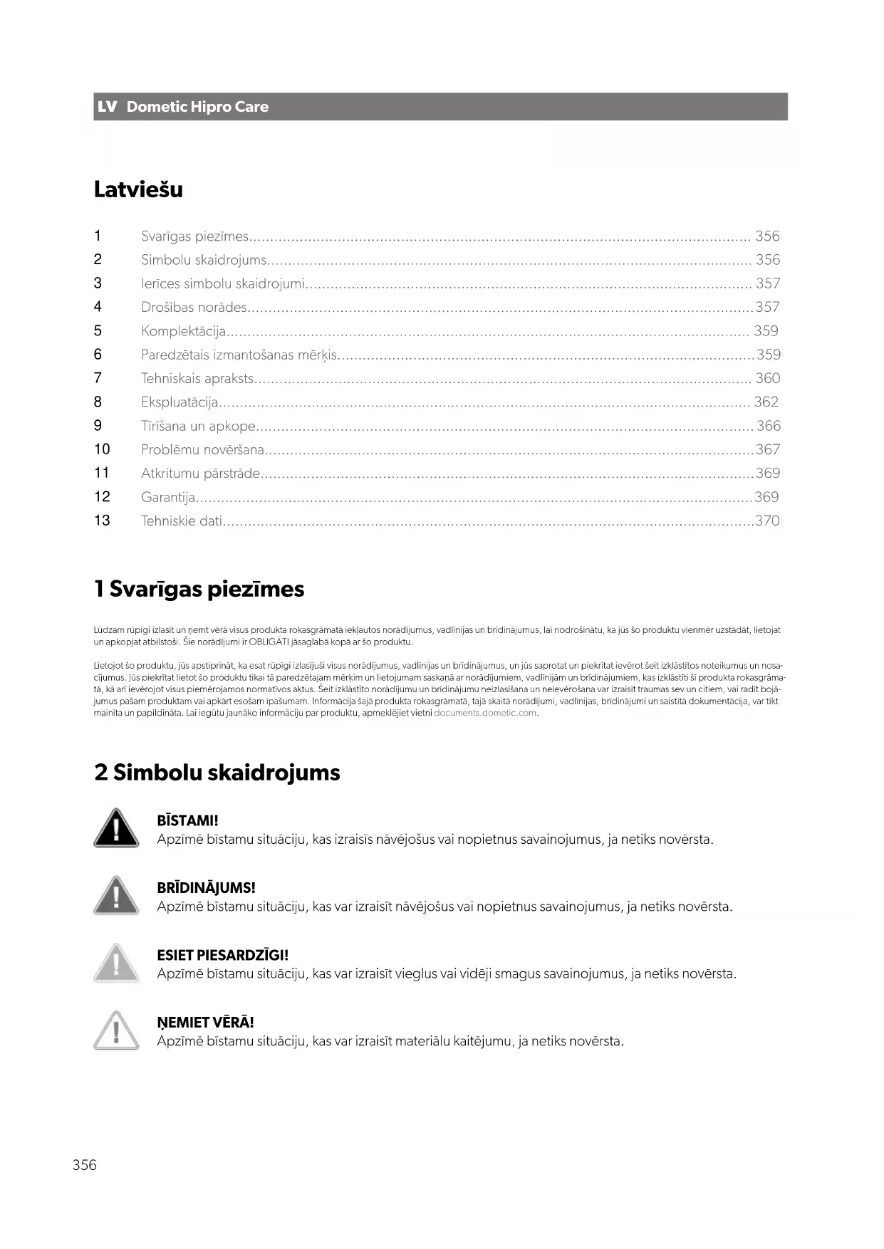 Tehniskie dati..............................................................................................................................370 1 Svarīgas piezīmes Lūdzam rūpīgi izlasīt un ņemt vērā visus produkta rokasgrāmatā iekļautos norādījumus, vadlīnijas un brīdinājumus, lai nodrošinātu, ka jūs šo produktu vienmēr uzstādāt, lietojat un apkopjat atbilstoši. Šie norādījumi ir OBLIGĀTI jāsaglabā kopā ar šo produktu. Lietojot šo produktu, jūs apstiprināt, ka esat rūpīgi izlasījuši visus norādījumus, vadlīnijas un brīdinājumus, un jūs saprotat un piekrītat ievērot šeit izklāstītos noteikumus un nosa- cījumus. Jūs piekrītat lietot šo produktu tikai tā paredzētajam mērķim un lietojumam saskaņā ar norādījumiem, vadlīnijām un brīdinājumiem, kas izklāstīti šī produkta rokasgrāma- tā, kā arī ievērojot visus piemērojamos normatīvos aktus. Šeit izklāstīto norādījumu un brīdinājumu neizlasīšana un neievērošana var izraisīt traumas sev un citiem, vai radīt bojā- jumus pašam produktam vai apkārt esošam īpašumam. Informācija šajā produkta rokasgrāmatā, tajā skaitā norādījumi, vadlīnijas, brīdinājumi un saistītā dokumentācija, var tikt mainīta un papildināta. Lai iegūtu jaunāko informāciju par produktu, apmeklējiet vietni documents.dometic.com. 2 Simbolu skaidrojums BĪSTAMI! Apzīmē bīstamu situāciju, kas izraisīs nāvējošus vai nopietnus savainojumus, ja netiks novērsta. BRĪDINĀJUMS! Apzīmē bīstamu situāciju, kas var izraisīt nāvējošus vai nopietnus savainojumus, ja netiks novērsta. ESIET PIESARDZĪGI! Apzīmē bīstamu situāciju, kas var izraisīt vieglus vai vidēji smagus savainojumus, ja netiks novērsta. ŅEMIET VĒRĀ! Apzīmē bīstamu situāciju, kas var izraisīt materiālu kaitējumu, ja netiks novērsta. 356Dometic Hipro CareLV PIEZĪME Papildu informācija produkta lietošanai. 3 Ierīces simbolu skaidrojumi Ugunsgrēka risks / Ugunsbīstami materiāli 4 Drošības norādes Vispārīga drošība BRĪDINĀJUMS! Nāvējoša elektrošoka risks