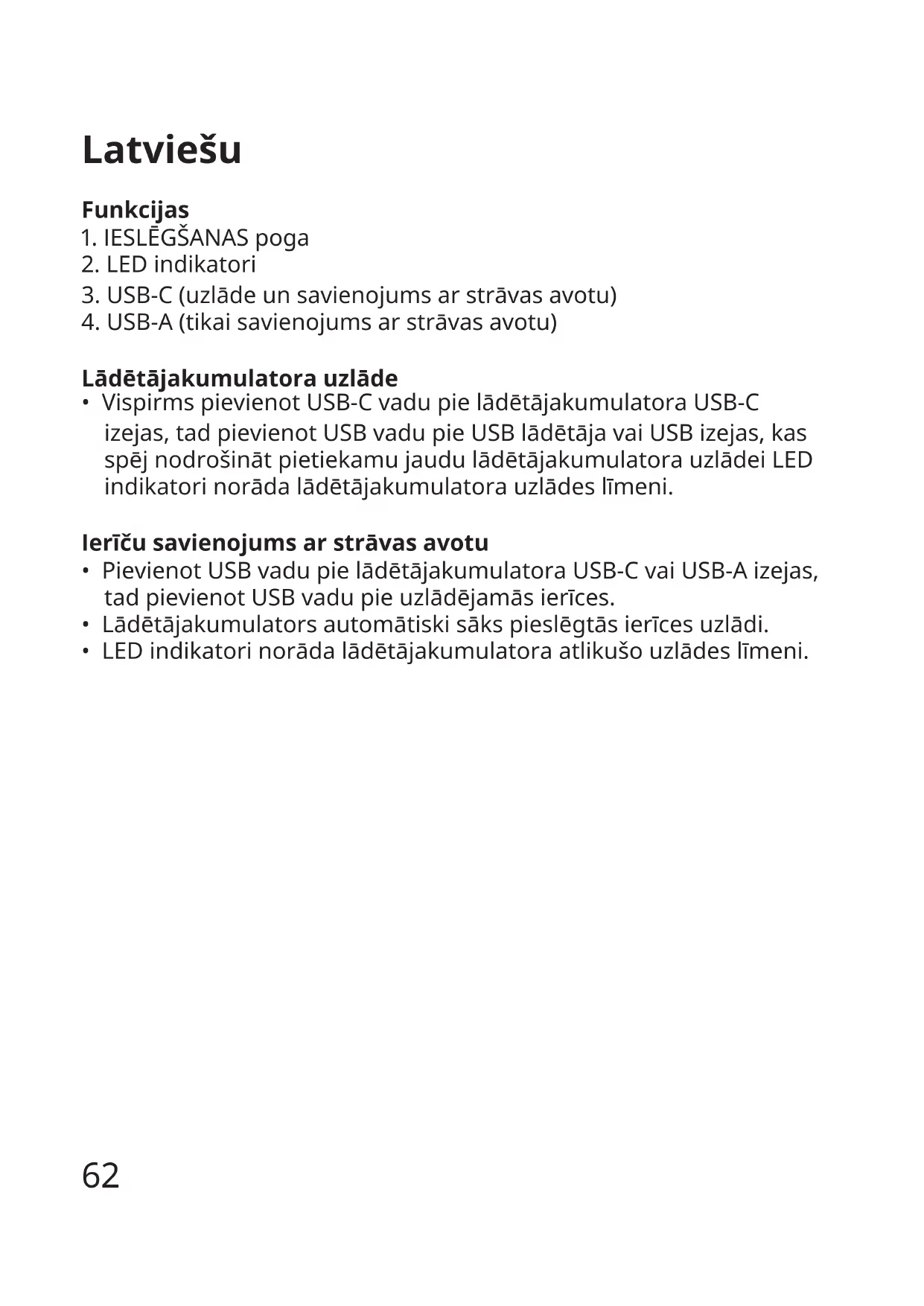 - Vispirms pievienot USB-C vadu pie lādētājakumulatora USB-C izejas, tad pievienot USB vadu pie USB lādētāja vai USB izejas, kas spēj nodrošināt pietiekamu jaudu lādētājakumulatora uzlādei LED indikatori norāda lādētājakumulatora uzlādes līmeni. Ierīčusavienojumsarstrāvasavotu