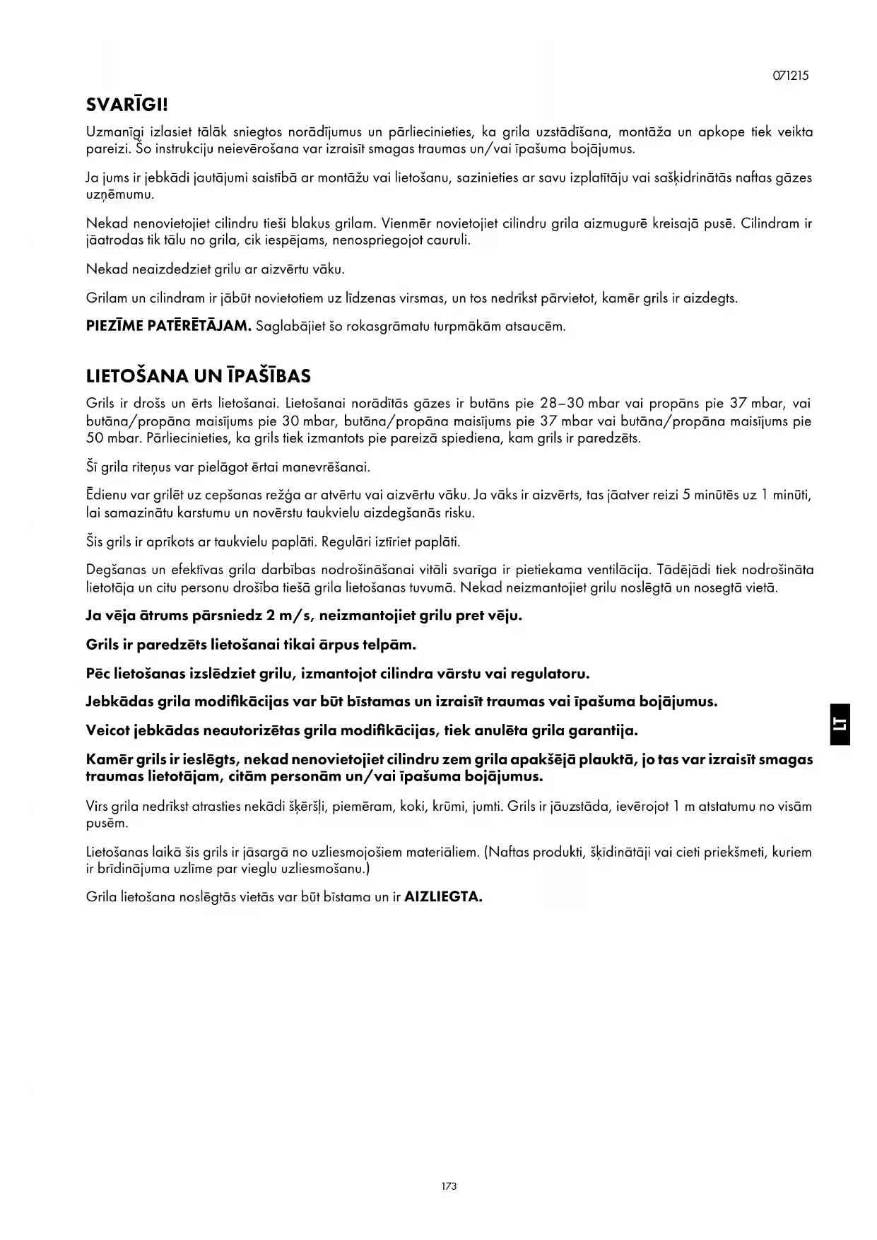 Grils ir drošs un ērts lietošanai. Lietošanai norādītās gāzes ir butāns pie 28–30mbar vai propāns pie 37mbar, vai butāna/propāna maisījums pie 30mbar, butāna/propāna maisījums pie 37mbar vai butāna/propāna maisījums pie 50mbar. Pārliecinieties, ka grils tiek izmantots pie pareizā spiediena, kam grils ir paredzēts. Šī grila riteņus var pielāgot ērtai manevrēšanai. Ēdienu var grilēt uz cepšanas režģa ar atvērtu vai aizvērtu vāku. Ja vāks ir aizvērts, tas jāatver reizi 5minūtēs uz 1minūti, lai samazinātu karstumu un novērstu taukvielu aizdegšanās risku. Šis grils ir aprīkots ar taukvielu paplāti. Regulāri iztīriet paplāti. Degšanas un efektīvas grila darbības nodrošināšanai vitāli svarīga ir pietiekama ventilācija. Tādējādi tiek nodrošināta lietotāja un citu personu drošība tiešā grila lietošanas tuvumā. Nekad neizmantojiet grilu noslēgtā un nosegtā vietā. Ja vēja ātrums pārsniedz 2m/s, neizmantojiet grilu pret vēju. Grils ir paredzēts lietošanai tikai ārpus telpām. Pēc lietošanas izslēdziet grilu, izmantojot cilindra vārstu vai regulatoru. Jebkādas grila modifikācijas var būt bīstamas un izraisīt traumas vai īpašuma bojājumus. Veicot jebkādas neautorizētas grila modifikācijas, tiek anulēta grila garantija. Kamēr grils ir ieslēgts, nekad nenovietojiet cilindru zem grila apakšējā plauktā, jo tas var izraisīt smagas traumas lietotājam, citām personām un/vai īpašuma bojājumus. Virs grila nedrīkst atrasties nekādi šķēršļi, piemēram, koki, krūmi, jumti. Grils ir jāuzstāda, ievērojot 1m atstatumu no visām pusēm. Lietošanas laikā šis grils ir jāsargā no uzliesmojošiem materiāliem. (Naftas produkti, šķīdinātāji vai cieti priekšmeti, kuriem ir brīdinājuma uzlīme par vieglu uzliesmošanu.) Grila lietošana noslēgtās vietās var būt bīstama un ir AIZLIEGTA. LT174