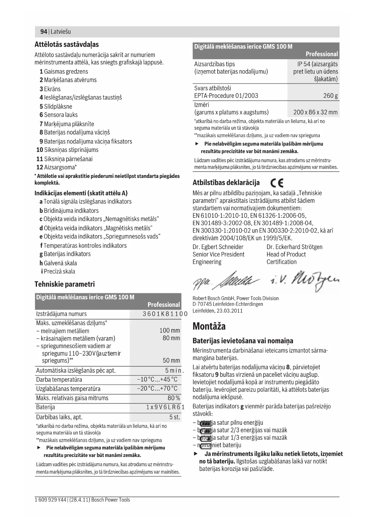 - Attēlotie vai aprakstītie piederumi neietilpst standarta piegādes komplektā. Indikācijas elementi (skatīt attēlu A) a Tonālā signāla izslēgšanas indikators b Brīdinājuma indikators c Objekta veida indikators „Nemagnētisks metāls“ d Objekta veida indikators „Magnētisks metāls“ e Objekta veida indikators „Spriegumnesošs vads“ f Temperatūras kontroles indikators g Baterijas indikators h Galvenā skala i Precīzā skala Tehniskie parametri Atbilstības deklarācija Mēs ar pilnu atbildību paziņojam, ka sadaļā „Tehniskie parametri“ aprakstītais izstrādājums atbilst šādiem standartiem vai normatīvajiem dokumentiem: EN 61010-1:2010-10, EN 61326-1:2006-05, EN 301489-3:2002-08, EN 301489-1:2008-04, EN 300330-1:2010-02 un EN 300330-2:2010-02, kā arī direktīvām 2004/108/EK un 1999/5/EK. Robert Bosch GmbH, Power Tools Division D-70745 Leinfelden-Echterdingen Leinfelden, 23.03.2011 Montāža Baterijas ievietošana vai nomaiņa Mērinstrumenta darbināšanai ieteicams izmantot sārma- mangāna baterijas. Lai atvērtu baterijas nodalījuma vāciņu 8, pārvietojiet fiksatoru 9 bultas virzienā un paceliet vāciņu augšup. Ievietojiet nodalījumā kopā ar instrumentu piegādāto bateriju. Ievērojiet pareizu polaritāti, kā attēlots baterijas nodalījuma iekšpusē. Baterijas indikators g vienmēr parāda baterijas pašreizējo stāvokli: – baterija satur pilnu enerģiju – baterija satur 2/3 enerģijas vai mazāk – baterija satur 1/3 enerģijas vai mazāk – nomainiet bateriju f Ja mērinstruments ilgāku laiku netiek lietots, izņemiet no tā bateriju. Ilgstošas uzglabāšanas laikā var notikt baterijas korozija vai pašizlāde. Digitālā meklēšanas ierīce GMS 100 M Professional Izstrādājuma numurs 3601K81100 Maks. uzmeklēšanas dziļums* – melnajiem metāliem – krāsainajiem metāliem (varam) – spriegumnesošiem vadiem ar spriegumu 110–230 V (ja uz tiem ir spriegums)** 100 mm 80 mm 50 mm Automātiska izslēgšanās pēc apt. 5min. Darba temperatūra –10 °C...+45 °C Uzglabāšanas temperatūra –20 °C...+70 °C Maks. relatīvais gaisa mitrums 80 % Baterija 1x9V6LR61 Darbības laiks, apt. 5st. *atkarībā no darba režīma, objekta materiāla un lieluma, kā arī no seguma materiāla un tā stāvokļa**mazākais uzmeklēšanas dziļums, ja uz vadiem nav spriegumaf Pie nelabvēlīgām seguma materiāla īpašībām mērījumu rezultātu precizitāte var būt manāmi zemāka.Lūdzam vadīties pēc izstrādājuma numura, kas atrodams uz mērinstru-menta marķējuma plāksnītes, jo tā tirdzniecības apzīmējums var mainīties. Aizsardzības tips (izņemot baterijas nodalījumu) IP 54 (aizsargāts pret lietu un ūdens šļakatām) Svars atbilstoši EPTA-Procedure 01/2003 260 g Izmēri (garums x platums x augstums) 200 x 86 x 32 mm Dr. Egbert Schneider Senior Vice President Engineering Dr. Eckerhard Strötgen Head of Product Certification Digitālā meklēšanas ierīce GMS 100 M Professional *atkarībā no darba režīma, objekta materiāla un lieluma, kā arī no seguma materiāla un tā stāvokļa**mazākais uzmeklēšanas dziļums, ja uz vadiem nav spriegumaf Pie nelabvēlīgām seguma materiāla īpašībām mērījumu rezultātu precizitāte var būt manāmi zemāka.Lūdzam vadīties pēc izstrādājuma numura, kas atrodams uz mērinstru-menta marķējuma plāksnītes, jo tā tirdzniecības apzīmējums var mainīties. OBJ_BUCH-1418-001.book Page 94 Thursday, April 28, 2011 9:54 AMLatviešu | 95 Bosch Power Tools 1 609 929 Y44 | (28.4.11) Lietošana f Sargājiet mērinstrumentu no mitruma un saules staru tiešas iedarbības. f Nepakļaujiet instrumentu ļoti augstas vai ļoti zemas temperatūras iedarbībai un stiprām temperatūras izmaiņām. Stipru temperatūras izmaiņu gadījumā pirms mērinstrumenta ieslēgšanas nogaidiet, līdz izlīdzinās temperatūra. Ekstremālu temperatūras vērtību vai stipru temperatūras izmaiņu iedarbība uz mērinstrumentu var nelabvēlīgi ietekmēt tā precizitāti un displeja rādījumus. f Mērinstrumenta lietošana radioraidošo iekārtu, pie- mēram, bezvadu datortīklu, UMTS, aviācijas radaru, raidītāju torņu vai mikroviļņu iekārtu tuvumā var nelabvēlīgi ietekmēt tā funkcionēšanu. Uzsākot lietošanu Ieslēgšana un izslēgšana f Pirms mērinstrumenta ieslēgšanas pārliecinieties, ka tā sensora lauks 6 nav mitrs. Ja izrādās, ka tā ir, apslaukiet mērinstrumentu ar auduma gabaliņu, līdz tas kļūst sauss. f Ja mērinstruments ir ticis pakļauts stiprām temperatūras izmaiņām, pirms ieslēgšanas nogaidiet, līdz temperatūra izlīdzinās. Lai ieslēgtu mērinstrumentu, nospiediet tā ieslēgšanas/iz- slēgšanas taustiņu 4. Lai izslēgtu mērinstrumentu, vēlreiz nospiediet tā ieslēgša- nas/izslēgšanas taustiņu 4. Ja aptuveni 5 minūtes netiek nospiests neviens no mērinstru- menta taustiņiem un netiek atklāts neviens objekts, mērin- struments automātiski izslēdzas, šādi taupot baterijas. Tonālā signāla ieslēgšana un izslēgšana Tonālo signālu var ieslēgt un izslēgt, šim nolūkam dažas sekundes ilgi turot nospiestu ieslēgšanas/izslēgšanas taustiņu 4 laikā, kad mērinstruments ir ieslēgts. Ja tonālais signāls ir izslēgts, uz displeja parādās indikators a. Funkcionēšana (attēli A– B) Ar mērinstrumenta palīdzību tiek pārbaudīts seguma materiāls zem tā sensora lauka 6 virzienā z līdz maksimālajam uzmeklēšanas dziļumam (skatīt sadaļu „Tehniskie parametri“). Tiek uzmeklēti objekti, kuru īpašības atšķiras no sienas materiāla īpašībām. Vienmēr pārvietojiet mērinstrumentu pāri seguma materiālam taisnā virzienā ar nelielu spiedienu, to nepaceļot un neizmainot spiedienu uz to. Mērīšanas laikā slīdplāksnei 5 nepārtraukti jāsaskaras ar seguma materiāla virsmu. Mērīšana Pēc mērinstrumenta ieslēgšanas gaismas gredzens 1 tiek izgaismots zaļā krāsā. Novietojiet m