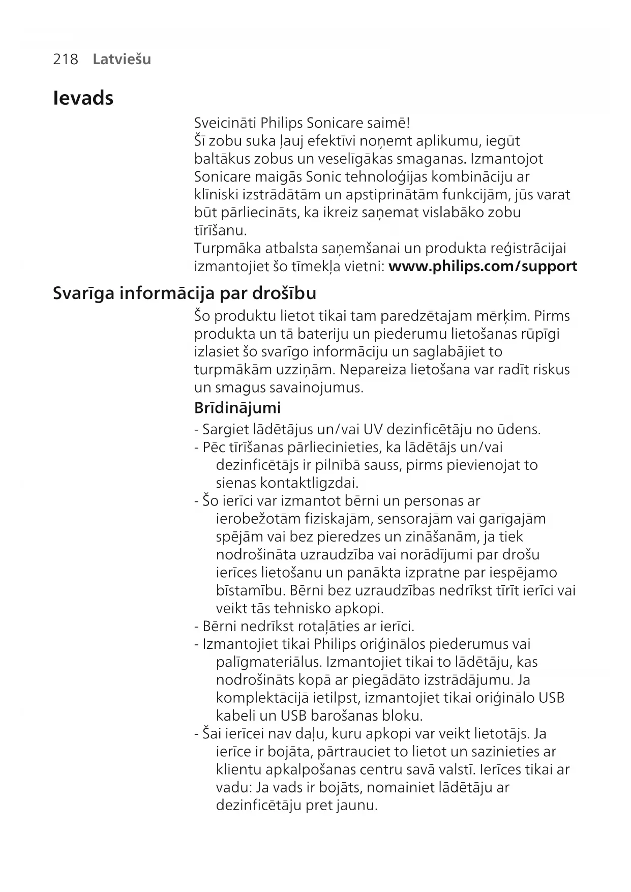 Latviešu Ievads Sveicināti Philips Sonicare saimē! Šī zobu suka ļauj efektīvi noņemt aplikumu, iegūt baltākus zobus un veselīgākas smaganas. Izmantojot Sonicare maigās Sonic tehnoloģijas kombināciju ar klīniski izstrādātām un apstiprinātām funkcijām, jūs varat būt pārliecināts, ka ikreiz saņemat vislabāko zobu tīrīšanu. Turpmāka atbalsta saņemšanai un produkta reģistrācijai izmantojiet šo tīmekļa vietni: www.philips.com/support Svarīga informācija par drošību Šo produktu lietot tikai tam paredzētajam mērķim. Pirms produkta un tā bateriju un piederumu lietošanas rūpīgi izlasiet šo svarīgo informāciju un saglabājiet to turpmākām uzziņām. Nepareiza lietošana var radīt riskus un smagus savainojumus. Brīdinājumi - Sargiet lādētājus un/vai UV dezinficētāju no ūdens. - Pēc tīrīšanas pārliecinieties, ka lādētājs un/vai dezinficētājs ir pilnībā sauss, pirms pievienojat to sienas kontaktligzdai. - Šo ierīci var izmantot bērni un personas ar ierobežotām fiziskajām, sensorajām vai garīgajām spējām vai bez pieredzes un zināšanām, ja tiek nodrošināta uzraudzība vai norādījumi par drošu ierīces lietošanu un panākta izpratne par iespējamo bīstamību. Bērni bez uzraudzības nedrīkst tīrīt ierīci vai veikt tās tehnisko apkopi. - Bērni nedrīkst rotaļāties ar ierīci. - Izmantojiet tikai Philips oriģinālos piederumus vai palīgmateriālus. Izmantojiet tikai to lādētāju, kas nodrošināts kopā ar piegādāto izstrādājumu. Ja komplektācijā ietilpst, izmantojiet tikai oriģinālo USB kabeli un USB barošanas bloku. - Šai ierīcei nav daļu, kuru apkopi var veikt lietotājs. Ja ierīce ir bojāta, pārtrauciet to lietot un sazinieties ar klientu apkalpošanas centru savā valstī. Ierīces tikai ar vadu: Ja vads ir bojāts, nomainiet lādētāju ar dezinficētāju pret jaunu.219 Latviešu - Neizmantojiet lādētāju un/vai dezinficētāju ārpus telpām vai karstu virsmu tuvumā. - Nemazgājiet nevienu izstrādājuma daļu trauku mazgājamajā mašīnā. - Šī ierīce ir paredzēta tikai zobu, smaganu un mēles tīrīšanai. - Dezinficētāju vienmēr glabājiet bērniem nepieejamā vietā. - Nelietojiet dezinficētāju, ja UVgaismas spuldze nenodziest vai vāks ir atvērts. UV gaisma var bojāt cilvēka acis un ādu. - Dezinficētāju izmantojiet tikai tad, ja ir uzstādīts aizsargekrāns. - Nepieskarieties dezinficētāja UV gaismas spuldzei, kamēr tā ir karsta. - Pārtrauciet lietot sukas uzgali, ja tās sari ir saspiesti vai saliekti. Nomainiet sukas uzgali ik pēc 3mēnešiem vai agrāk, ja tam ir redzamas nolietojuma pazīmes. - Nepieļaujiet tiešu saskari ar izstrādājumiem, kas satur ēteriskās eļļas vai kokosriekstu eļļu. Saskare ar eļļu var sekmēt sariņu izkrišanu. - Pārtrauciet ierīces lietošanu un konsultējieties ar savu zobārstu/ārstu, ja pēc lietošanas rodas pārmērīga asiņošana, ja pēc 1 lietošanas nedēļas turpinās asiņošana vai ja Jums rodas diskomforts vai sāpes. - Ja pēdējo divu mēnešu laikā jums ir bijušas mutes vai smaganu operācijas, pirms šīs ierīces lietošanas konsultējieties ar zobārstu. - Ja jums ir elektrokardiostimulators vai cita implantēta ierīce, pirms lietošanas konsultējieties ar ārstu vai implantētās ierīces ražotāju. - Ja jums radušās medicīniska rakstura šaubas, pirms šīs ierīces lietošanas konsultējieties ar ārstu. - Šī ir personīgās higiēnas ierīce, un tā nav paredzēta lietošanai vairākiem pacientiem zobārstniecības praksē vai iestādē. Bateriju drošības norādījumi - Šajā ierīcē ir baterijas, kuras izņemt drīkst tikai kvalificēts speciālists.220 Latviešu - Šo produktu lietot tikai tam paredzētajam mērķim. Pirms produkta, tā bateriju un piederumu lietošanas rūpīgi izlasiet šo svarīgo informāciju un saglabājiet to turpmākām uzziņām. Nepareiza lietošana var radīt riskus un smagus savainojumus. Komplektā iekļautie piederumi dažādiem produktiem var atšķirties. - Izmantojiet tikai oriģinālos Philips piederumus un patēriņa preces. Izmantojiet tikai noņemamo barošanas bloku TCBxxxx, HX6100, HX6110, HX6160 vai WAAxxxx. - Nenovietojiet produktu un baterijas uguns tuvumā, kā arī nepakļaujiet tos tiešu saules staru vai augstas temperatūras iedarbībai. - Ja produkts pārlieku sakarst vai izdala smaku, maina krāsu vai uzlāde notiek ilgāk nekā parasti, pārtrauciet produkta lietošanu un uzlādi, un sazinieties ar Philips. - Izstrādājumus un to baterijas nedrīkst likt mikroviļņu krāsnīs vai uz indukcijas plītīm. - Neatveriet, nepārveidojiet, necaurduriet, nebojājiet vai neizjauciet izstrādājumu vai bateriju, lai novērstu bateriju sakaršanu vai indīgu vai bīstamu vielu noplūdi. Neizraisiet īsslēgumu, nepārlādējiet baterijas vai neveiciet to atgriezenisku uzlādi. - Šajā iekārtā iekļautas baterijas, kas nav nomaināmas. Kad baterija ir nokalpojusi, atbilstoši atbrīvojieties no ierīces, skatiet sadaļu Pārstrāde. - Ja baterijas ir bojātas vai ja tām radusies noplūde, izvairieties no saskares ar ādu vai acīm. Ja tā tomēr notiek, nekavējoties rūpīgi skalojiet ar ūdeni un vērsieties pēc medicīniskas palīdzības. - Rīkojoties ar baterijām, pārliecinieties, ka gan jūsu rokas, gan arī izstrādājums un baterijas ir sausi. - Lai pēc bateriju izņemšanas tām nerastos īsslēgums, neļaujiet bateriju kontaktiem saskarties ar metāla priekšmetiem (piem., monētām, matu sprādzēm, gredzeniem). Netiniet baterijas alumīnija folijā. Pirms likvidējat, aptiniet bateriju spailes ar līmlentu vai ievietojiet baterijas plastmasas maisiņā. - Uzlādējiet, lietojiet un glabājiet izstrādājumu 0–40°C (32–104°F) temperatūrā.221 Latviešu Uzglabāšanas un pārvadāšanas nosacījumi Temperatūra: no -10°C līdz 60°C. Elektromagnētiskie lauki (EML) Šī Philips ierīce atbilst visi