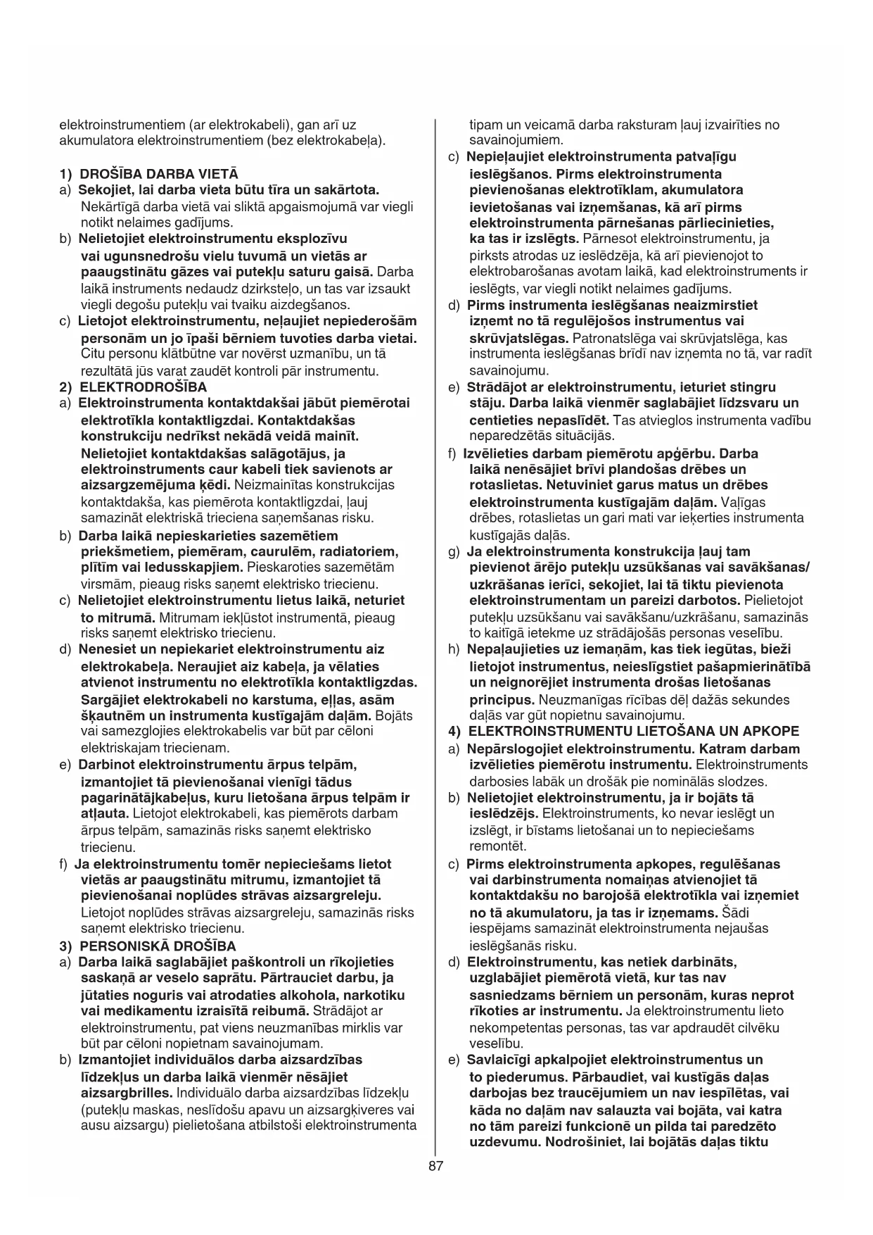 a) Nepārslogojiet elektroinstrumentu. Katram darbam izvēlieties piemērotu instrumentu. Elektroinstruments darbosies labāk un drošāk pie nominālās slodzes. b) Nelietojiet elektroinstrumentu, ja ir bojāts tā ieslēdzējs. Elektroinstruments, ko nevar ieslēgt un izslēgt, ir bīstams lietošanai un to nepieciešams remontēt. c) Pirms elektroinstrumenta apkopes, regulēšanas vai darbinstrumenta nomaiņas atvienojiet tā kontaktdakšu no barojošā elektrotīkla vai izņemiet no tā akumulatoru, ja tas ir izņemams. Šādi iespējams samazināt elektroinstrumenta nejaušas ieslēgšanās risku. d) Elektroinstrumentu, kas netiek darbināts, uzglabājiet piemērotā vietā, kur tas nav sasniedzams bērniem un personām, kuras neprot rīkoties ar instrumentu. Ja elektroinstrumentu lieto nekompetentas personas, tas var apdraudēt cilvēku veselību. e) Savlaicīgi apkalpojiet elektroinstrumentus un to piederumus. Pārbaudiet, vai kustīgās daļas darbojas bez traucējumiem un nav iespīlētas, vai kāda no daļām nav salauzta vai bojāta, vai katra no tām pareizi funkcionē un pilda tai paredzēto uzdevumu. Nodrošiniet, lai bojātās daļas tiktu elektroinstrumentiem (ar elektrokabeli), gan arī uz akumulatora elektroinstrumentiem (bez elektrokabeļa).