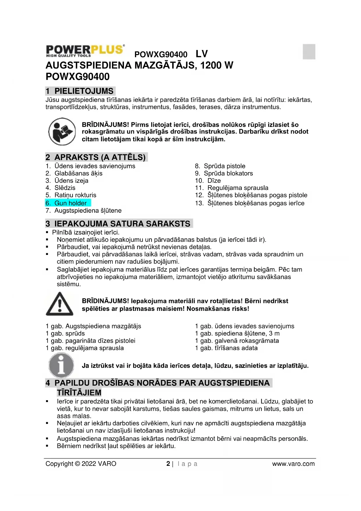 - Bērniem nedrīkst ļaut spēlēties ar iekārtu.POWXG90400 LV Copyright © 2022 VARO 3 | l a p a www.varo.com