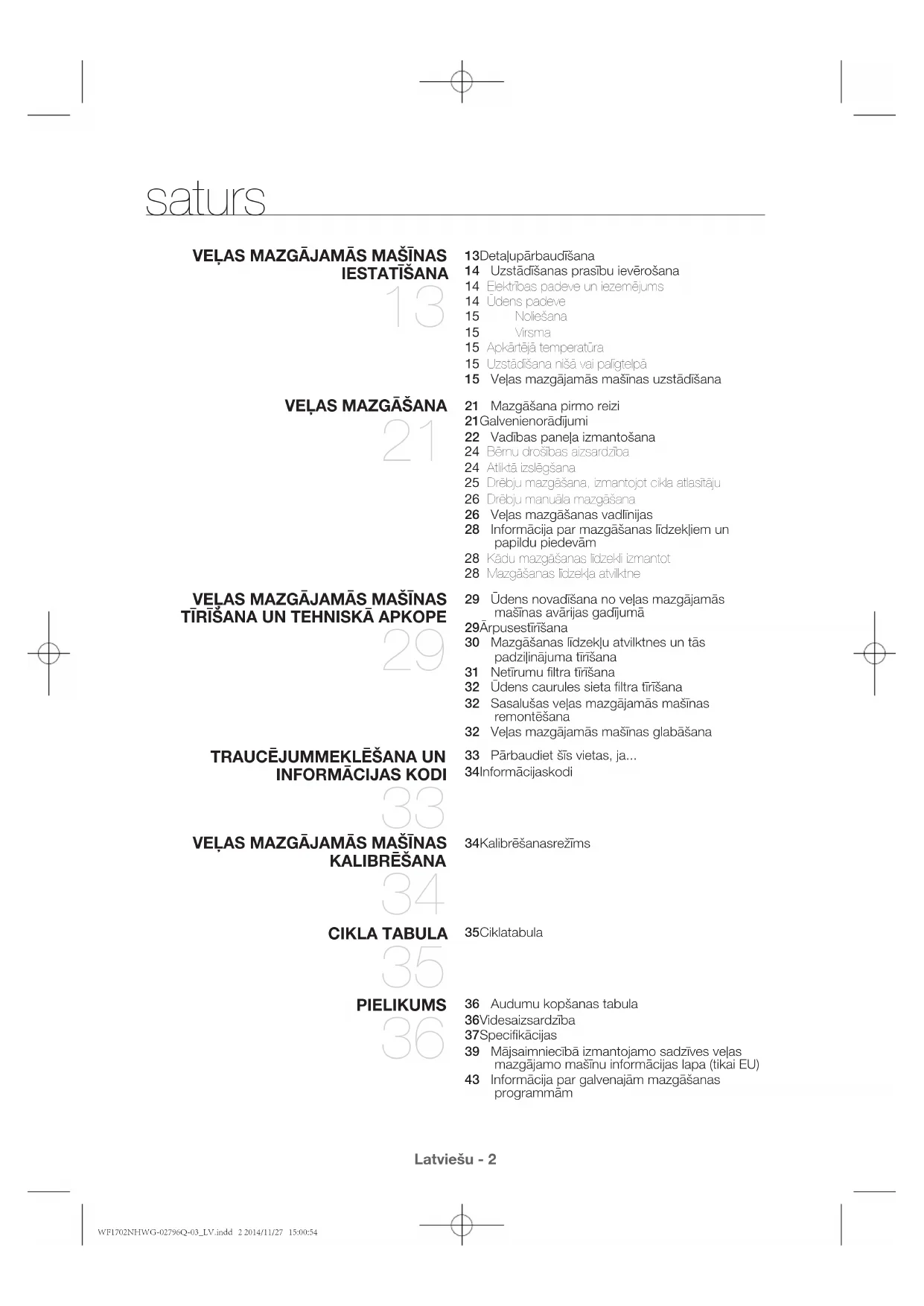 36 Audumu kopšanas tabula 36 Vides aizsardzība 37 Specifikācijas 39 Mājsaimniecībā izmantojamo sadzīves veļas mazgājamo mašīnu informācijas lapa (tikai EU) 43 Informācija par galvenajām mazgāšanas programmām WF1702NHWG-02796Q-03_LV.indd 2 2014/11/27 15:00:54Latviešu - 3 drošības informācija Apsveicam jūs ar jaunās „Samsung ActivFresh™” veļas mazgājamās mašīnas iegādi. Šī rokasgrāmata satur svarīgu informāciju par ierīces uzstādīšanu, lietošanu un apkopi. Iesakām rūpīgi izlasīt šo rokasgrāmatu, lai jūs pilnībā spētu izmantot visas jūsu veļas mazgājamās mašīnas priekšrocības un funkcijas. KAS JUMS JĀZINA PAR DROŠĪBAS PASĀKUMIEM Lai jūs zinātu, kā droši un efektīvi izmantot ierīces plašo funkciju klāstu, rūpīgi izlasiet šo rokasgrāmatu un glabājiet to drošā vietā ierīces tuvumā turpmākajām uzziņām. Izmantojiet ierīci tikai tai paredzētajiem mērķiem, kas aprakstīti šajā rokasgrāmatā. Brīdinājumi un svarīgi norādījumi par drošību, kas minēti šajā rokasgrāmatā, neiekļauj visus iespējamos apstākļus un situācijas. Jūs esat atbildīgs par to, lai uzstādot un lietojot veļas mazgājamo mašīnu, kā arī, veicot tās apkopi, jūs rīkotos atbilstoši, uzmanīgi un ar rūpību. Tālāk sniegtie lietošanas norādījumi attiecas uz dažādiem modeļiem.Jūsu veļas mazgājamās mašīnas tehniskās īpašības var nedaudz atšķirties no šajā rokasgrāmatā sniegtā apraksta, tāpēc ne visi brīdinājumi ir attiecināmi uz jūsu ierīci. Ja jums rodas jautājumi vai bažas, sazinieties ar tuvāko servisa centru vai meklējiet palīdzību un informāciju tiešsaistē vietnē www.samsung.com. SVARĪGI DROŠĪBAS SIMBOLI UN PIESARDZĪBAS PASĀKUMI Ko apzīmē šajā rokasgrāmatā lietotās ikonas un zīmes: BRĪDINĀJUMS! Apdraudējums vai nedroša izmantošana, kas var radīt smagas traumas, izraisīt nāvi un/vai bojāt mantu. UZMANĪBU! Apdraudējums vai nedroša izmantošana, kas var radīt traumas un/vai bojāt mantu. UZMANĪBU! Lai mazinātu ugunsgrēka, eksplozijas, elektrošoka vai traumu draudus veļas mazgājamās mašīnas lietošanas laikā, ievērojiet šādus galvenos piesardzības pasākumus: NEmēģiniet. NEizjauciet. NEaiztieciet. Rūpīgi ievērojiet norādījumus. Atvienojiet strāvas spraudni no kontaktligzdas. Lai novērstu elektrošoka risku, pārliecinieties, vai veļas mazgājamā mašīna ir iezemēta. Piezvaniet uz tehniskās apkopes centru un lūdziet palīdzību. Ņemiet vērā: Šie brīdinājumi ļaus novērst traumu rašanās iespēju ne vien jums, bet arī apkārtējiem. Lūdzam tos ievērot. Pēc šīs sadaļas izlasīšanas glabājiet to drošā vietā turpmākajām uzziņām. Pirms ierīces izmantošanas izlasiet visus norādījumus. Šī ierīce tāpat kā jebkurš cits elektrisks aprīkojums vai ierīce, kurai ir kustīgas detaļas, var radīt potenciālu apdraudējumu. Lai droši lietotu šo ierīci, izlasiet lietošanas noteikumus un vienmēr rīkojieties piesardzīgi. WF1702NHWG-02796Q-03_LV.indd 3 2014/11/27 15:00:54Latviešu - 4 BRĪDINĀJUMS! drošības informācija BRĪDINĀJUMS! Lai samazinātu ugunsgrēka, elektrošoka vai traumas risku cilvēkiem, izmantojot šo ierīci, ievērojiet galvenos drošības pasākumus, tostarp: Neļaujiet bērniem (vai mājdzīvniekiem) spēlēties uz veļas mazgājamās mašīnas vai tās iekšpusē. No veļas mašīnas iekšpuses ir grūti atvērt durtiņas un, ja bērni tajā tiek ieslēgti, viņi var gūt nopietnus ievainojumus. Šo ierīci nedrīkst lietot personas (tostarp bērni) ar fiziskiem, sensoriem vai garīgiem traucējumiem vai personas, kurām ir nepietiekama pieredze vai zināšanas, izņemot gadījumus, ja šādu ierīces izmantošanu uzrauga persona, kas ir atbildīga par šo cilvēku drošību. Nodrošiniet, lai bērni nerotaļātos ar ierīci. Lietošana Eiropā: Šo iekārtu var izmantot bērni vecāki par 8 gadu vecumu un personas ar fiziskiem, maņu vai garīgiem traucējumiem, ar pieredzes vai zināšanu trūkumu, ja viņi ir atbilstoši uzraudzīti vai apmācīti izmantot iekārtu drošā veidā un saprot attiecīgos apdraudējumus. Bērni nedrīkst spēlēties ar iekārtu. Tīrīšanu un lietotāju apkopi nedrīkst veikt bērni bez pieaugušo uzraudzības. Ja ir bojāts barošanas vads, tas jānomaina ražotājam, tā servisa aģentam vai personai ar līdzīgu kvalifikāciju, lai izvairītos no kaitējuma. Šo ierīci novieto tā, lai elektrības kontaktligzda, ūdens padeves krāni un notekcaurules būtu pieejamas. WF1702NHWG-02796Q-03_LV.indd 4 2014/11/27 15:00:54Latviešu - 5 Ierīcēm, kuru pamatnē ir izveidotas ventilācijas atveres, tās nedrīkst aizsegt paklājs. Jāizmanto jaunie cauruļu komplekti, kas piegādāti līdz ar ierīci, bet vecos cauruļu komplektus izmantot nedrīkst. UZMANĪBU: Lai izvairītos no riska, ko rada siltumslēdža neuzmanīga atiestatīšana, šo ierīci nedrīkst pieslēgt barošanai ar ārējās slēgierīces, piemēram, taimera starpniecību vai pievienot ķēdei, kuru regulāri ieslēdz un izslēdz kāda ierīce. WF1702NHWG-02796Q-03_LV.indd 5 2014/11/27 15:00:54Latviešu - 6 ĪPAŠI BRĪDINĀJUMI PAR UZSTĀDĪŠANU Šīs ierīces uzstādīšana jāveic kvalificētam speciālistam vai servisa uzņēmumam. - Šī noteikuma neievērošana var radīt elektrošoku, izraisīt ugunsgrēku, eksploziju, ierīces darbības traucējumus vai radīt traumas. Ierīce ir smaga, tāpēc, to paceļot, ievērojiet piesardzību. Barošanas vadu ieslēdziet 220-240V/50Hz/15A maiņstrāvas sienas kontaktligzdā un izmantojiet šo kontaktligzdu vienīgi šai ierīcei. Neizmantojiet pagarinātājus. - Vairāku ierīču pieslēgšana kontaktligzdai, izmantojot pagarinātāju vai pagarinot barošanas vadu, var radīt elektrošoku vai izraisīt ugunsgrēku. - Pārliecinieties, vai spriegums, frekvence un strāva atbilst izstrādājuma tehniskai specifikācijai. Pretē