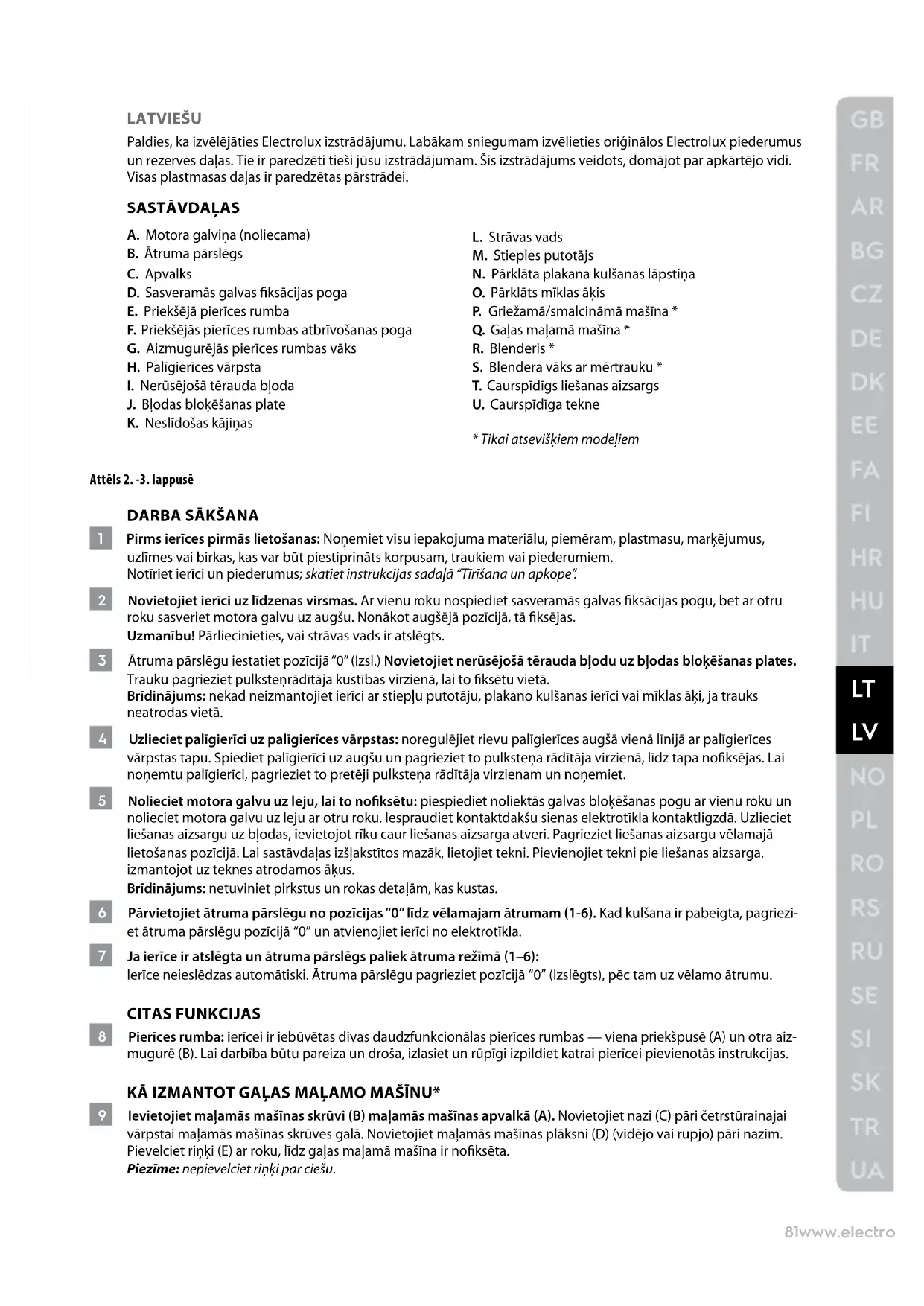 LATVIEŠU Paldies, ka izvēlējāties Electrolux izstrādājumu. Labākam sniegumam izvēlieties oriģinālos Electrolux piederumus un rezerves daļas. Tie ir paredzēti tieši jūsu izstrādājumam. Šis izstrādājums veidots, domājot par apkārtējo vidi. Visas plastmasas daļas ir paredzētas pārstrādei.