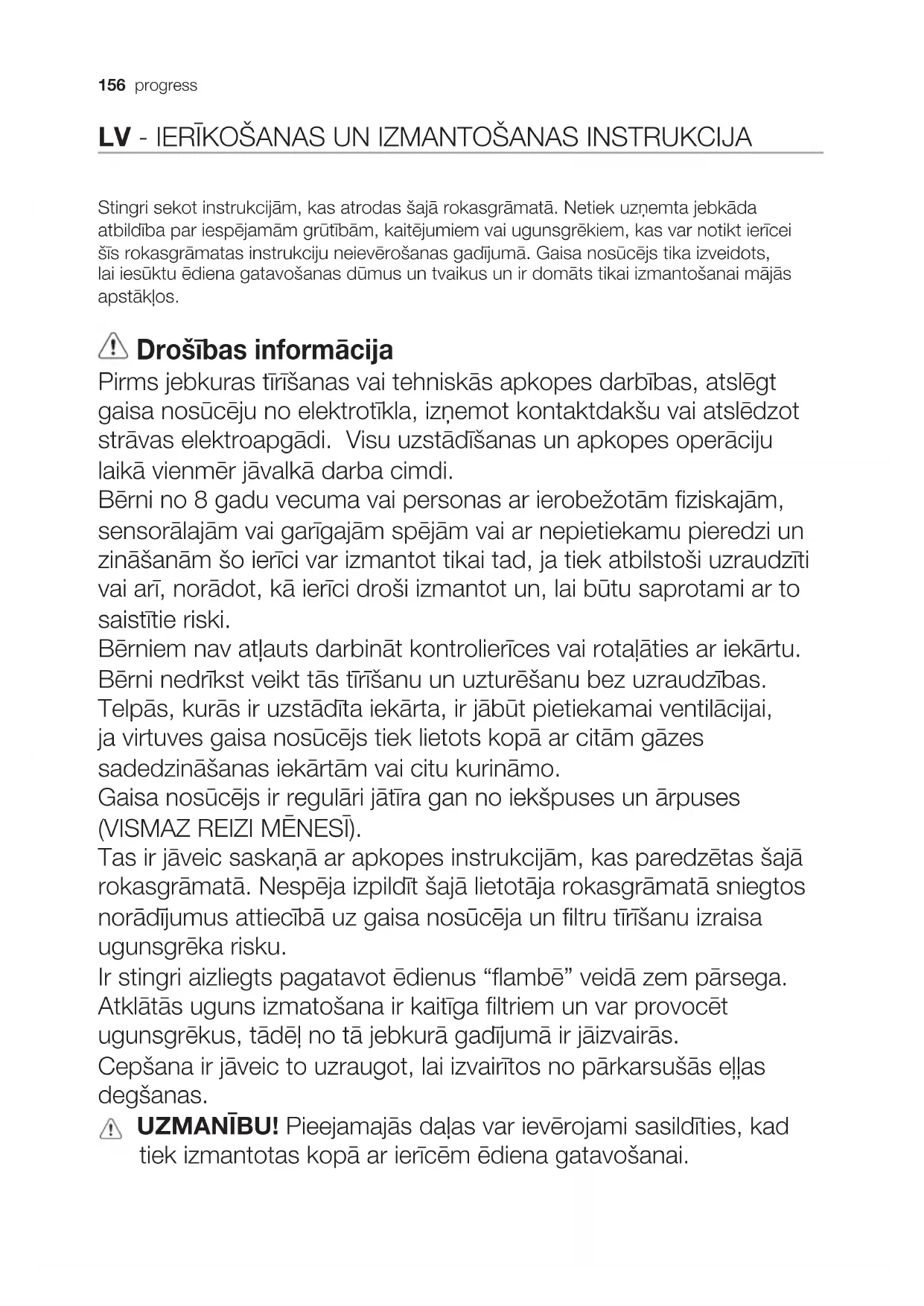Kontroles paneļa Iedarbināšanas – Atslēgšanas funkcija Piespiest taustu T6 ilgāk par 5 sekundēm. Ogles filtra piesātināšanās kontroles Iedarbināšanas – Atslēgšanas funkcija Kad gaisa nosūcējs ir izslēgts, piespiest taustu T7 ilgāk par 5 sekundēm. Tausts T5 mirguļo: 2 reizes, lai norādītu, ka ogles filtra piesātināšanās kontrole tika iedarbināta. 1 reizi, lai norādītu, ka ogles filtra piesātināšanās kontrole tika atslēgta Filtru piesātināšanās kontroles un reset funkcija Ar regulāriem intervāliem, pamatojoties uz gaisa nosūcēja lietošanas laiku, iedegas tausts T5, lai uzrādītu, ka filtriem ir nepieciešams veikt tehnisko apkopi, pamatojoties uz norādījumiem, kas ir uzrādīti attiecīgajos paragrāfos. Tausts T5 deg ar fiksētu gaismu: ir nepieciešams veikt tauku filtra tehnisko apkopi Tausts T5 deg ar mirguļojošu gaismu: ir nepieciešams veikt ogles filtra tehnisko apkopi. Filtru piesātināšanās uzrādītāja reset: Kad gaisa nosūcējs ir izslēgts, ir jāpiespiež tausts T5 ilgāk par 2 sekundēm. Nepieciešamības gadījumā, atkārtot operāciju.160 progress Hob2Hood Gaisa nosūcējs ir aprīkots ar “bezvadu” pievienojuma (wireless) funkciju ar plīti, lai veiktu vispiemērotākā ātruma automātisko regulēšanu. Ir jāpārbauda plīts instrukciju rokasgrāmatā, lai uzzinātu par šīs funkcijas esamību un apvienojamību. Pirmā pievienojuma gadījumā pie elektrības tīkla, vai arī negaidītas elektrības padeves pārtraukšanas gadījumā (blackout), ir jāuzgaida 1 minūte, lai ļautu gaisa nosūcējam atjaunot savienojumu ar plīti. Apgaismojums Gaisa nosūcējs ir aprīkots ar apgaismošanas sistēmu, kas pamatojas uz LED tehnoloģiju. LED nodrošina optimālu apgaismošanu, kas ilgst 10 reizes vairāk par tradicionālajām spuldzītēm un ļauj ietaupīt 90% elektriskās enerģijas. Uzmanību! Neskatīties pa tiešo uz LED gaismām. Lai nomainītu lampiņu, sazinieties ar pilnvarotu rezerves daļu servisa centru.progress 161